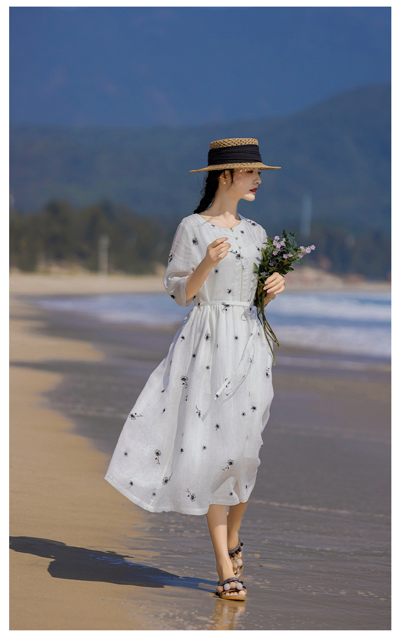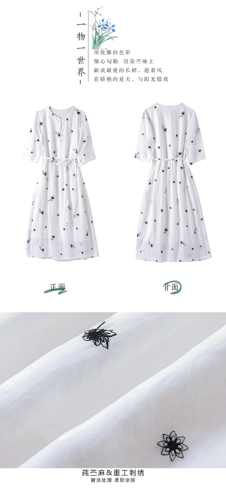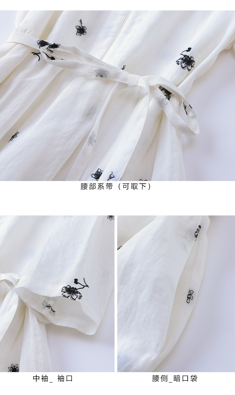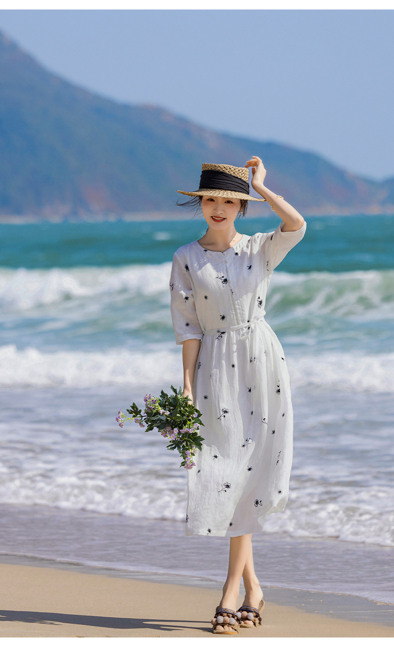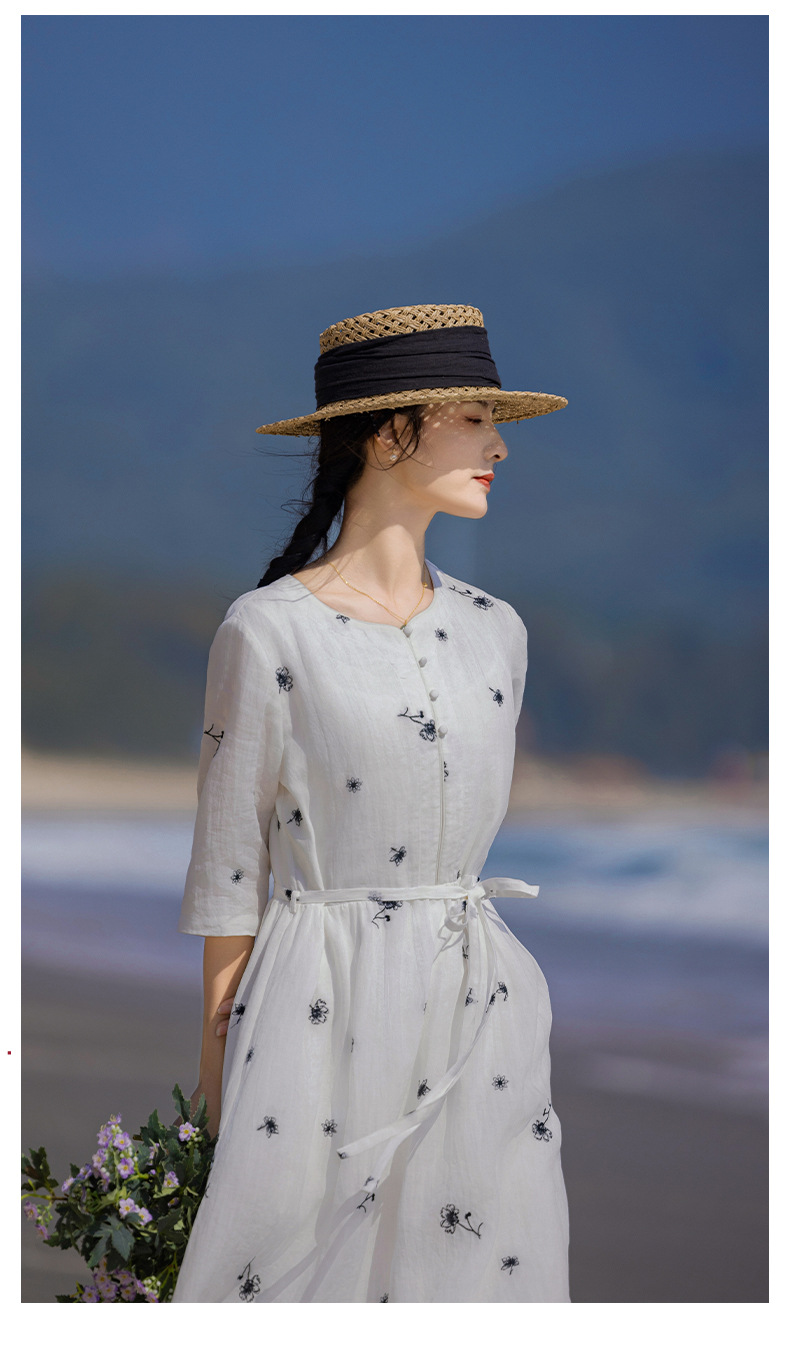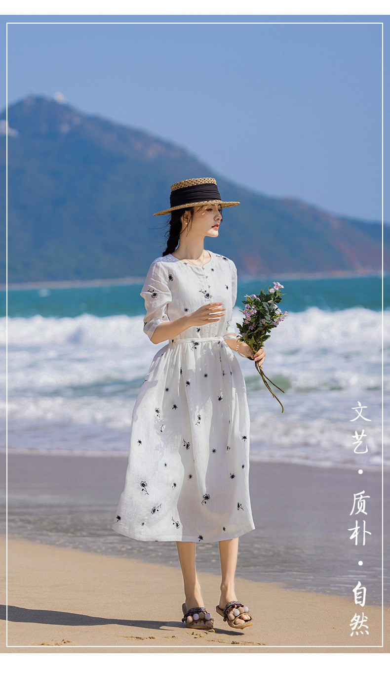 HM-S446白色碎花刺绣连衣裙文艺圆领中袖高腰系带旅行仙气大摆裙春夏新款