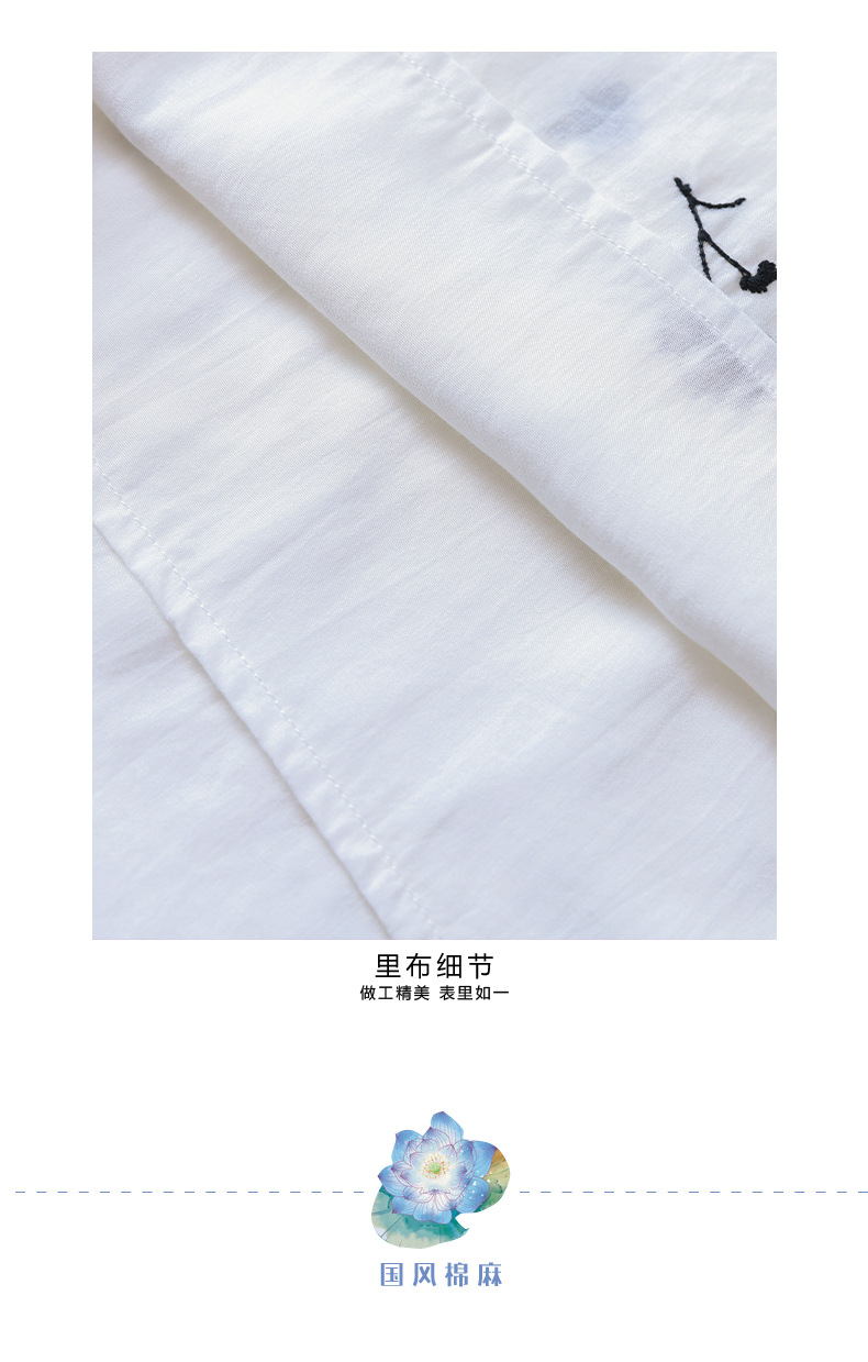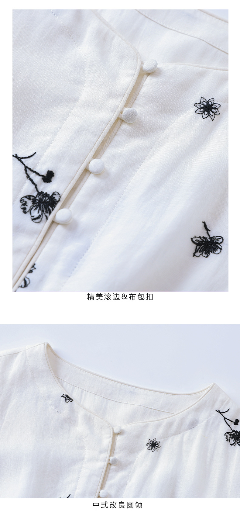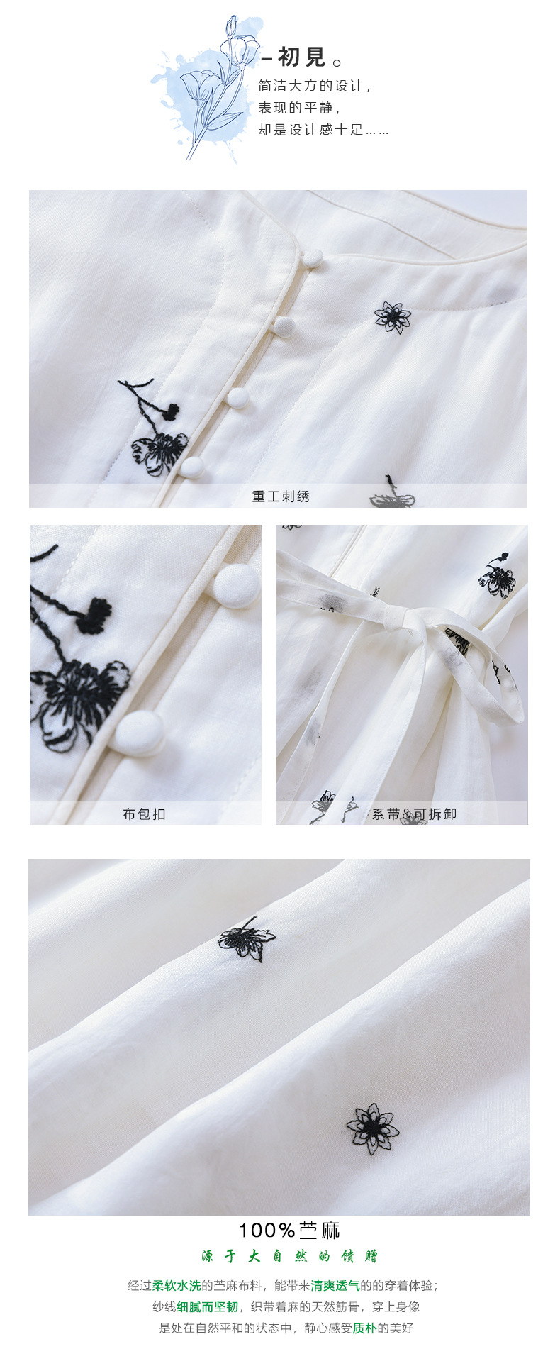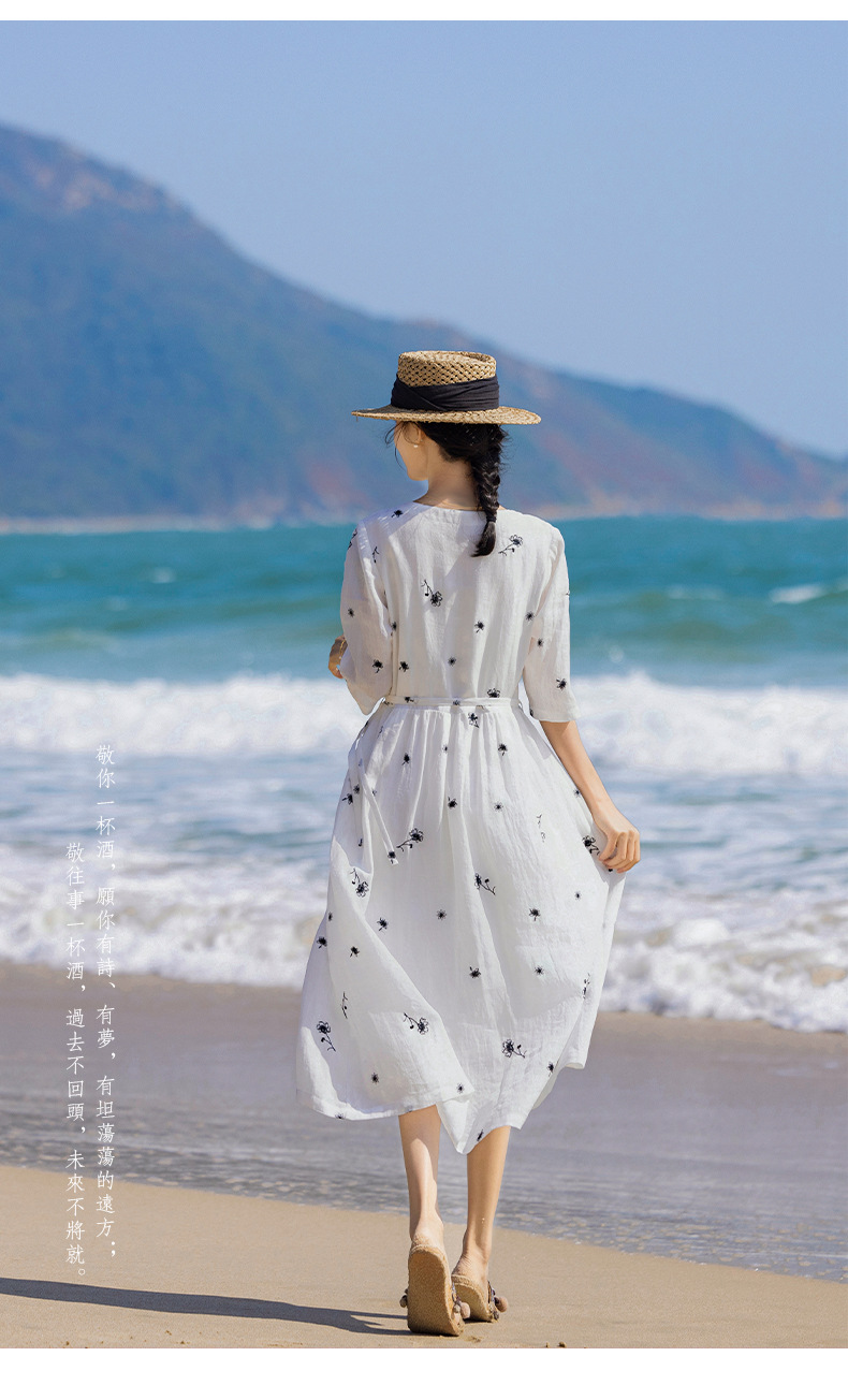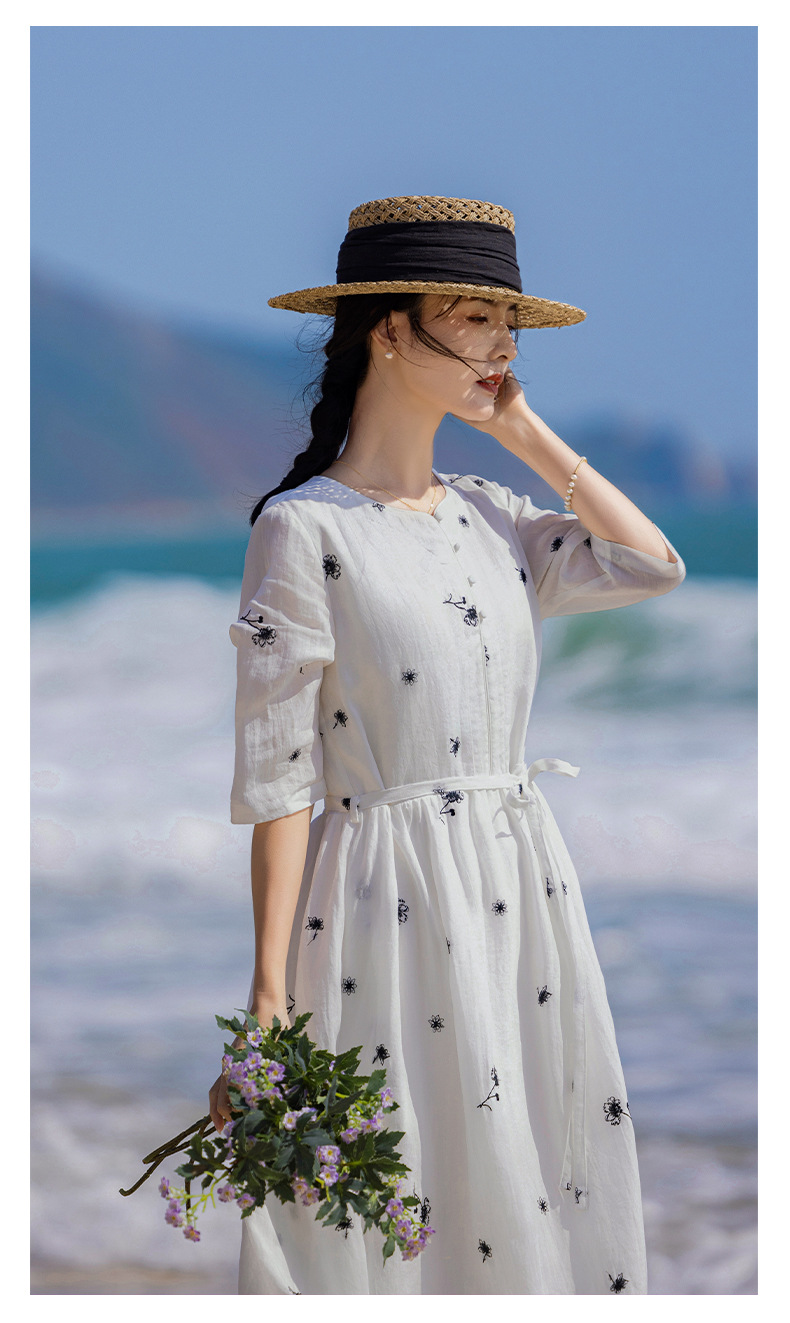 HM-S446白色碎花刺绣连衣裙文艺圆领中袖高腰系带旅行仙气大摆裙春夏新款