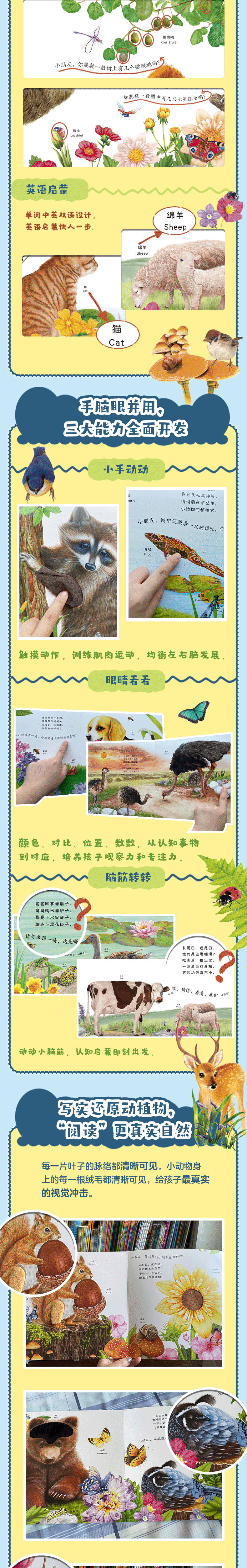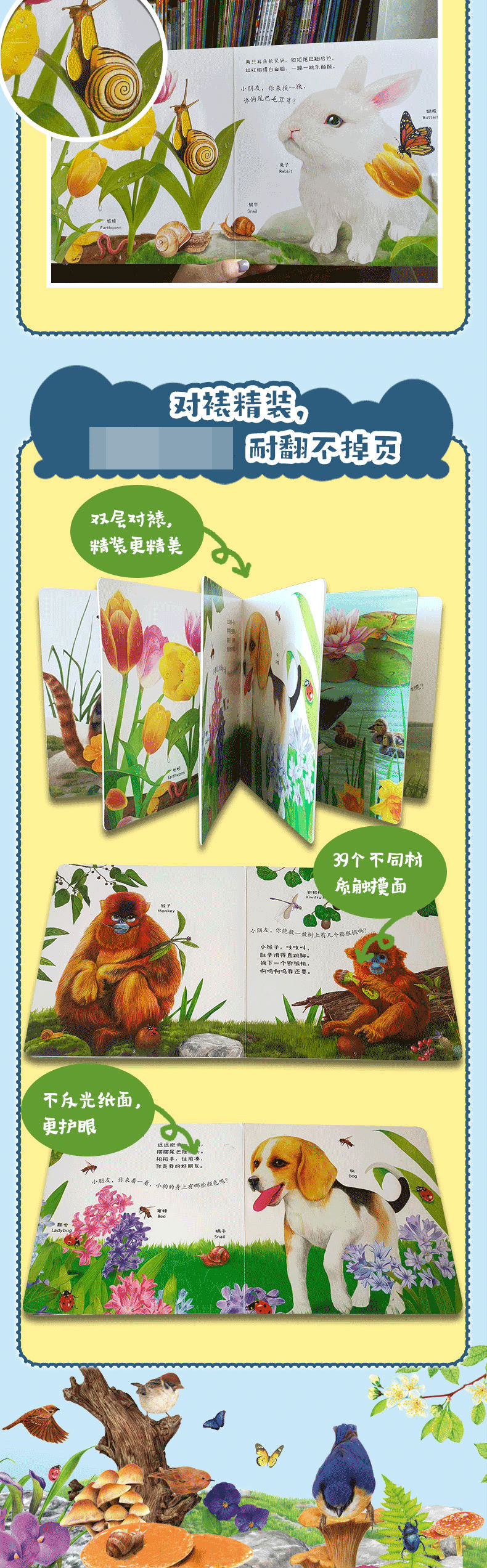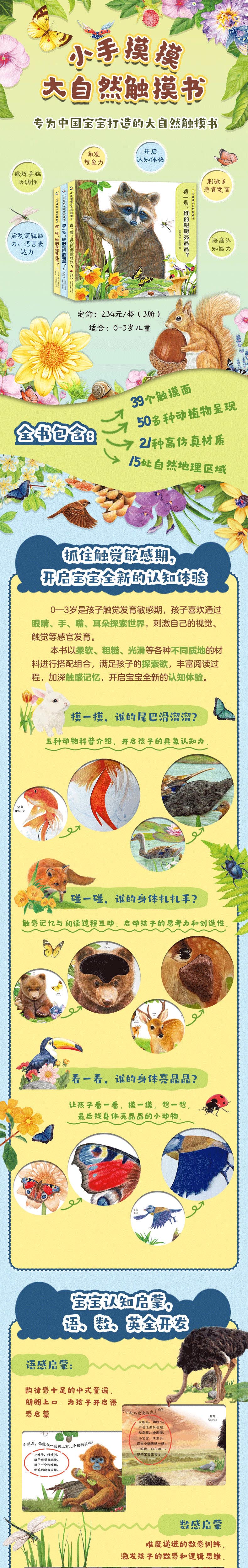 小手摸摸大自然触摸书,这里有生长在蜀南竹海秘境的大熊猫,有大兴安岭原始森林中的小鹿,有热带雨林的巨嘴鸟,也有塞北草原上成群的牛羊……在这里,足不出户也可以把大自然中的花鸟鱼虫、飞禽走兽皆可变成孩子手中可触、可感、可视的“玩具”。40+个触摸面,50+种动植物,20+种仿真材质。摸一摸、看一看、想一想,开启丰富的认知体验,刺激孩子触觉发育,提高孩子认知能力,想象能力,及语言感受力。
