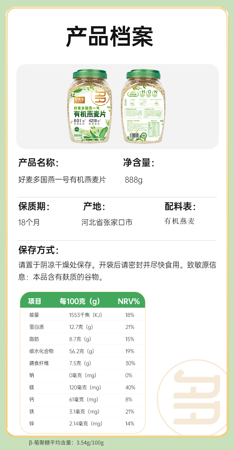 【麦麦SY】好麦多天然有机燕麦片早餐无蔗糖添加即食888g