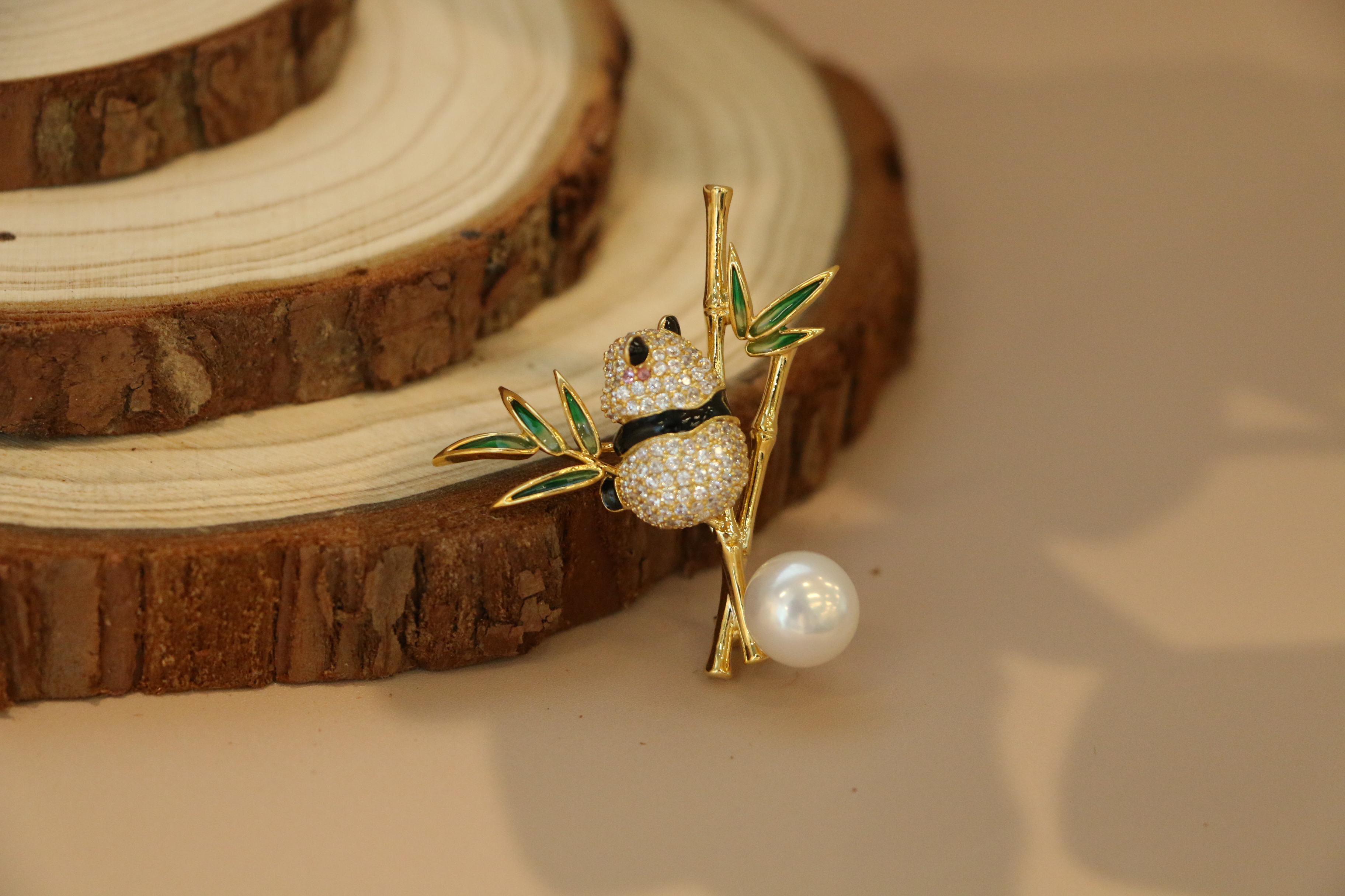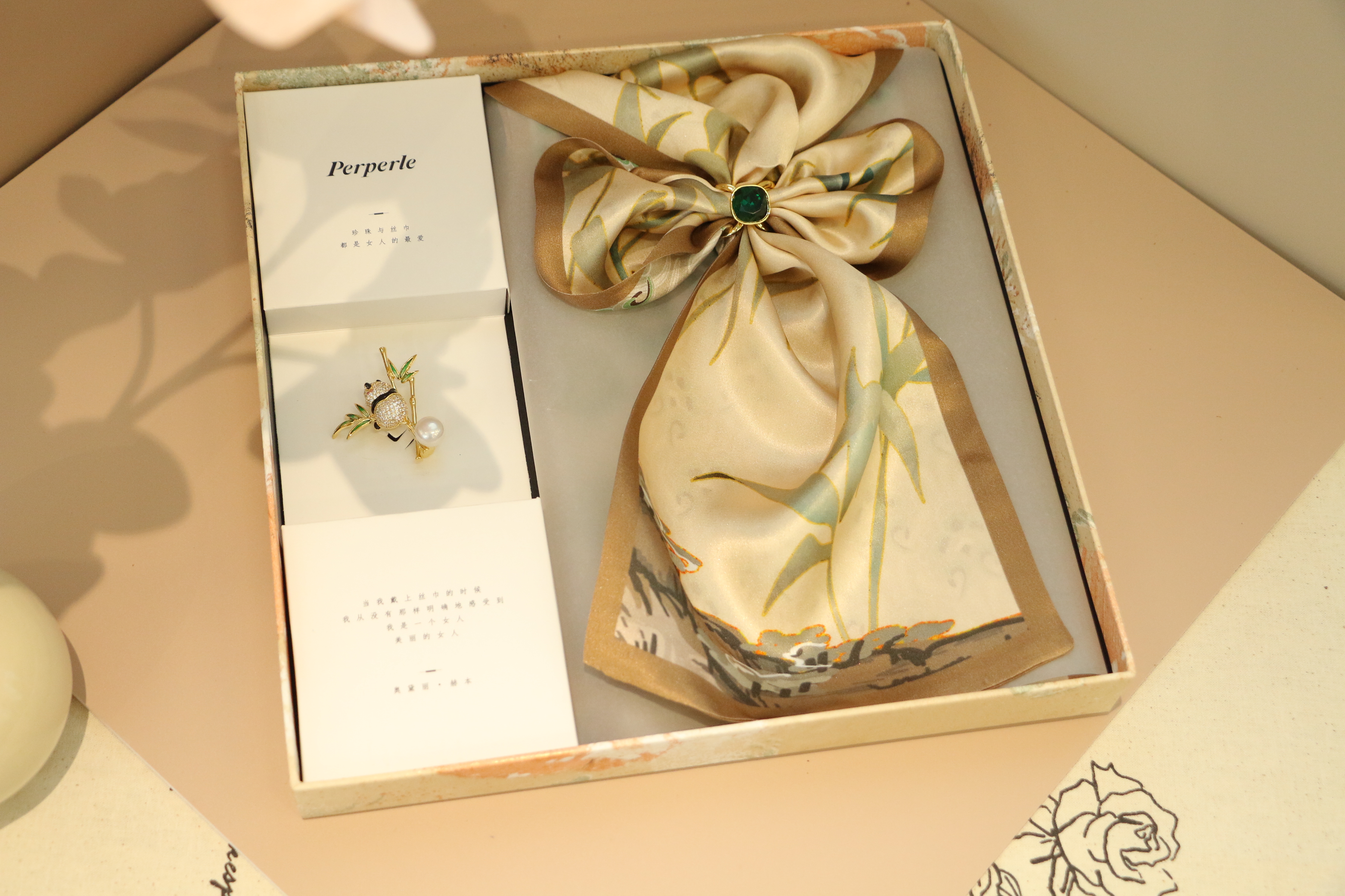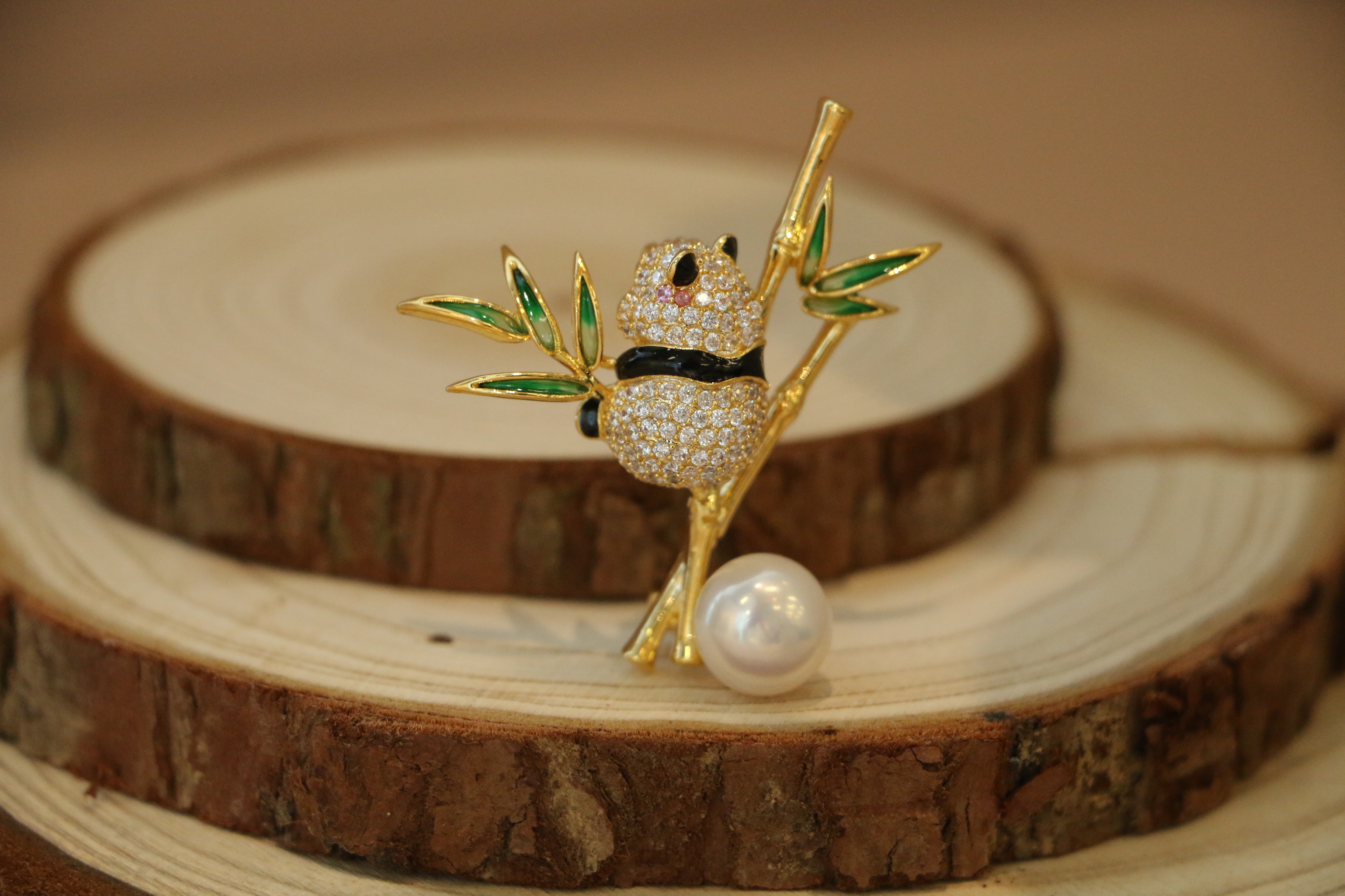 【甄珠贝·国风系列】绿竹双面双色飘带和天然淡水熊猫趴竹胸花礼盒套装【适合送外宾】