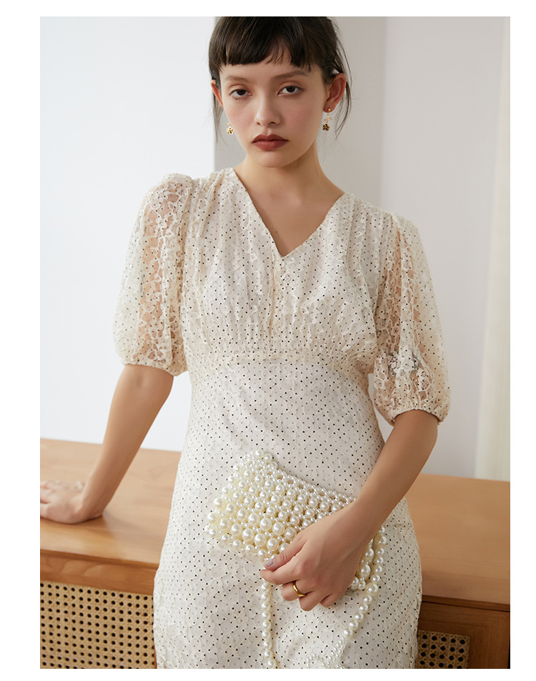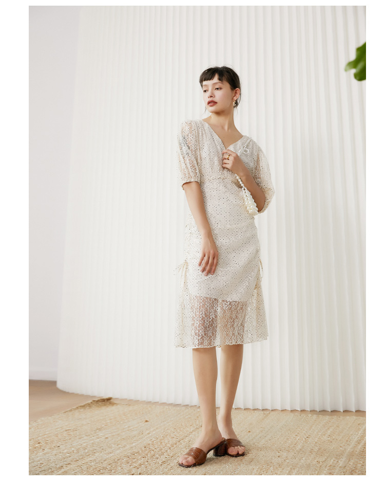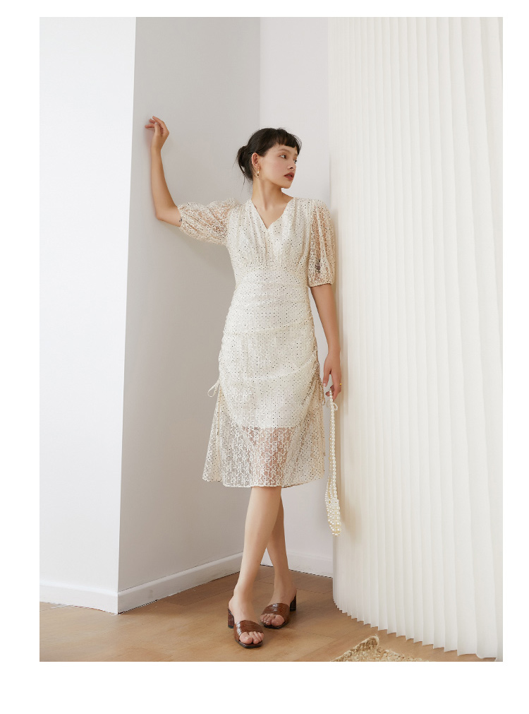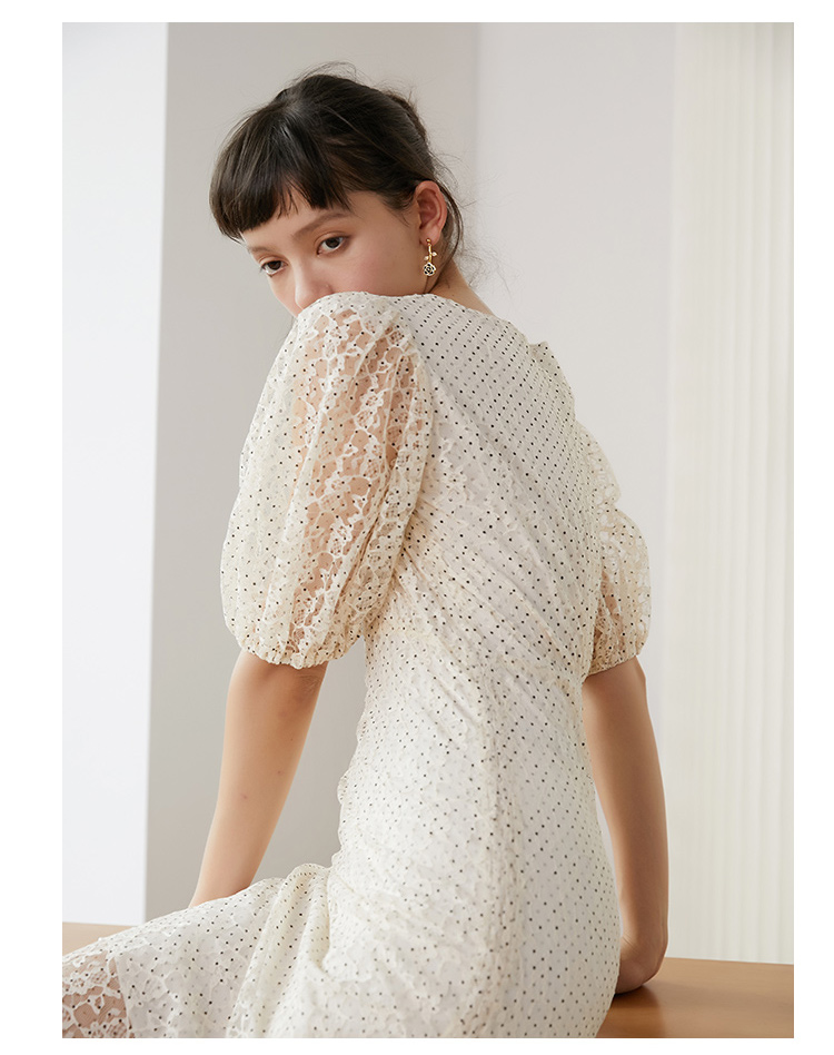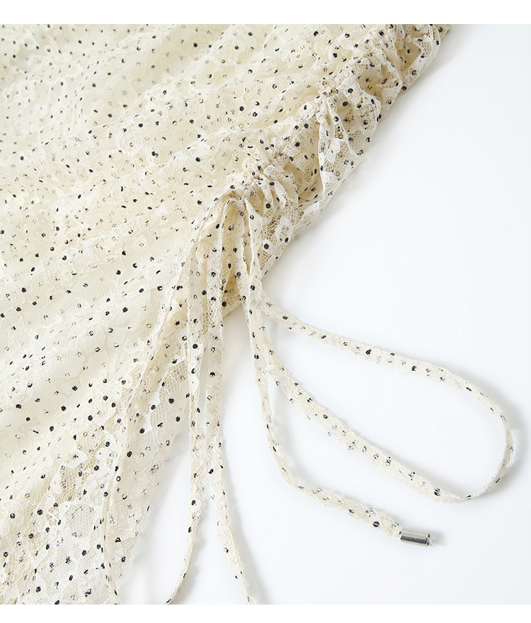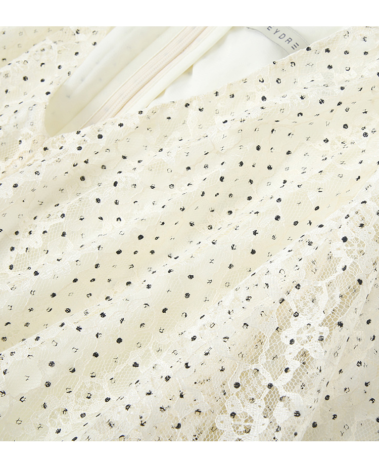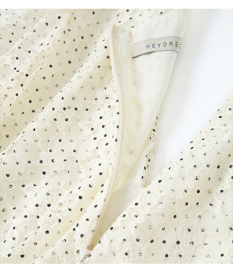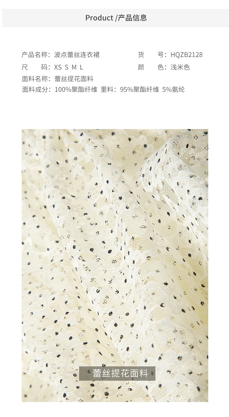 蕾丝提花面料+波点的印花元素 面料既有蕾丝轻薄凉快舒适透气,又融入了波点优雅法式气息, 使得整个裙子更加精致立体,朦胧浪漫感 轻松穿出仙女气质 下摆抽绳设计,可以调节裙长和下摆版型 放下是过膝长度浪漫飘逸,可日常穿着 参加小活动小聚会可左右调节不对称,小鱼尾抽皱的视觉,秒变小礼服 袖子采用泡泡袖的设计,飘逸浪漫,还很遮肉显手臂 |