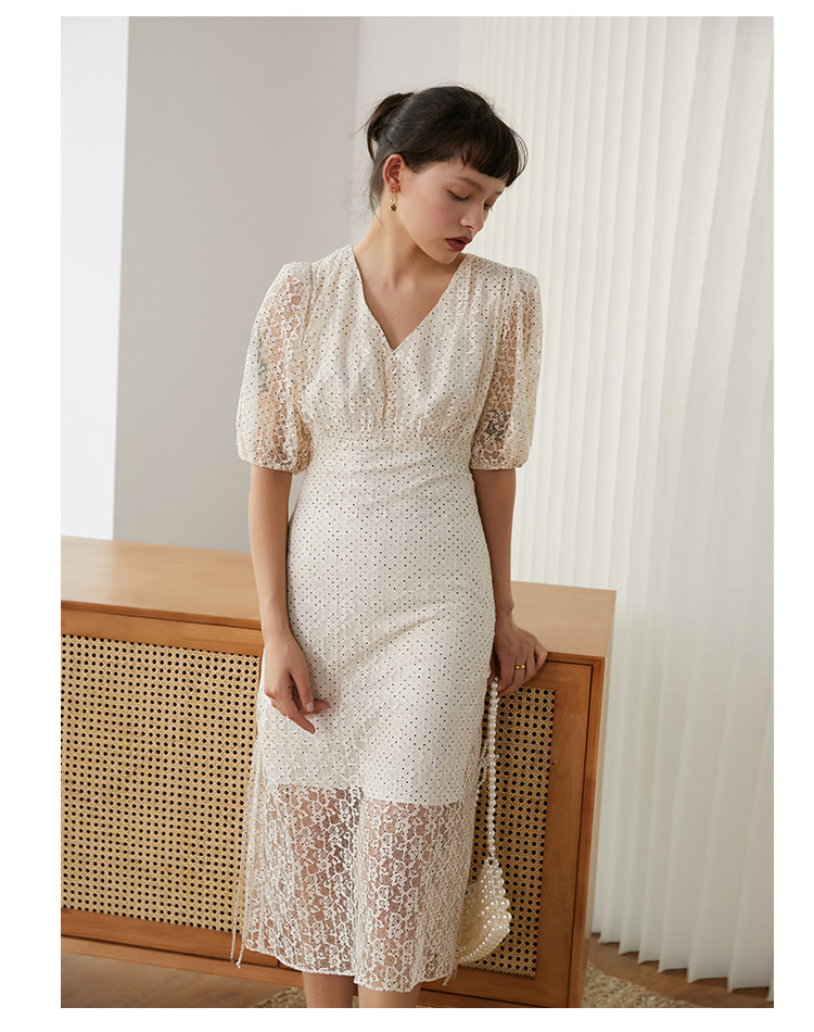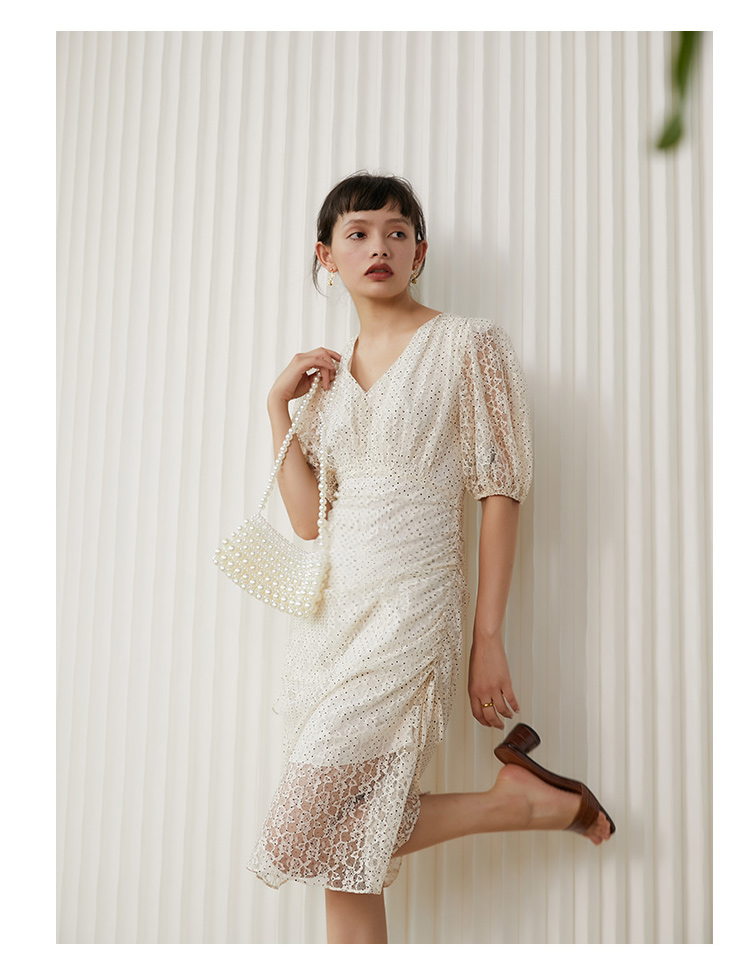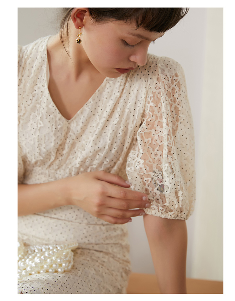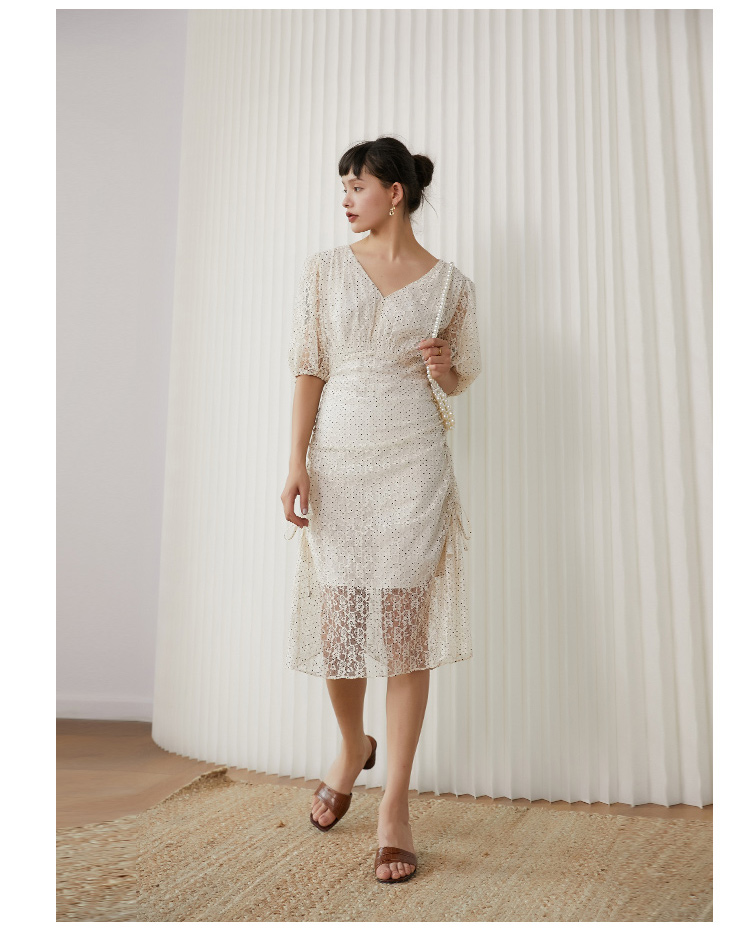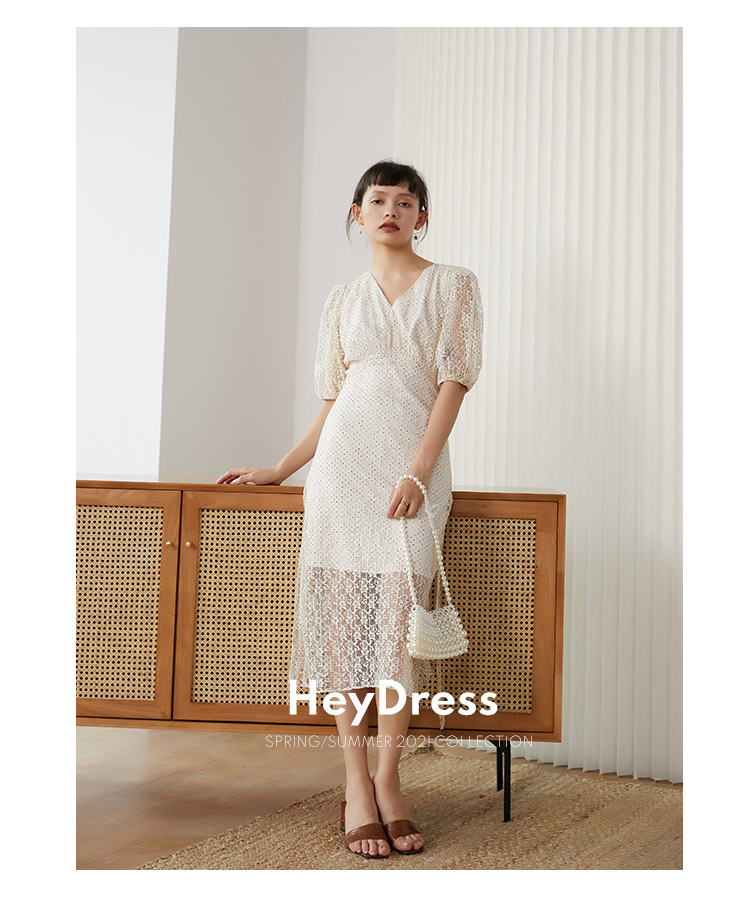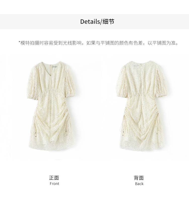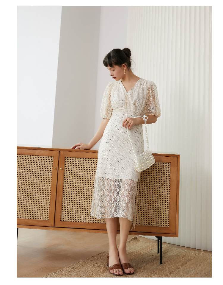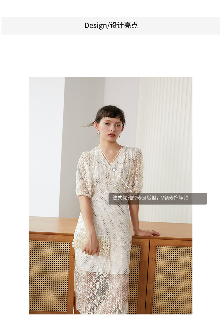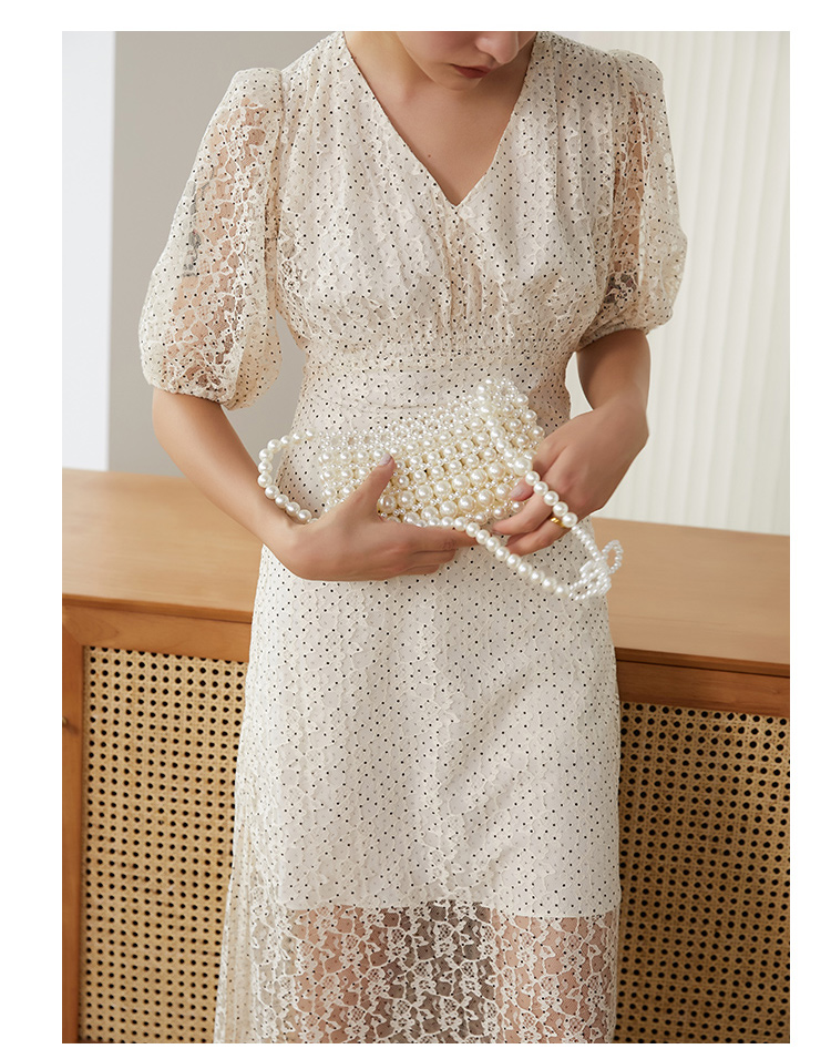 蕾丝提花面料+波点的印花元素 面料既有蕾丝轻薄凉快舒适透气,又融入了波点优雅法式气息, 使得整个裙子更加精致立体,朦胧浪漫感 轻松穿出仙女气质 下摆抽绳设计,可以调节裙长和下摆版型 放下是过膝长度浪漫飘逸,可日常穿着 参加小活动小聚会可左右调节不对称,小鱼尾抽皱的视觉,秒变小礼服 袖子采用泡泡袖的设计,飘逸浪漫,还很遮肉显手臂 |