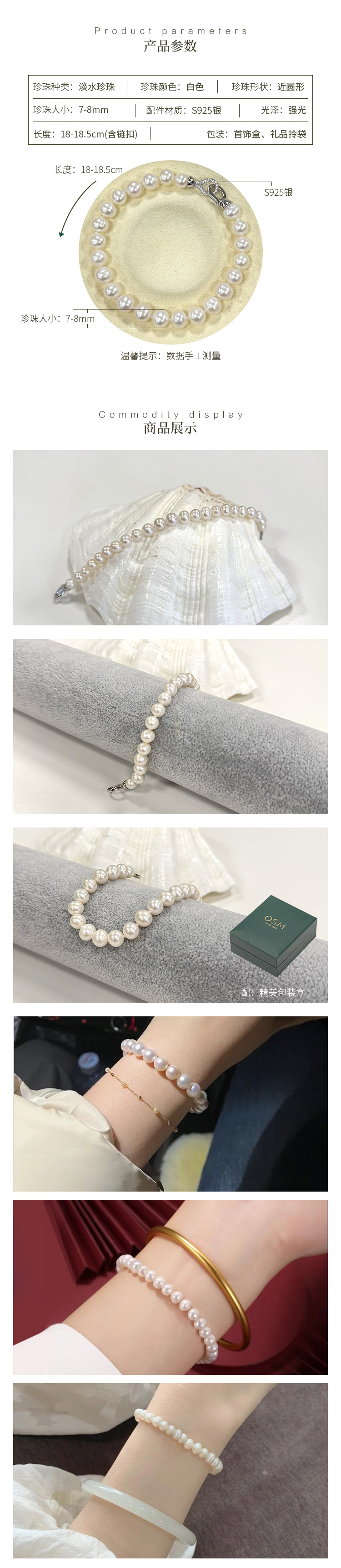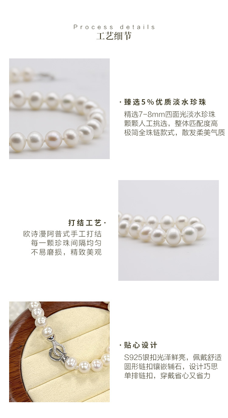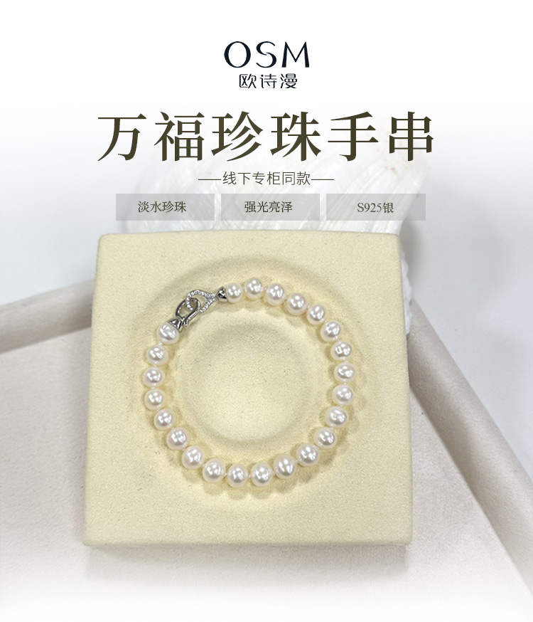 欧诗漫万福珍珠手链7-8mm淡水珍珠强光 925银扣 线下专柜同款