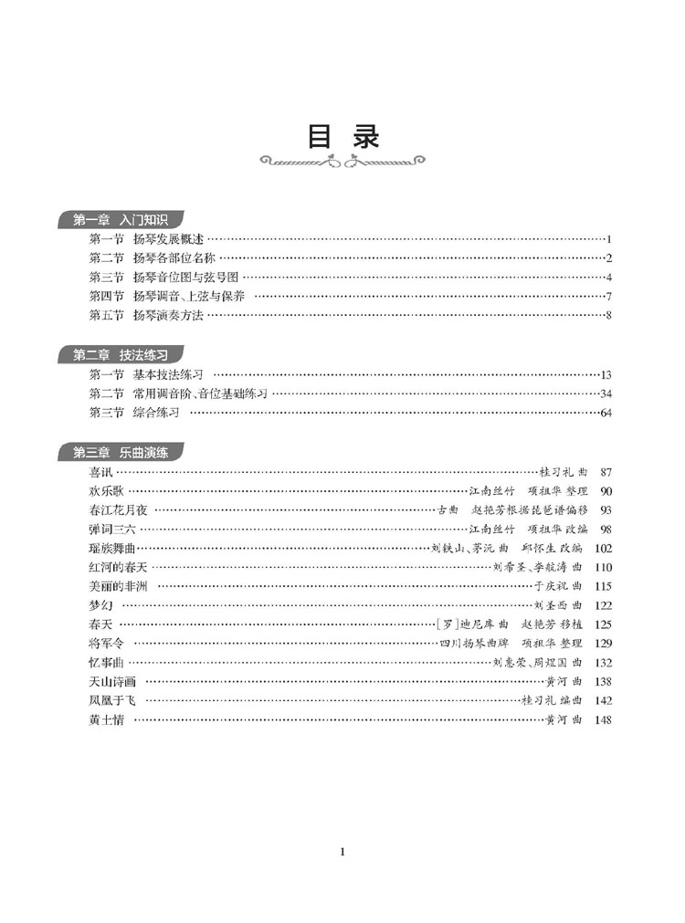 本书共分三章,分别入门知识、技巧训练,乐曲演练。教材很好地把器乐演奏的基本功和乐曲的学习进行了有机的结合,通过第一章的学习让读者基本了解扬琴的历史沿革知识及诸如购买、保养方面的实用知识。第二章技法训练,由基本技法练习、常用调音阶、音位基础练习、综合练习三部分构成,每部分都安排了难度适中的练习曲及乐曲进行巩固。在第三章旋律鲜明、技法通顺的乐曲里,大部分适合初、中级水平爱好者演奏,也有些难度较大的优秀作品,适用于中、高级演奏水平,为追求提高的学习者提供了便利。