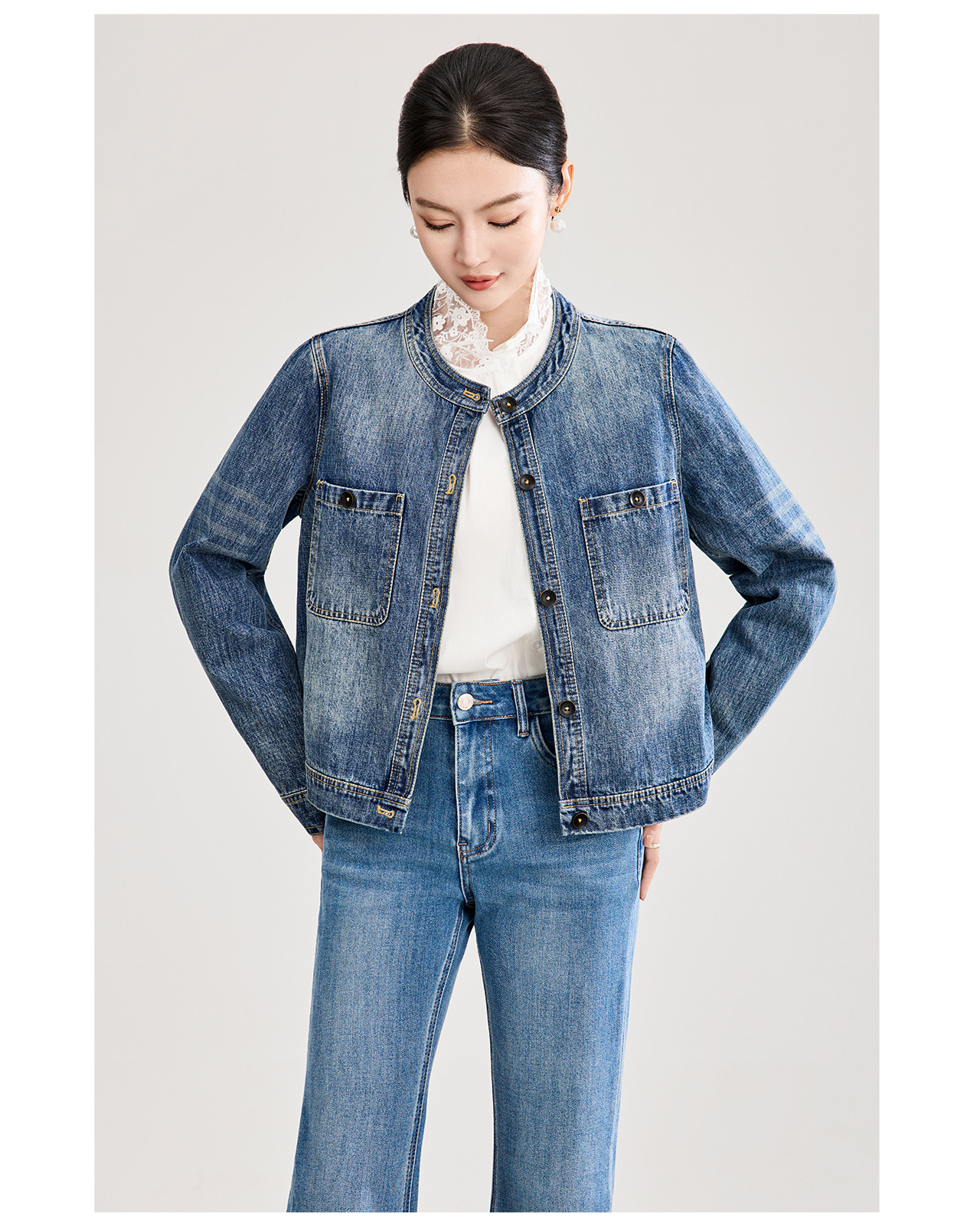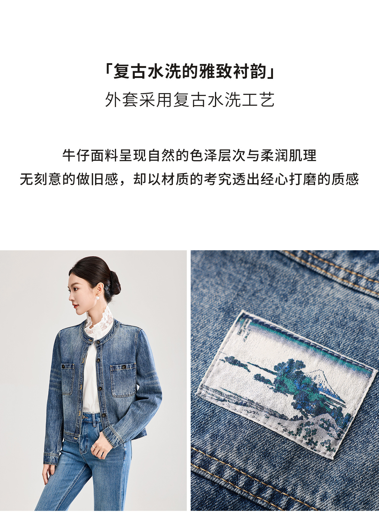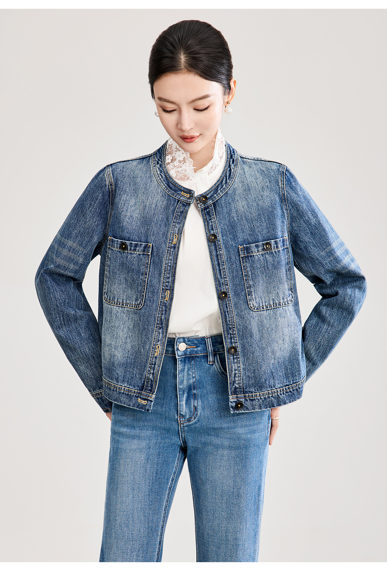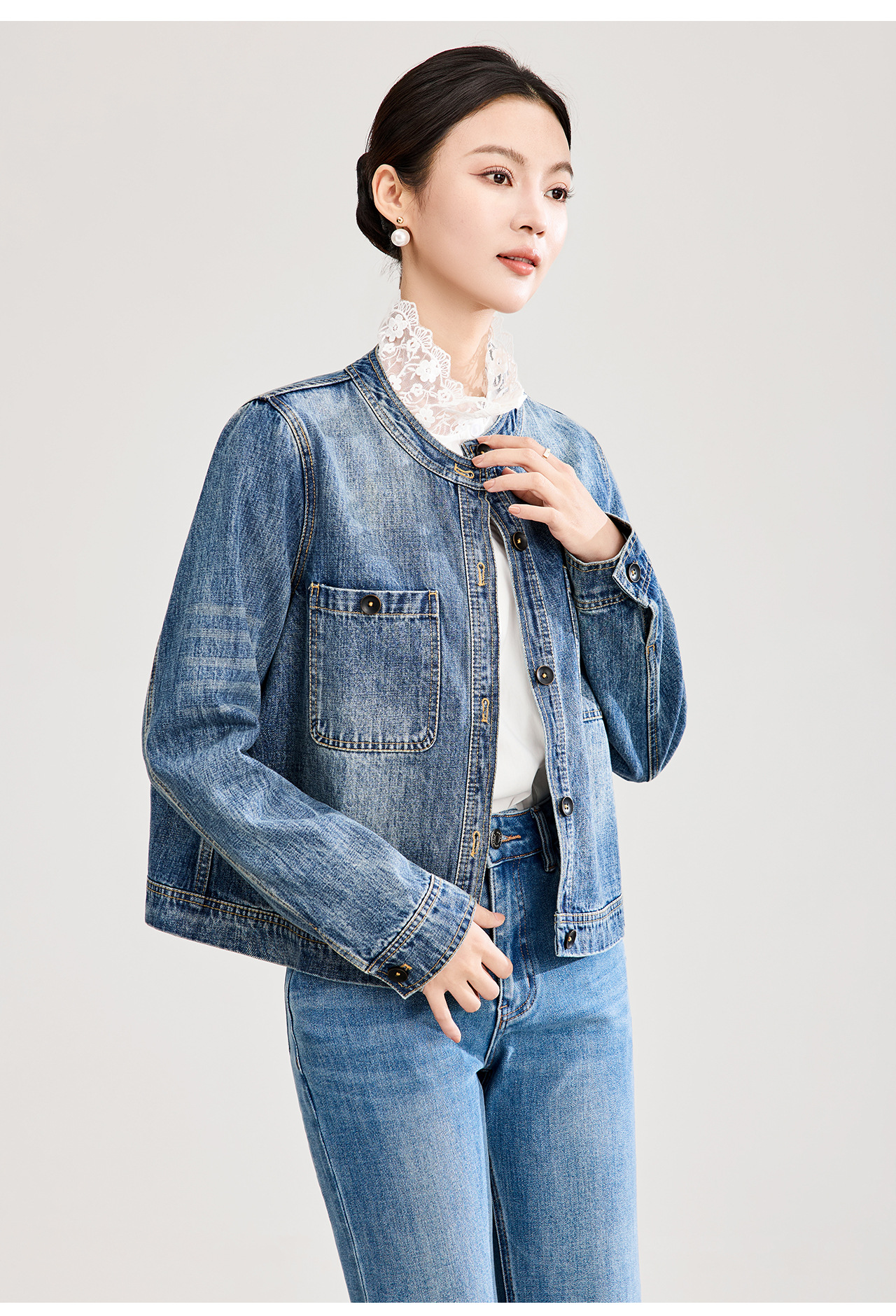 「高货wl」全新升级【铂金会员330/天猫449/差价119】(00936)洛诗琳复古丹宁风水洗棉圆领外套2026春夏新款通勤牛仔外套女