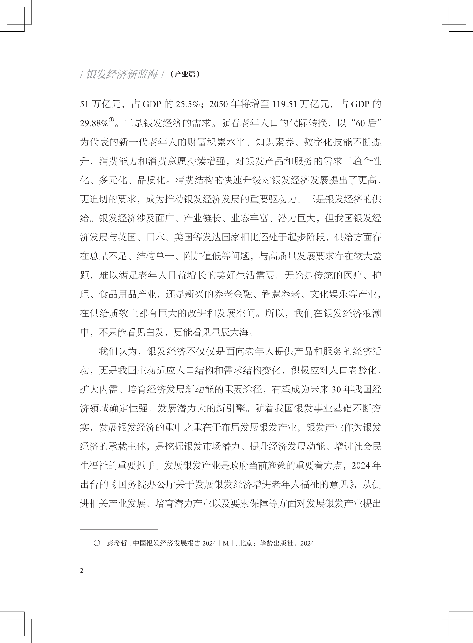 第一册《产业篇》,系统梳理银发经济概念与生态,重点解读医疗、照护、食品、用品、休闲、地产、金融、智慧养老、殡葬等九大产业赛道的发展现状与投资机会,借鉴国际经验,提供创业投资建议,并探讨国有企业如何在该领域展现责任担当。