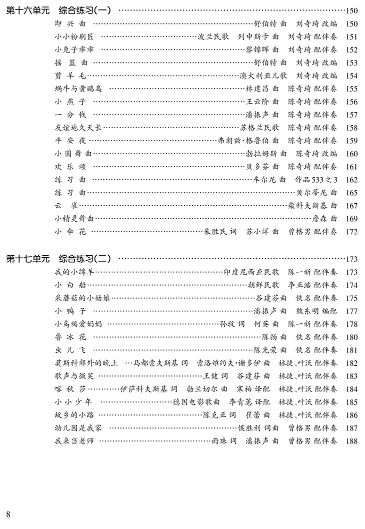 本书是“全国学前教育专业艺术类规划教材”的钢琴教材,共两本,上册和下册。本书是下册,共十七个单元,根据学前教育专业的教学要求和大纲,在上册的基础上由浅入深介绍了附点节奏练习、切分节奏练习、侧击奏法练习、复调音乐的练习、八度练习、延音踏板的练习、装饰音的练习、柱式和弦音型练习、分解和弦音型练习等。作者编写中注重浅显、实用、简洁的特点,每种练习都有相应的练习曲和乐曲,且为部分作品撰写了简练的弹奏提示,对于老师教学和学生练习都有很大的帮助。每个部分的选曲都精炼、有趣,一部分乐曲都是由幼儿歌曲改编的钢琴曲,还分了课堂练习和课后练习,非常实用。