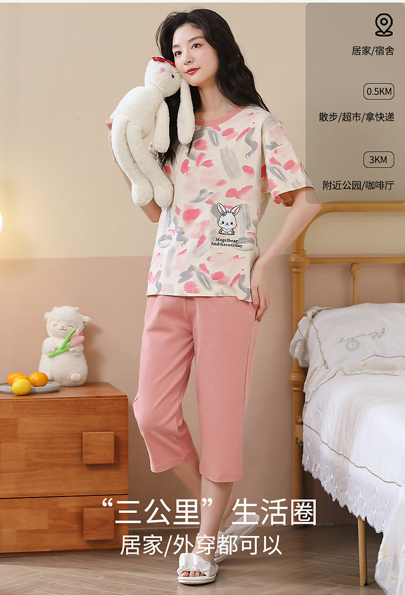 夏季纯棉睡衣女士短袖七分裤套装可爱卡通学生宽松可出门家居服    JL-YS6601/YS6602 商品图0