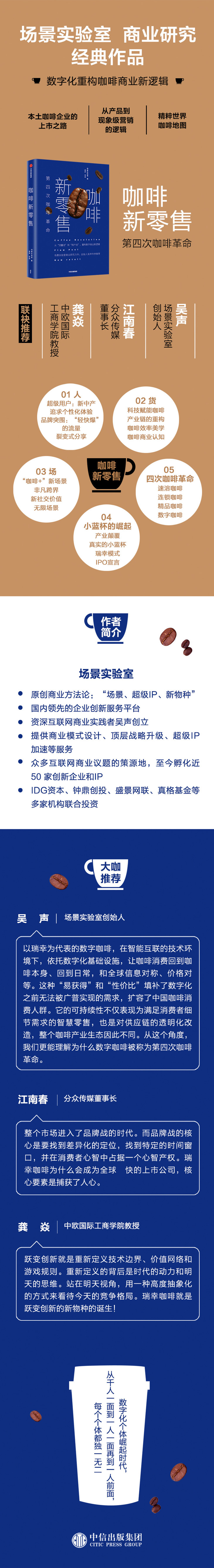 数字化重构咖啡商业新逻辑。场景实验室商业研究力作,场景实验室创始人吴声、分众传媒董事长江南春、中欧国际工商学院龚焱推荐。数字化个体崛起时代,从千人一面到一人一面再到一人前面