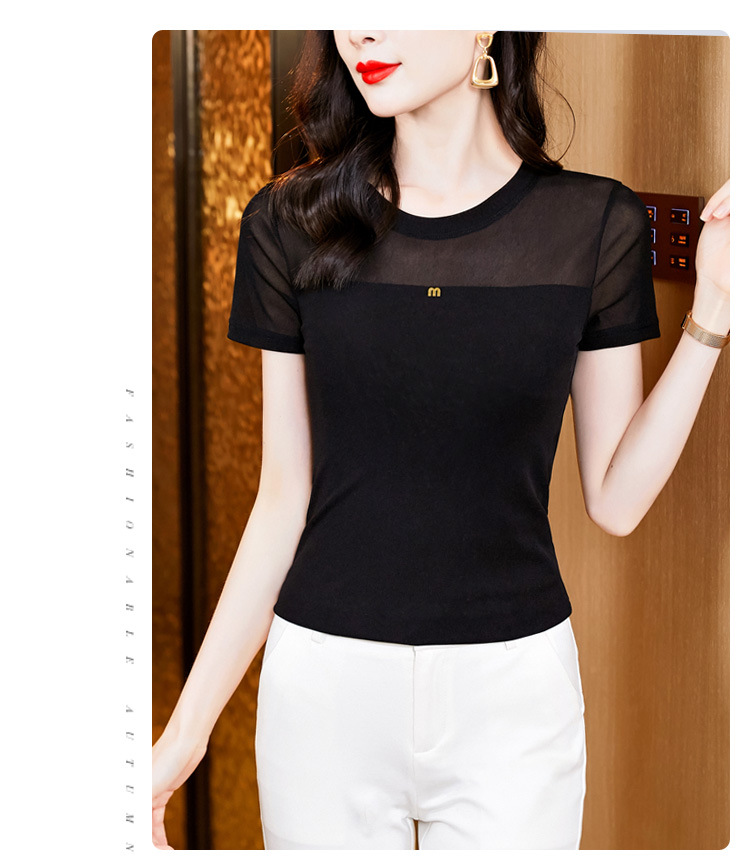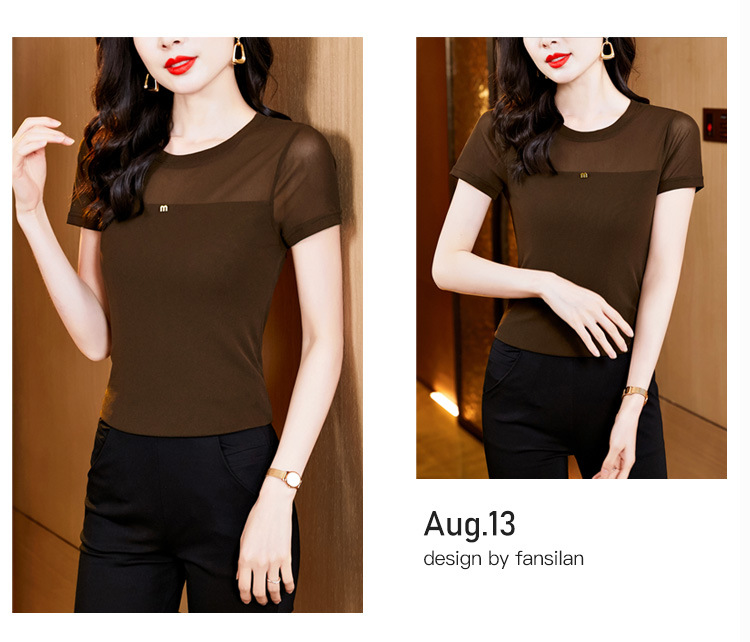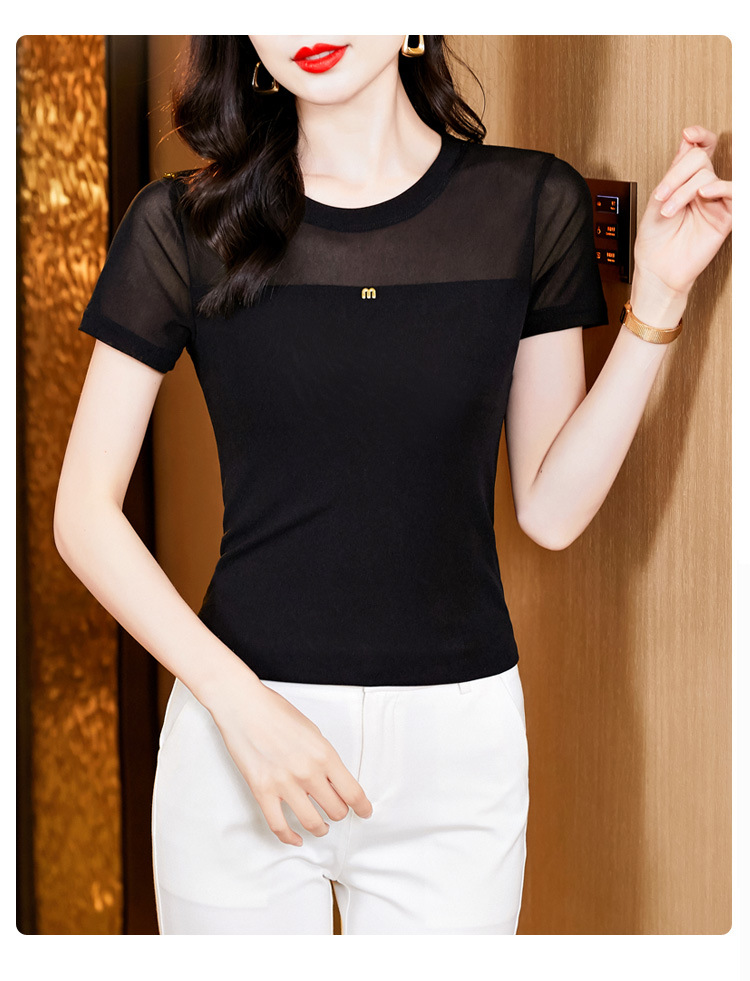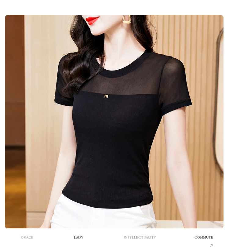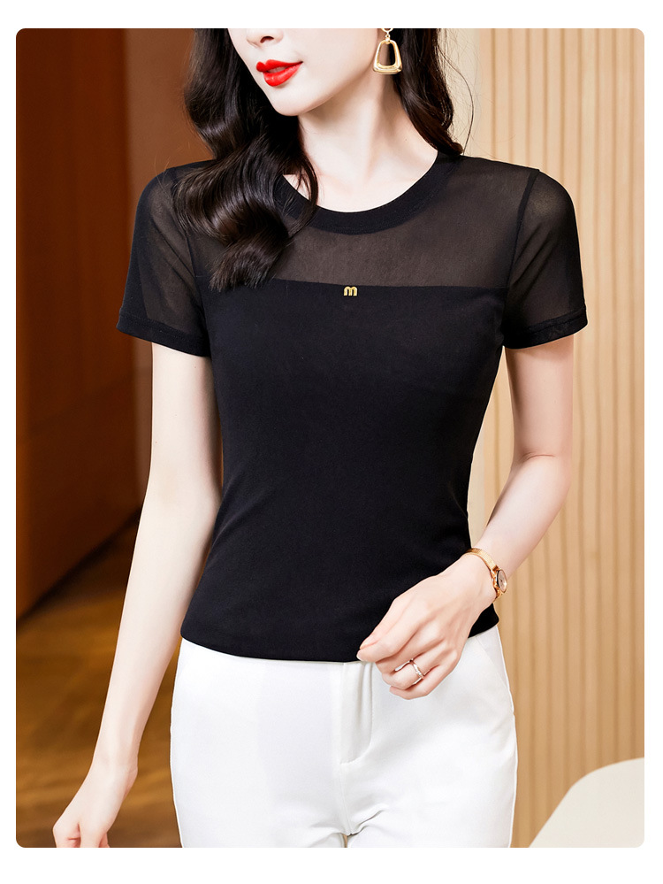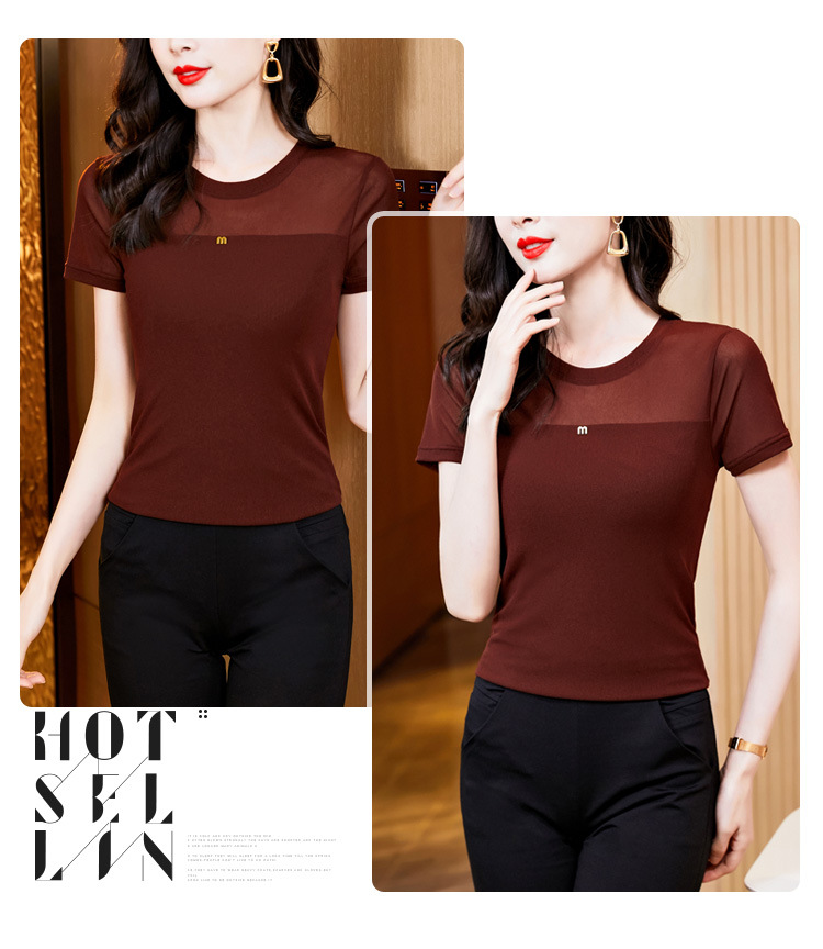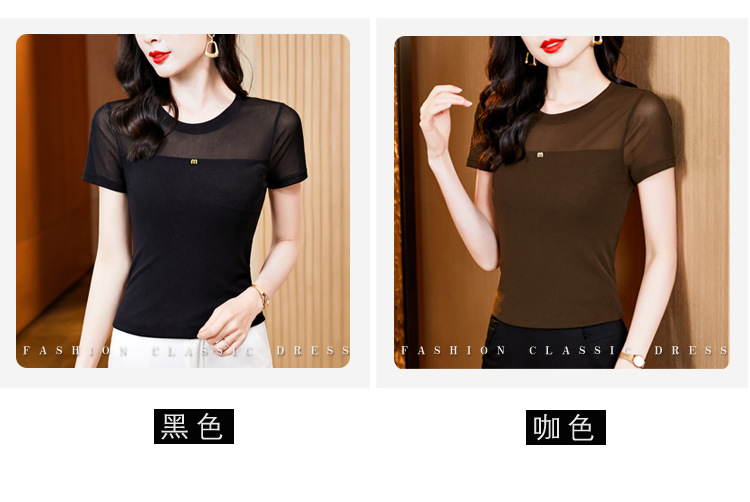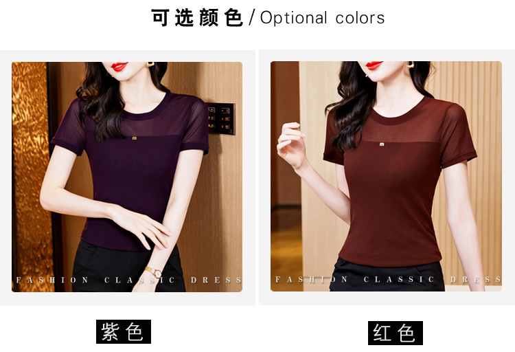 KQLE37M27812024夏季新款圆领百搭大码打底衫修身显瘦纯色网纱短袖t恤女批发