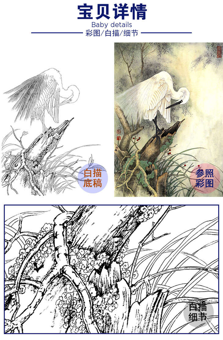 竖幅工笔花鸟白描底稿-白鹭-A182