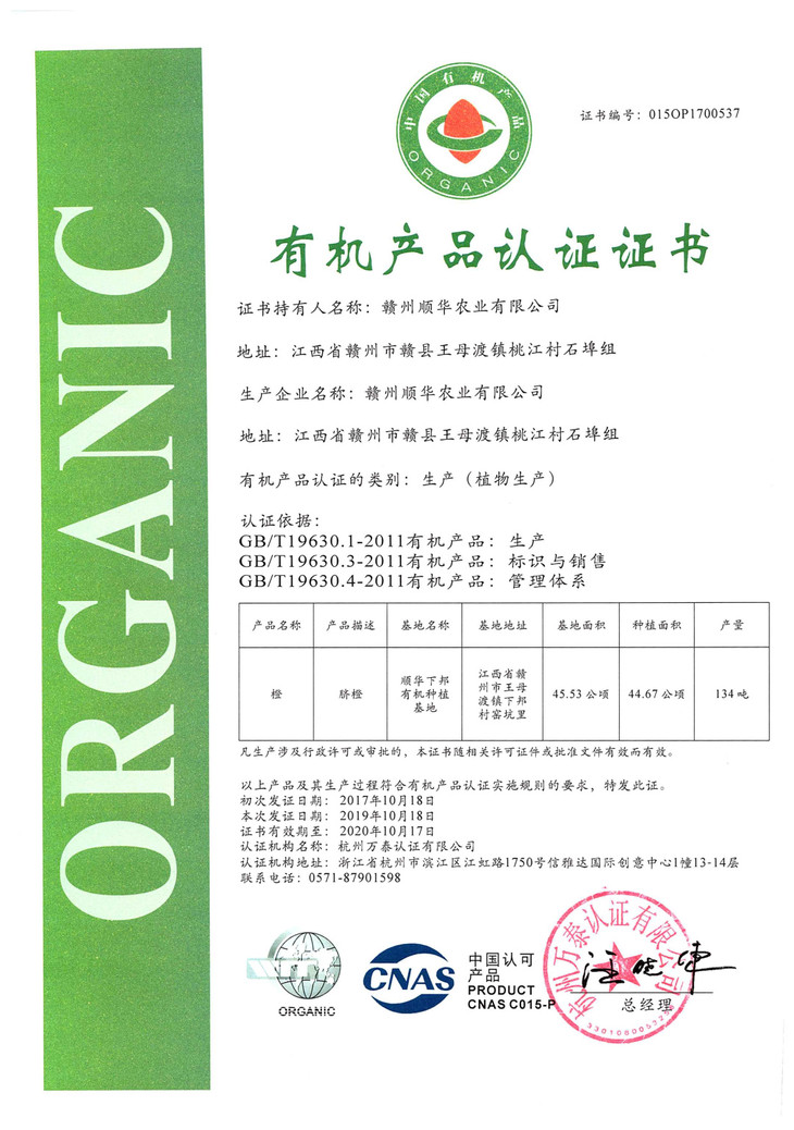 3月下旬到4月橙花繁盛,需要自然脱落大约六成,自然疏花,5、6月书上的次果自然掉落一部分,剩下的果实才有优质的品质。种植过程中不使用化肥,因地施宜:赣南地区,花生,油菜丰富,榨油后的花生麸,菜籽饼是最好的肥料来源。