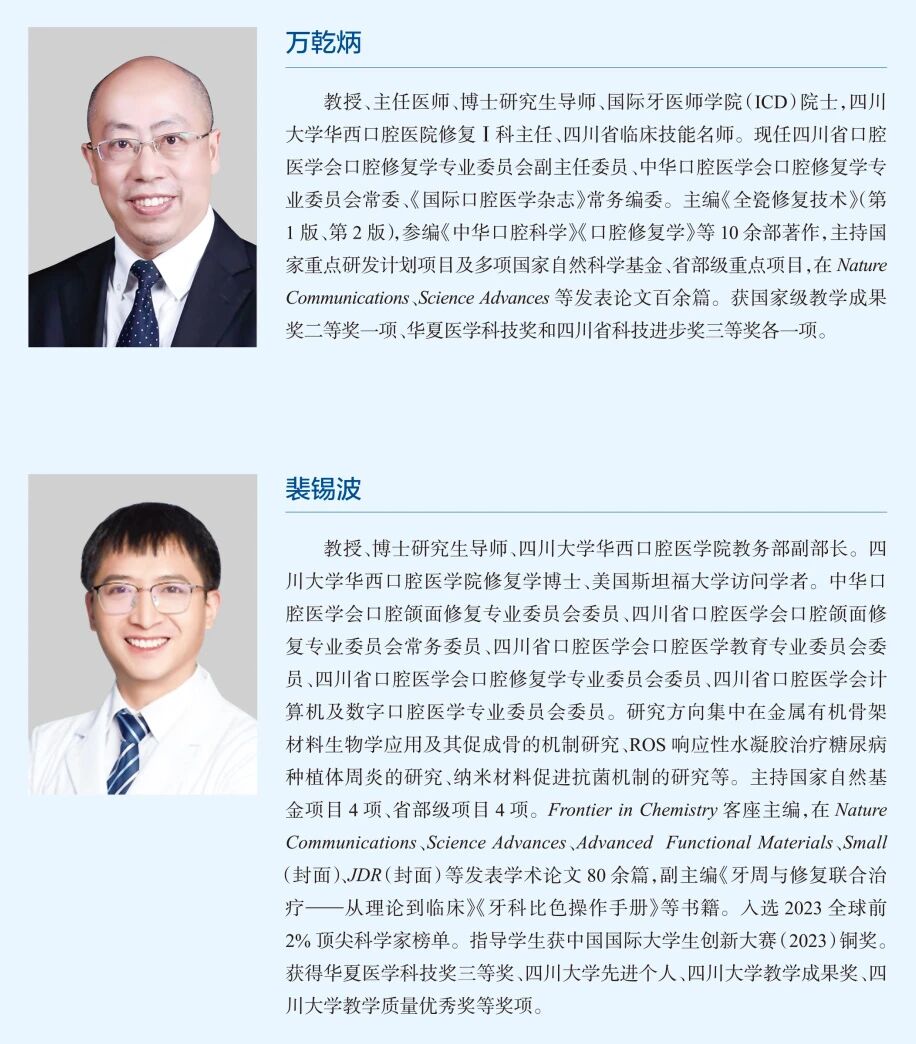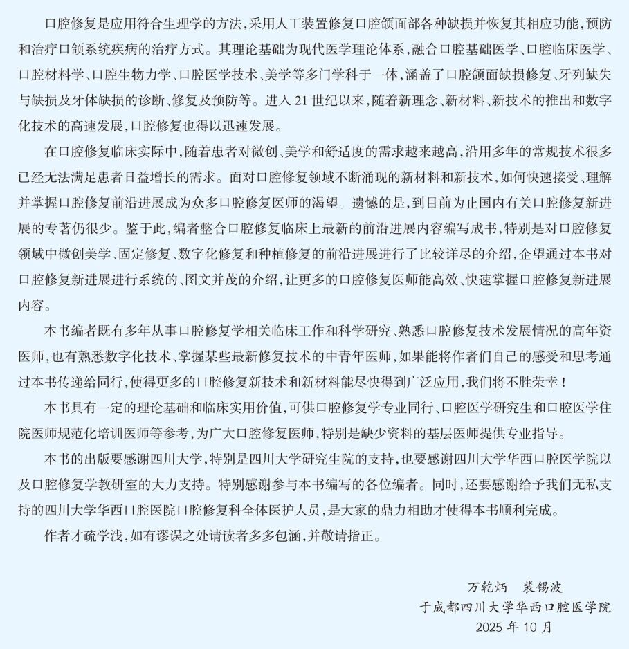 四川大学华西口腔医院万乾炳教授及其团队将口腔修复临床上新的前沿进展内容编写成书,特别是对口腔修复领域中微创美学、固定修复、数字化修复和种植修复的前沿进展进行了详尽的介绍。