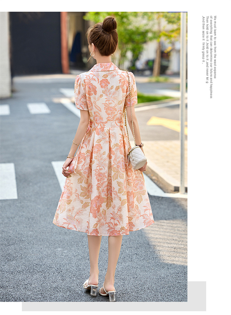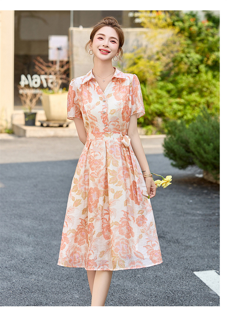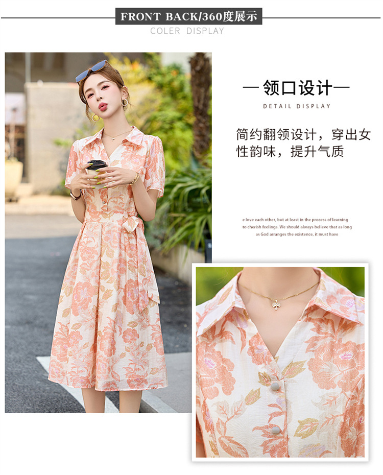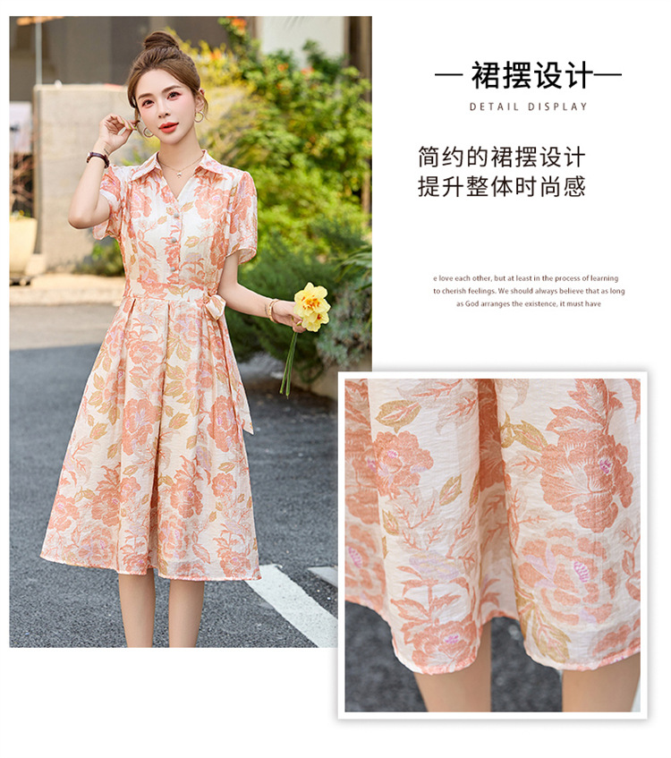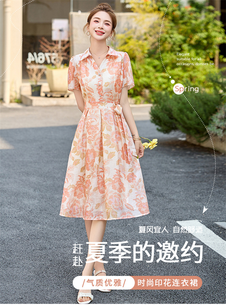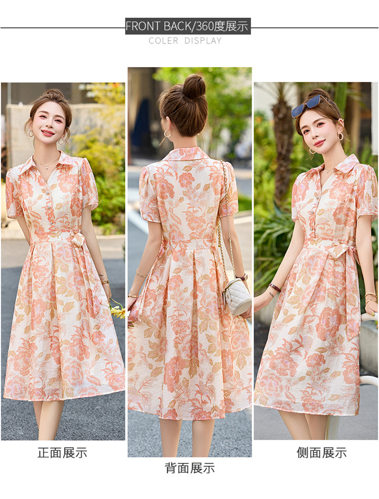 【预售3天】优雅气质收腰显瘦大花连衣裙短袖翻领韩版中长裙XXL3102