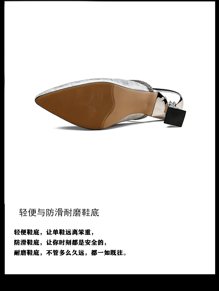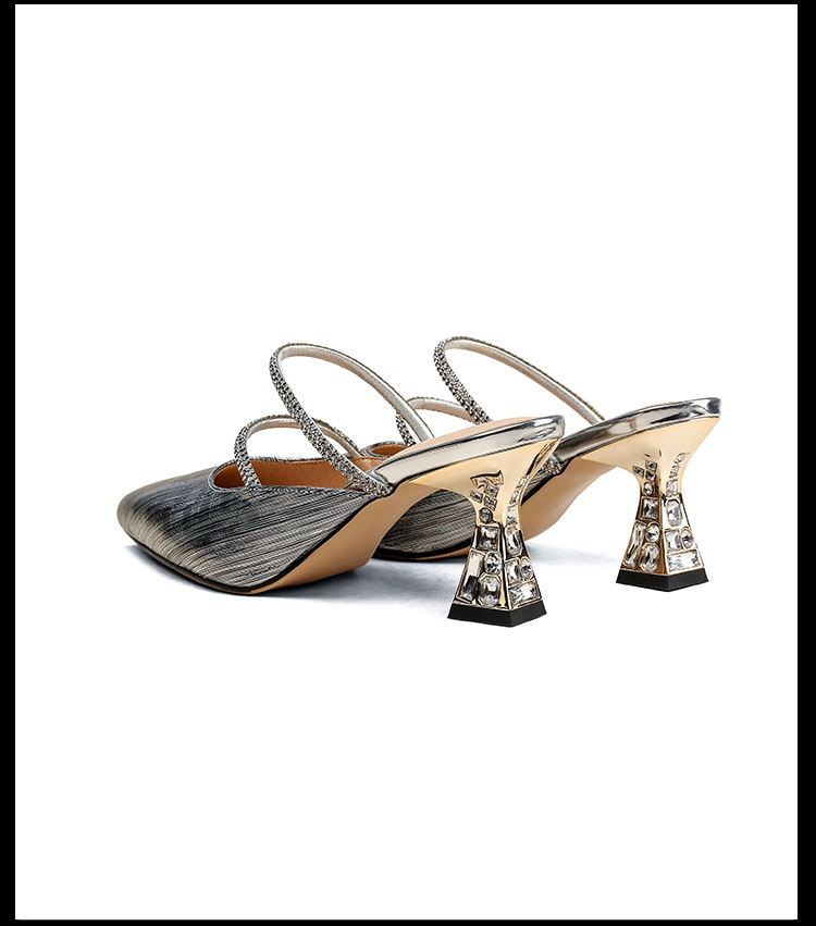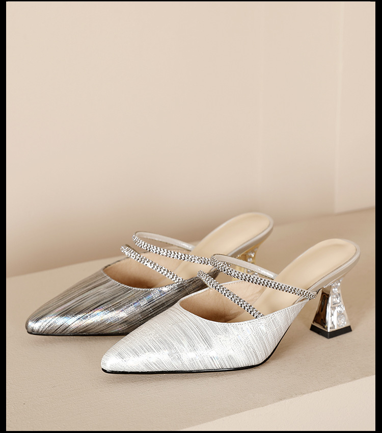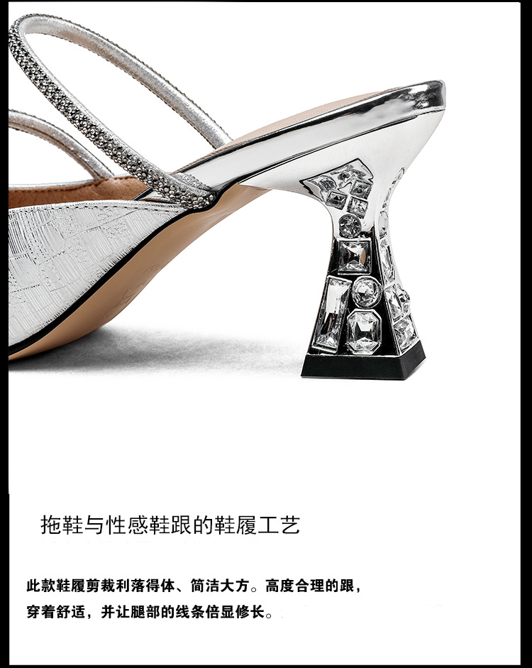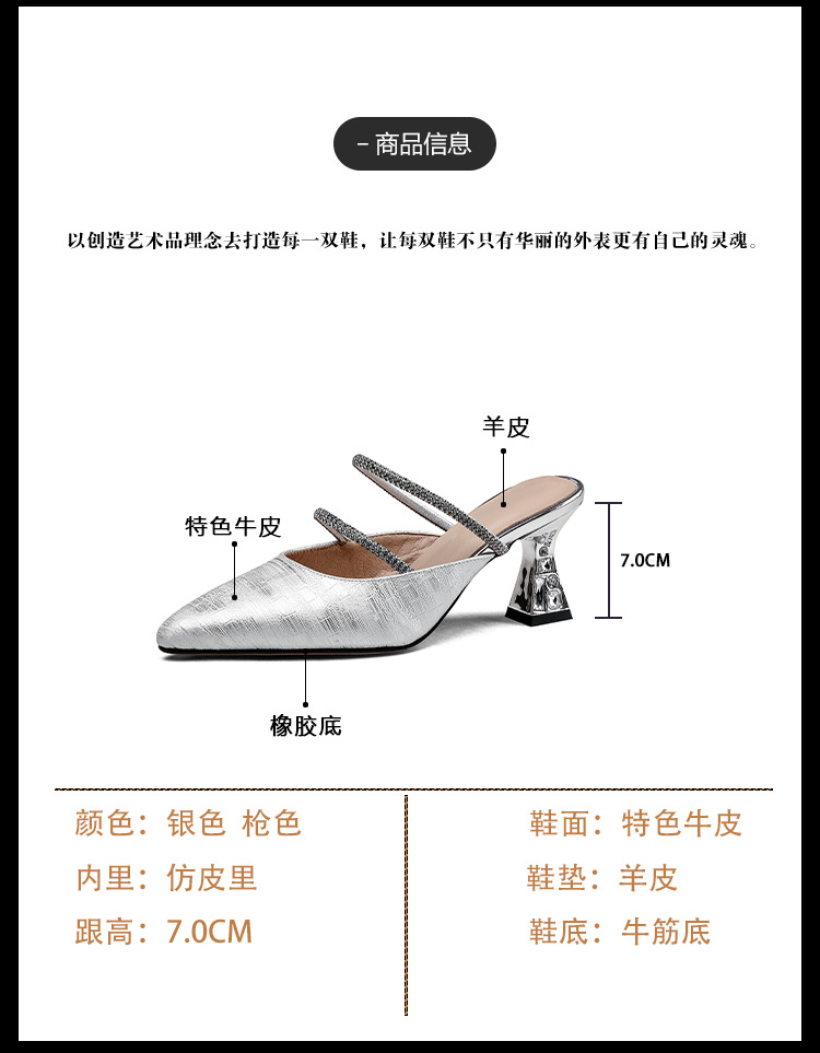 夏季新款,法式优雅尖头凉鞋水钻带一脚蹬粗跟包头半拖鞋女外穿PLGZ-D108-5