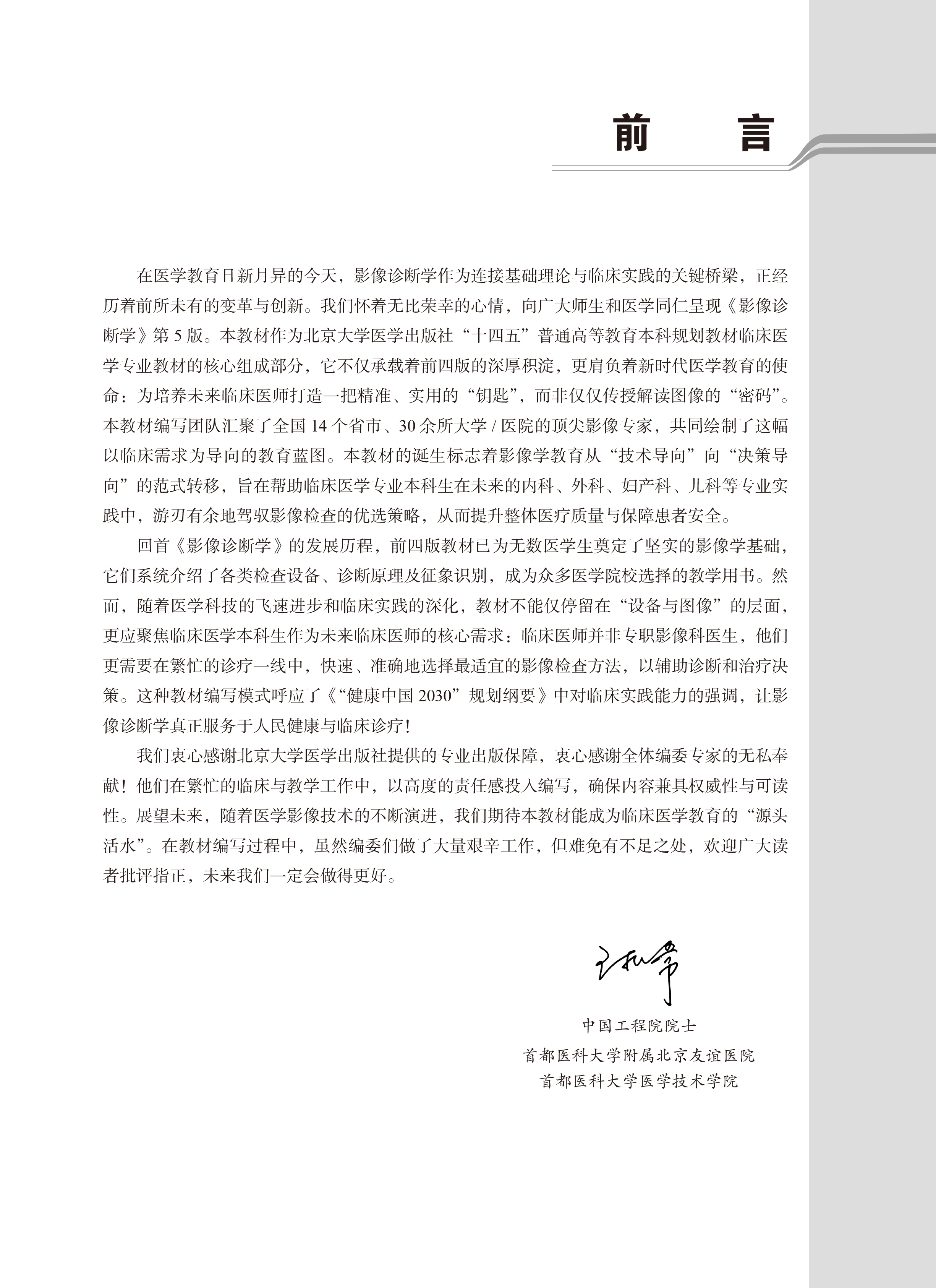 本书为本科临床医学5轮教材,内容分上、下两篇。上篇介绍临床常用影像技术基础知识,下篇按器官系统分别论述影像技术在临床常见病、多发病中的具体应用。在论述中,充分引入案例,配以丰富的影像图片,辨析正常与病变的检查表现,着重介绍疾病影像的特征,指导学生将来临床如何优选及注意事项。基础回顾有效增强临床与基础的链接,知识拓展及思考题能开拓思路和巩固要点。教材严格遵循“三基五性”的要求,定位于面向医学本科生的通识教育,引导学生建立从检查技术到正常表现,从基本征象到常见疾病的知识框架。在教材的撰写过程中,力争做到以行业指南为标准,以专家共识为参照,以系统评价为基础,以经典病例做示范,图文并茂地展示医学影像学的内涵与魅力,体现本学科在临床医学体系中的基础性、桥梁性作用。