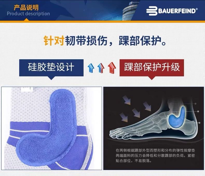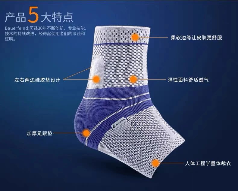 护踝适用于各种运动,两侧软硅胶保护,有效预防踝部韧带损伤、断裂,踝关节骨折以及距骨软骨损伤、足踝部骨关节炎等等。功能原理:梯级压力可促进积液吸收,缓解肿胀和血瘀;硅胶垫将踝关节压力分散到四周软组织;硅胶垫和针织面料的压力刺激能在运动中缓解脚踝部的疼痛,激活皮肤接收器从而达到稳定。穿戴后平衡力得到明显改善、稳定性得到提高、运动踝关节处的压迫和疼痛感明显降低。 护臂同时适用于各种运动,左右两侧软硅胶保护,面料压力逐步降低分散肘部负荷,透气舒适。按摩硅胶垫,缓解运动过程中手臂充血导致的压迫感。同时可以降低手臂肘部的受伤风险。