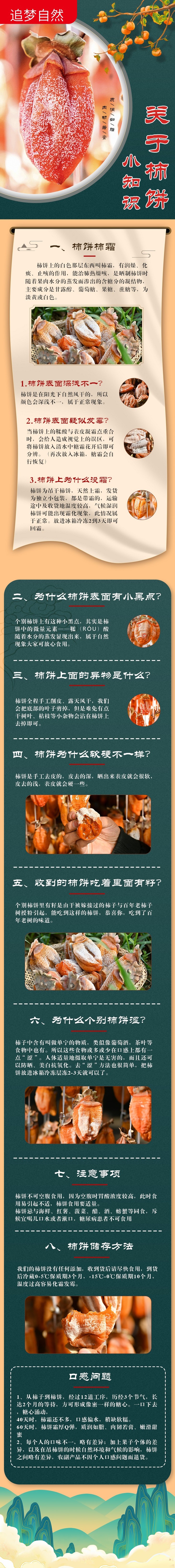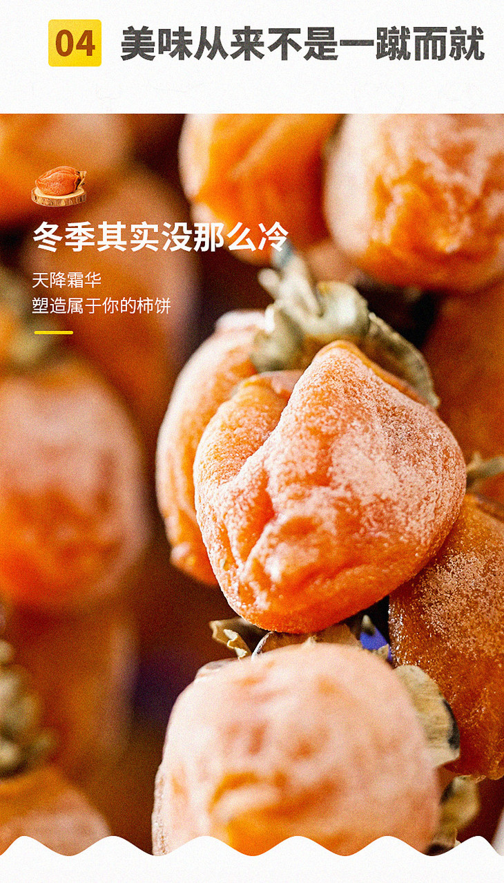 ⑤关于黑点:个别柿饼上有这种小黑点,其实是柿饼中的微量元素——鞣(róu)酸,随着水分的蒸发显现出来,并不是发霉了,大家可放心食用。