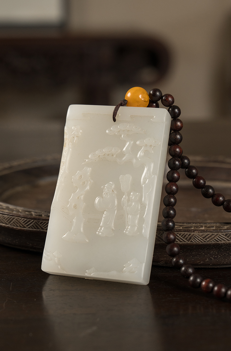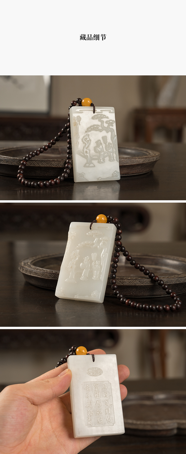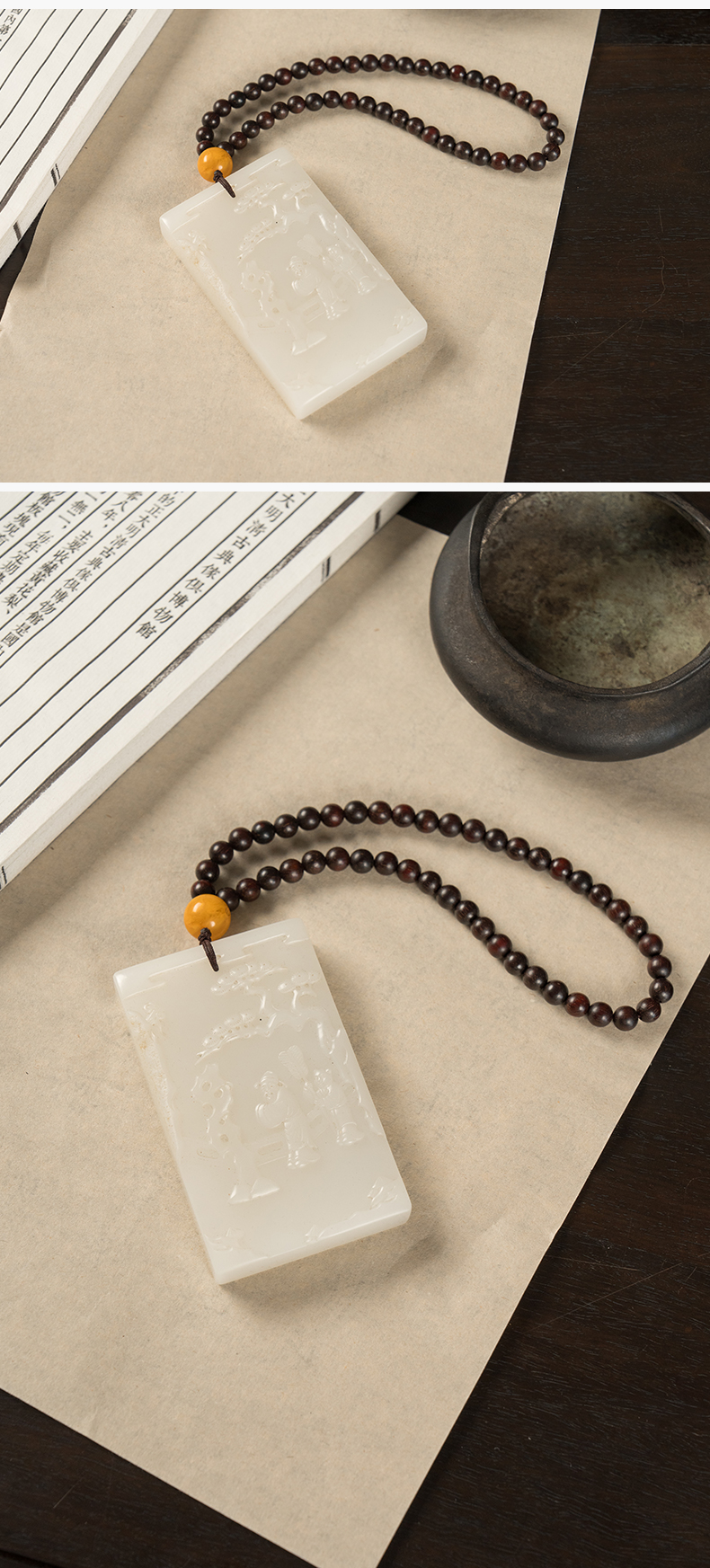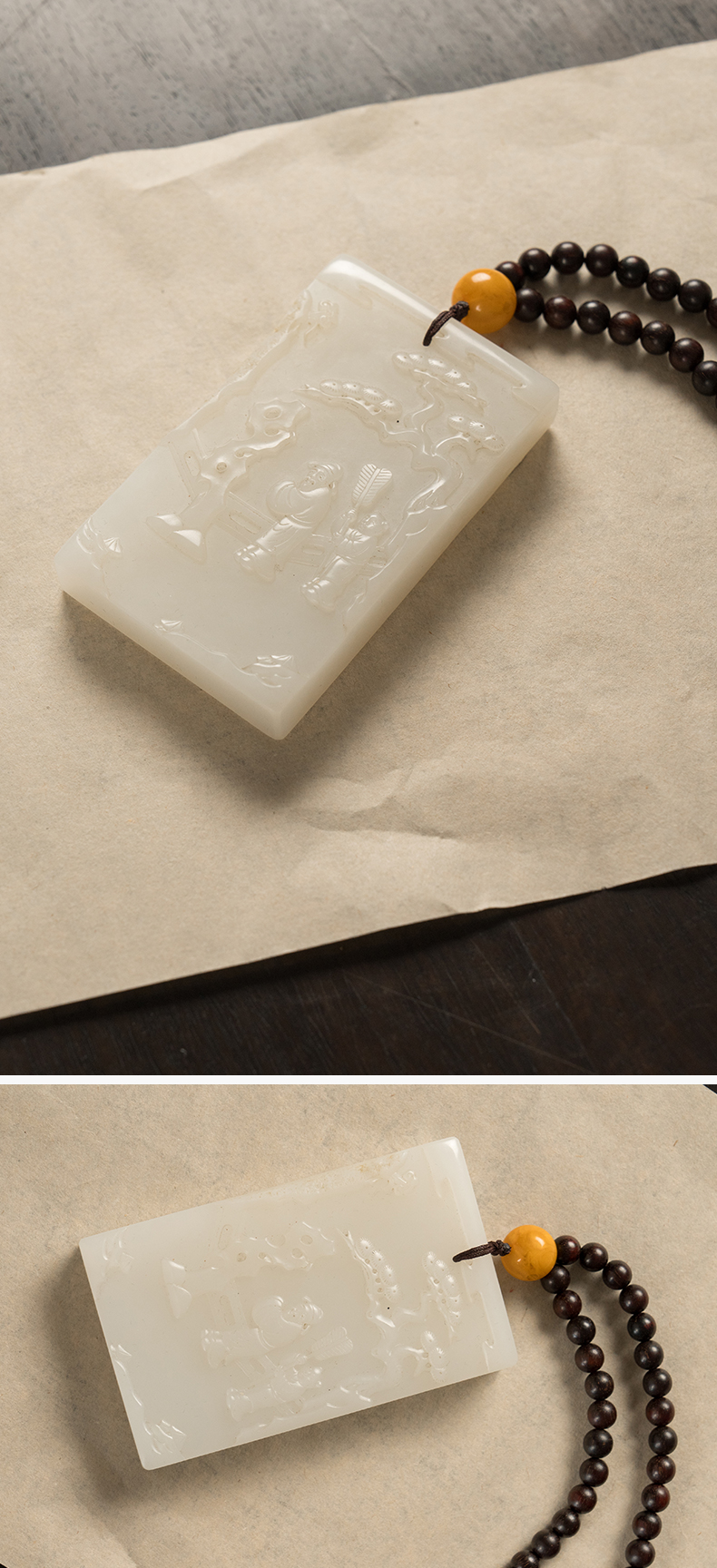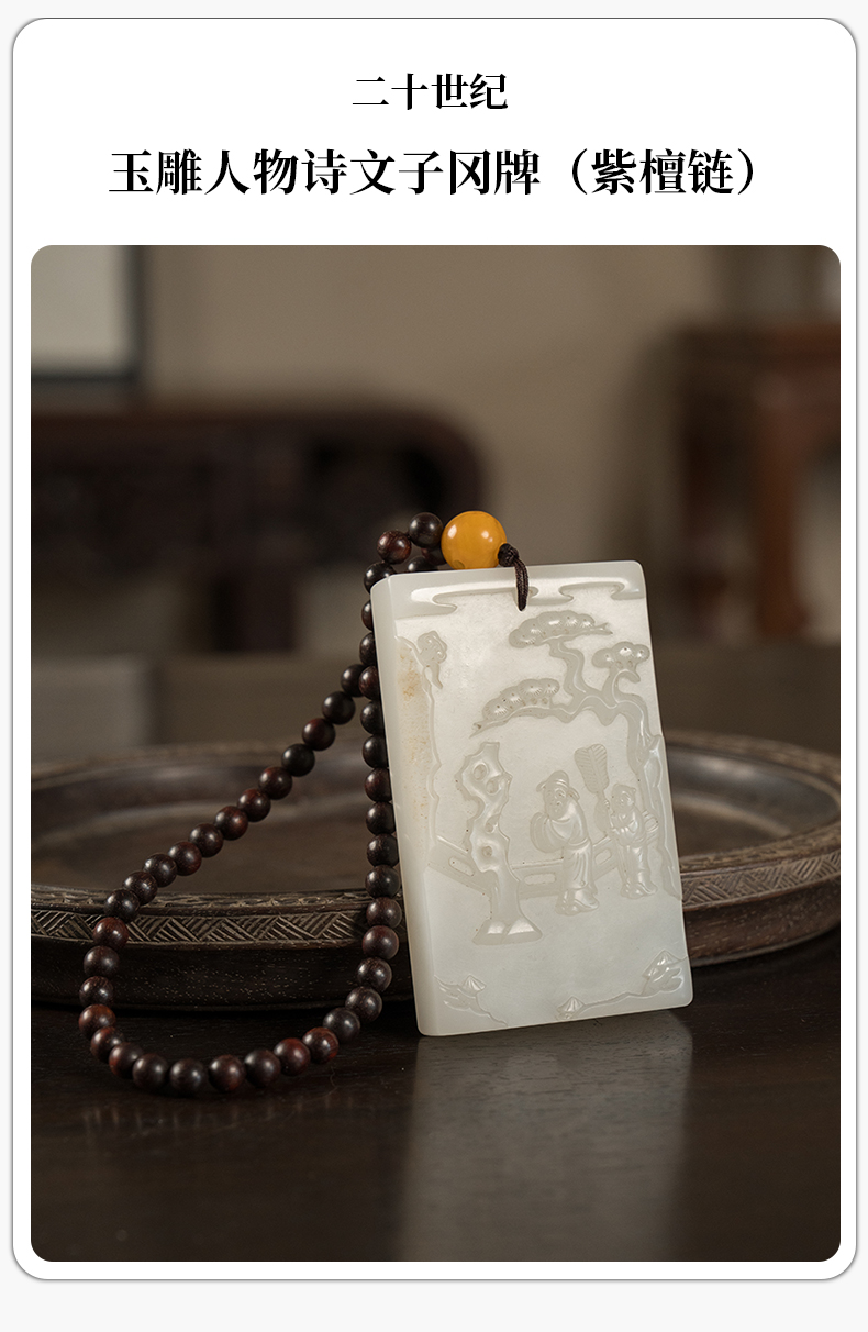二十世纪玉雕人物诗文子冈牌(紫檀链)