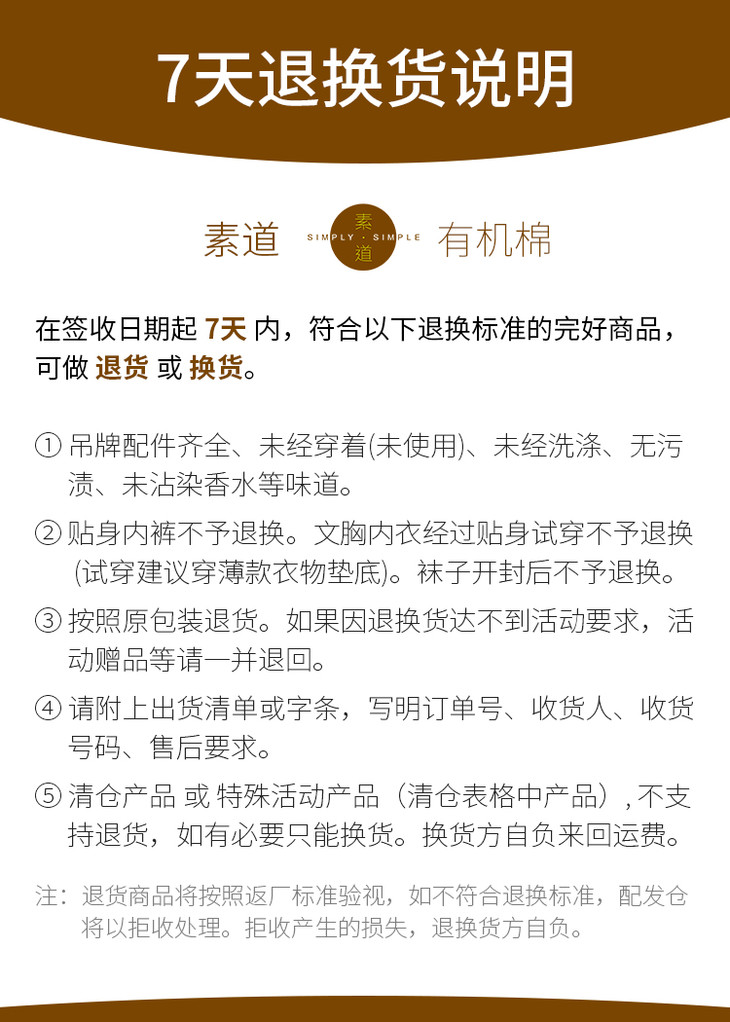 有机棉成人基础袜 Organic Adult basic socks规格: 螺纹款:本白/绿色/棕色 麦穗款:本白/绿色/棕色 平纹款:本白/绿色/棕色 螺纹短款:本白/灰色/棕色 (以上有男款、女款均码) 生产者:北京中彩天星纺织品有限公司 地址:北京市朝阳区光华路8号光华大厦A座6层 生产方式:棉花有机种植,加工过程无任何化学添加 注意事项:如有尺寸不合适、不喜欢等个人原因产生的退换货,需承担发货、退换所产生的运费。请下单前确认好尺寸。 发货方式:产地发出,建议素道产品不和店里其他产品一起付款,更省运费。每周日至周五,早8点前下单的产品,当日发货;超过早上八点的时间,次日发货。周六不发货。不参与广东省内满300包邮活动。受天气或库存等原因影响可能偶有耽误,急单请发货前咨询客服,不接受没有提前沟通的拒收。 |