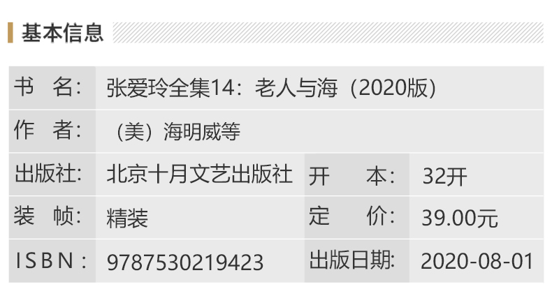 * 张爱玲vs海明威,大师与大师的默契碰撞——张爱玲第yi个将《老人与海》翻译成中文,中译本一出版“立即被称许为经典”。