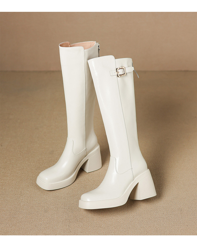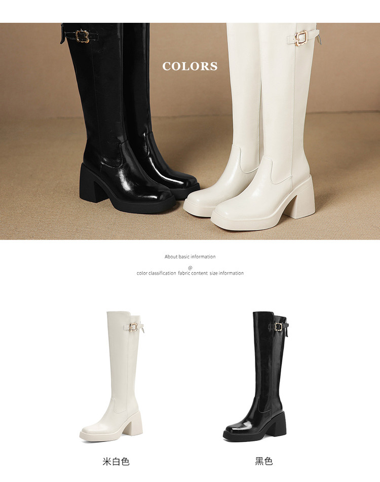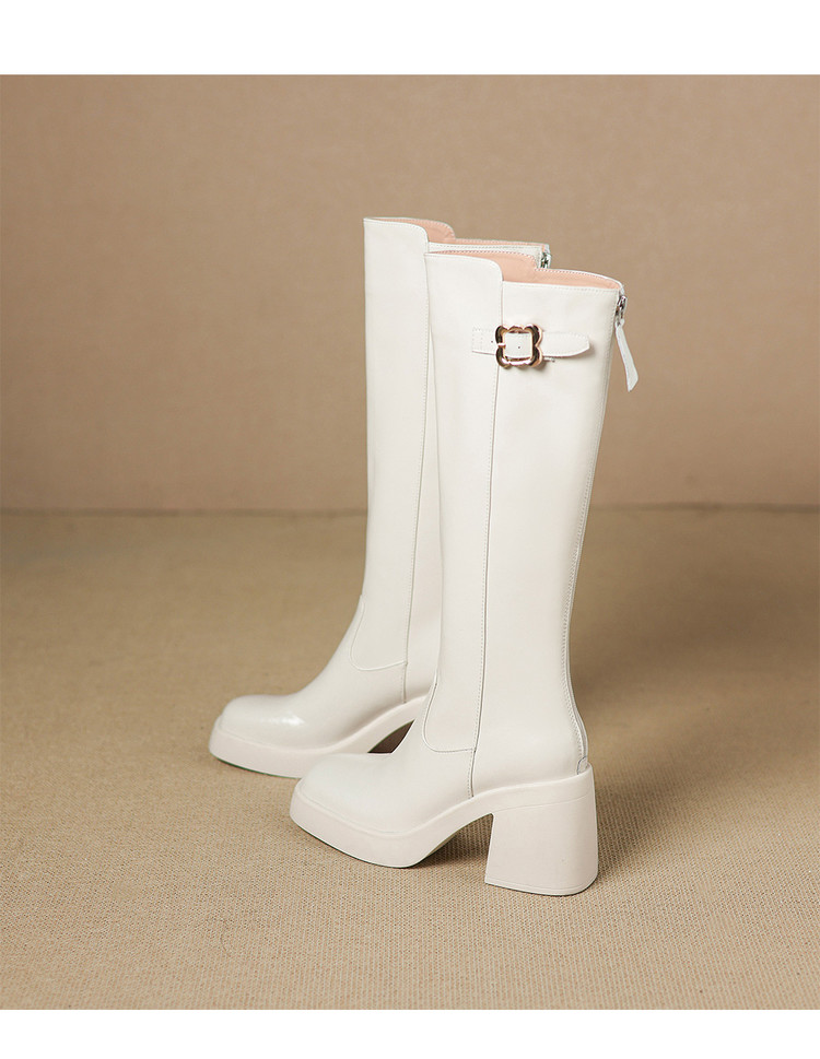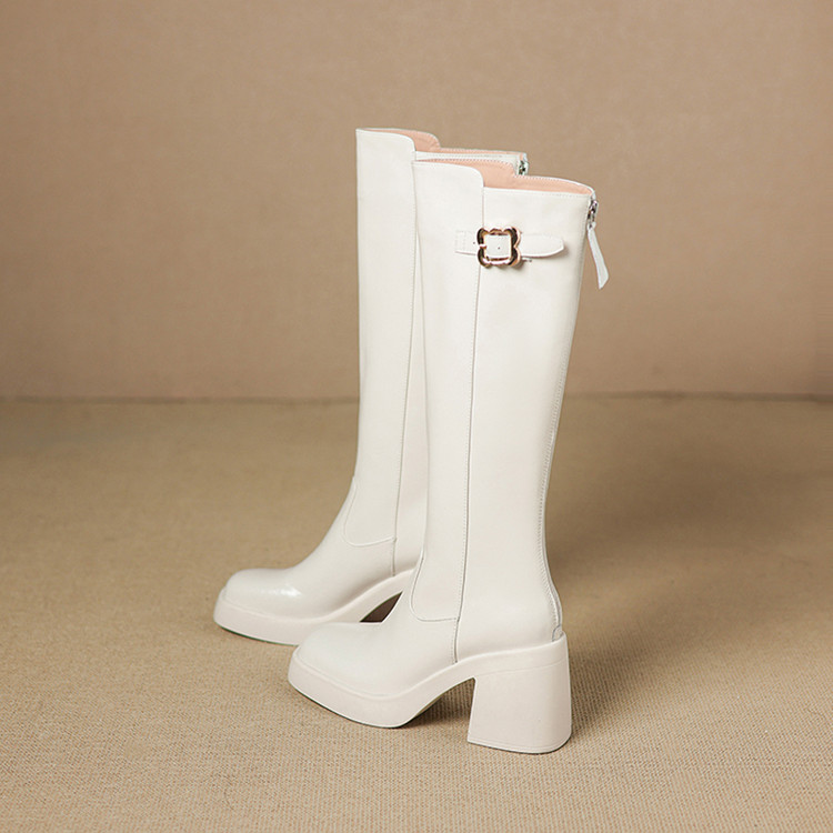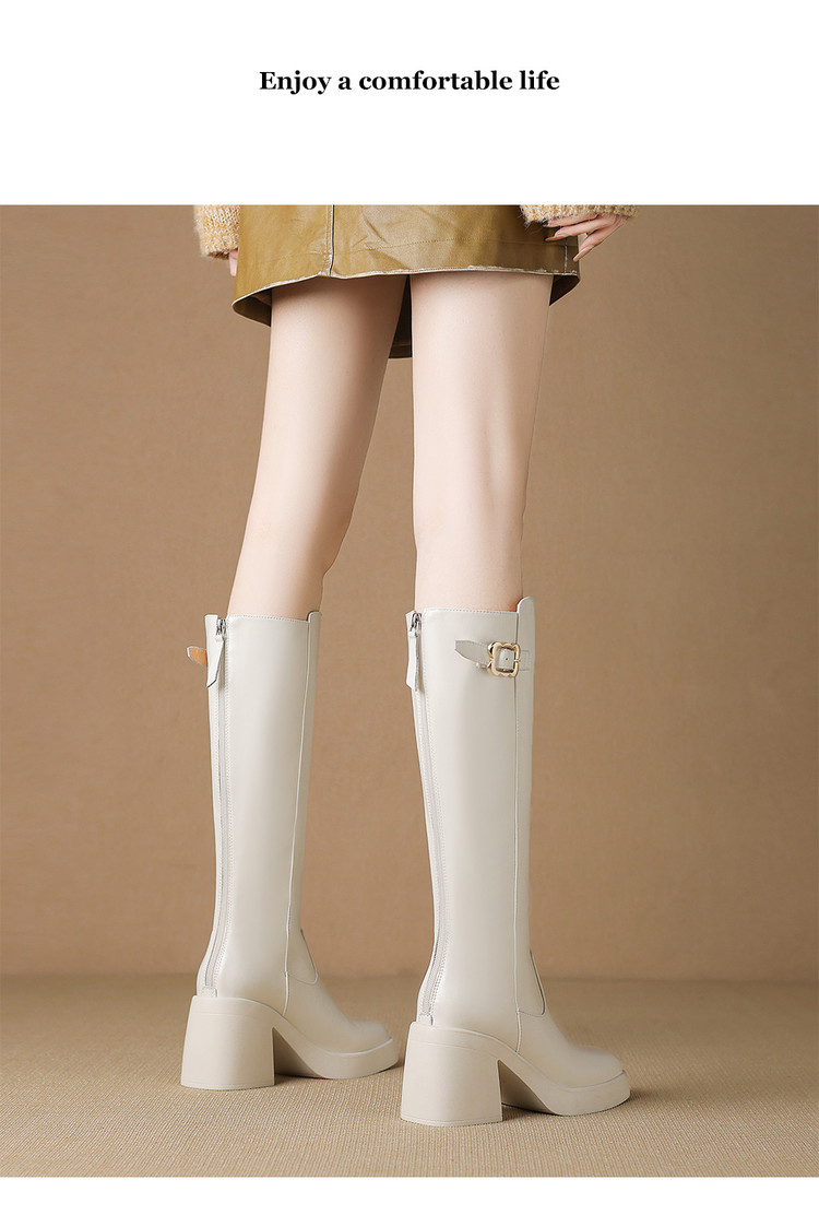 【预售7天】秋冬新款米白色真皮长靴女粗跟防水台骑士靴后拉链单靴时装靴CFE&C6387