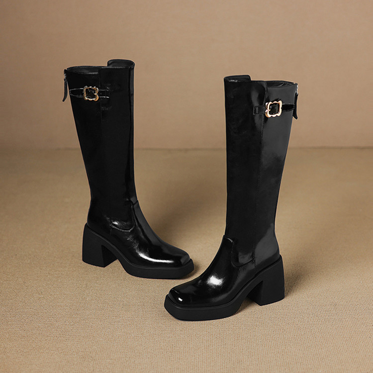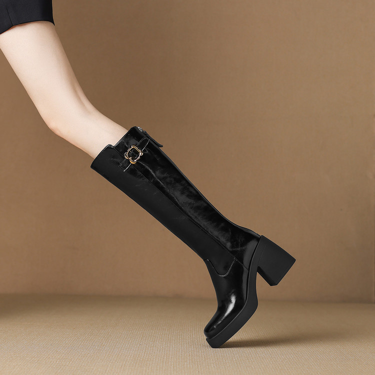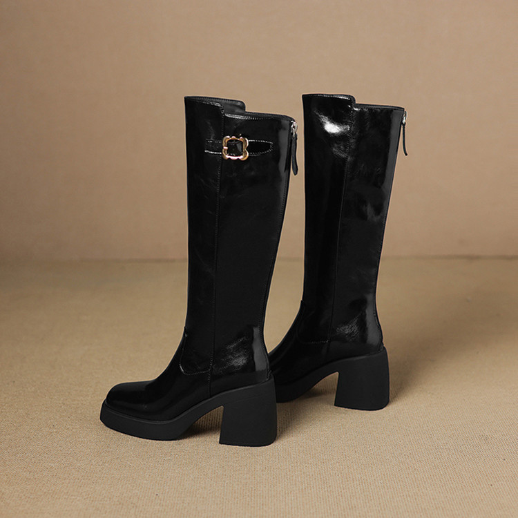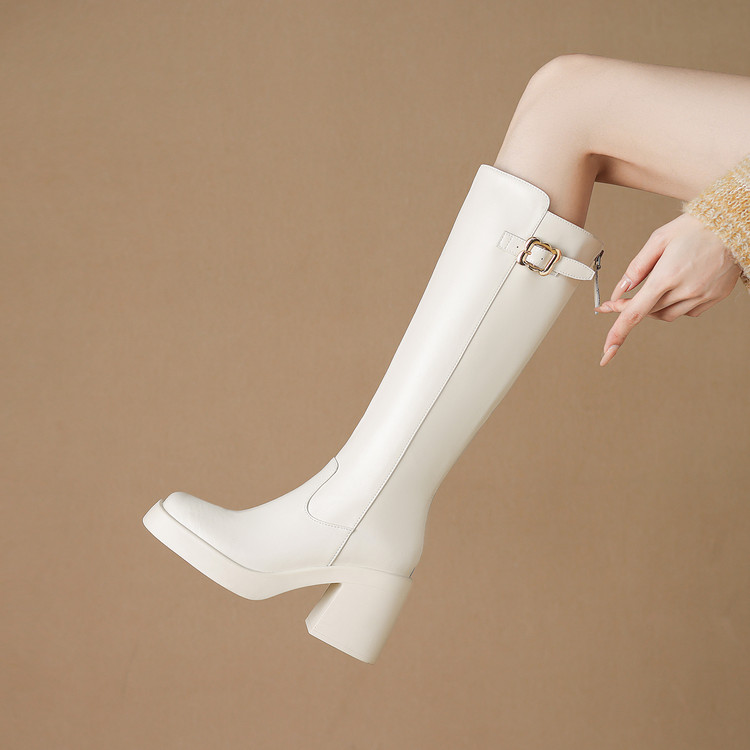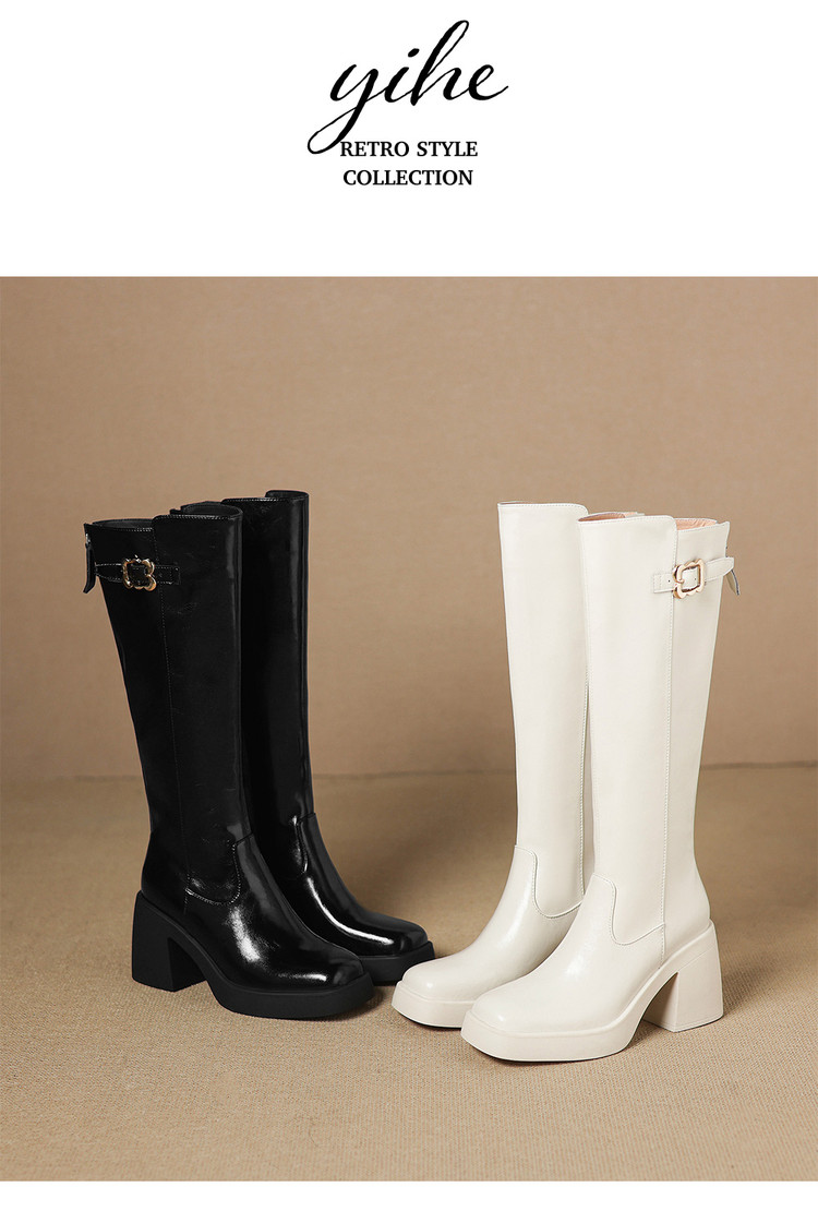 【预售7天】秋冬新款米白色真皮长靴女粗跟防水台骑士靴后拉链单靴时装靴CFE&C6387