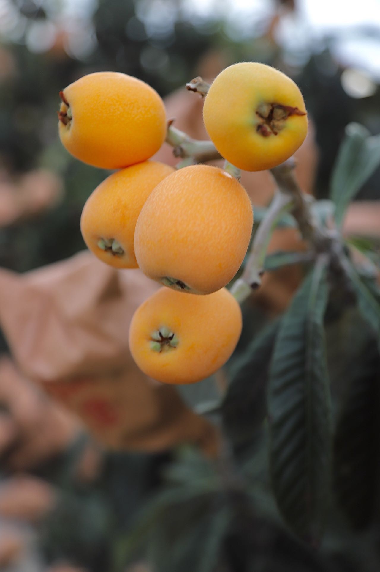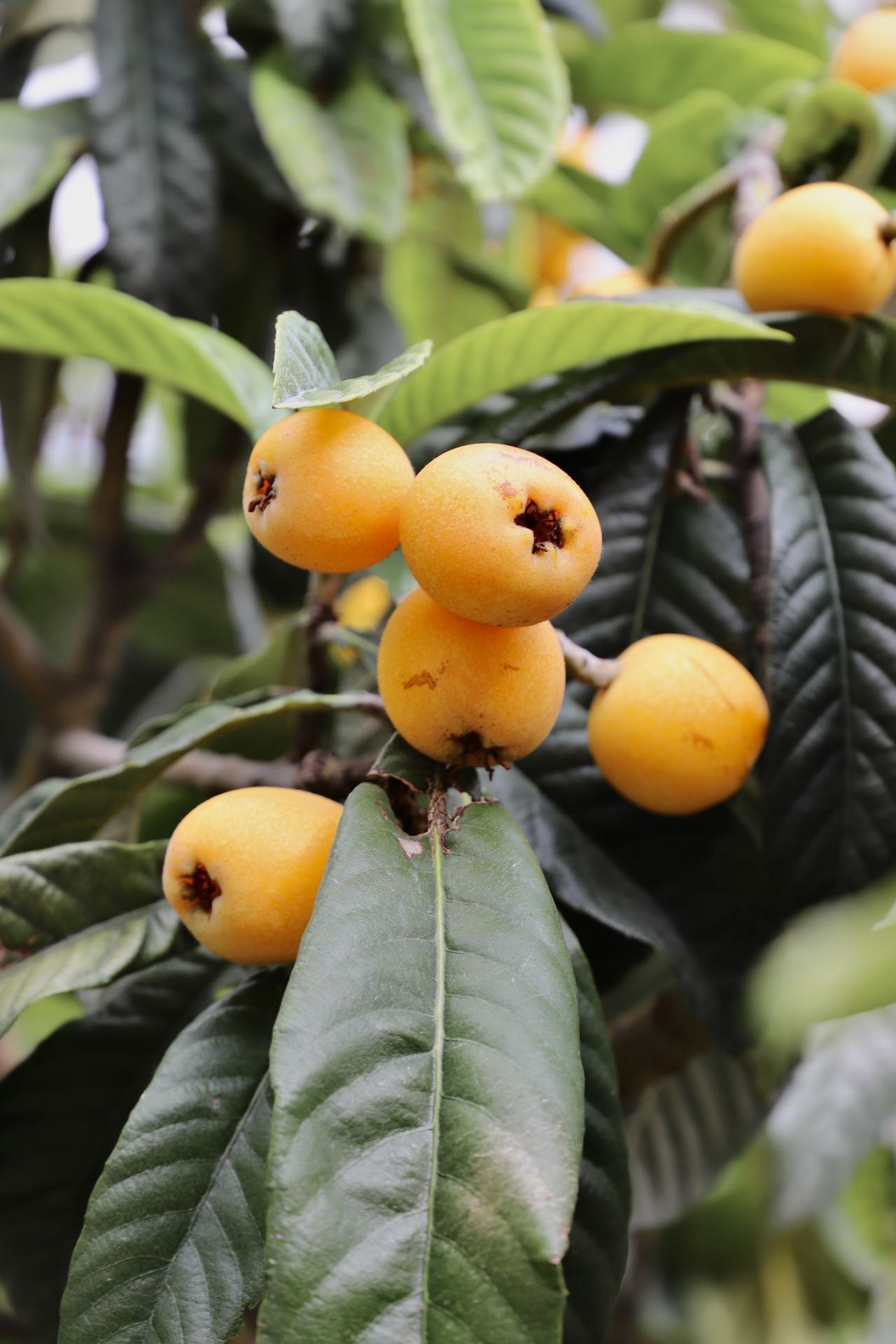 成熟的枇杷果子亦成束挂在树上,每个果子长3-5厘米,成圆形、椭圆、或长状“琵琶形”。