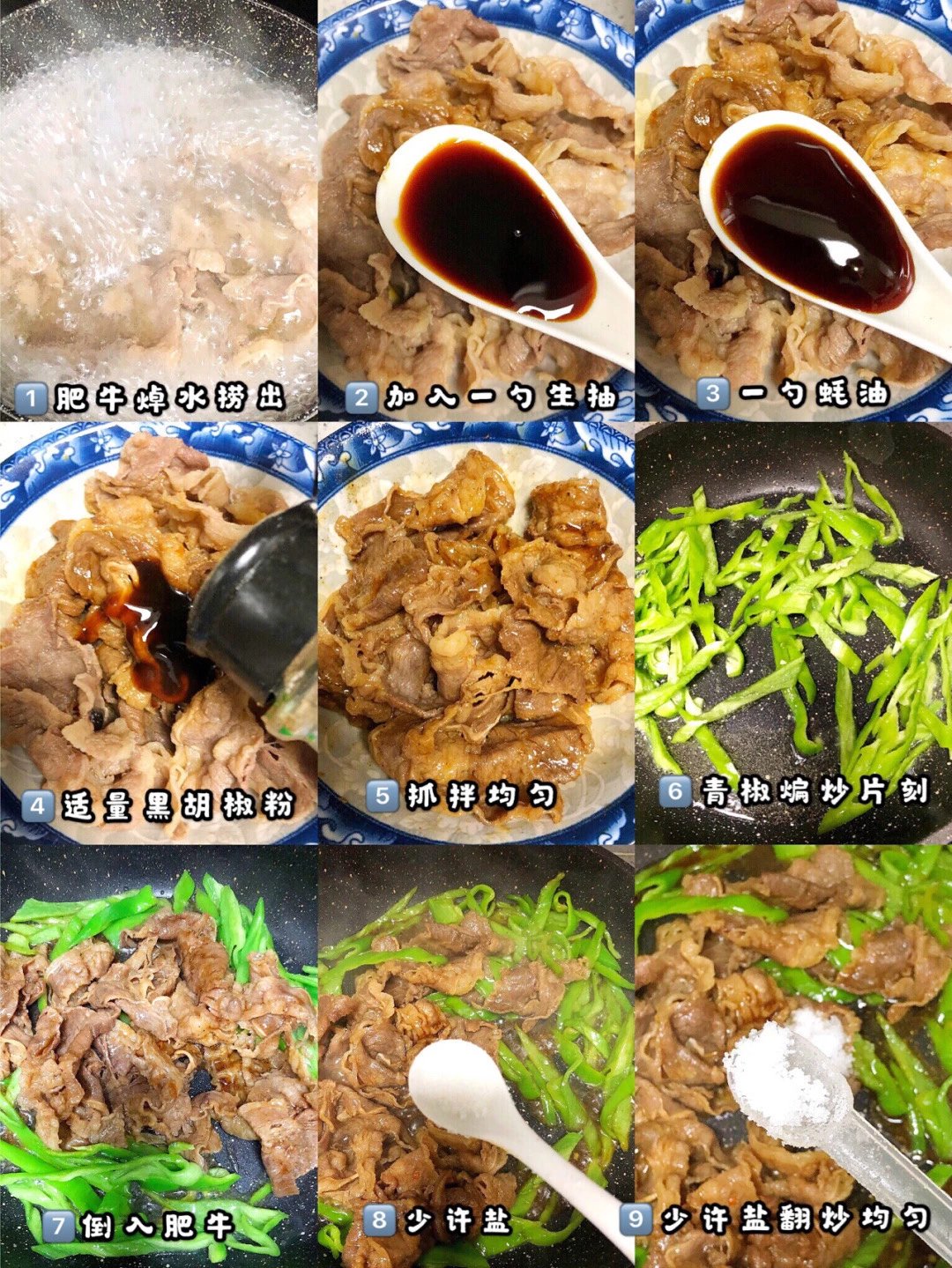 秘制巨下饭的青椒肥牛卷 好吃到舔盘 跟大家分享一道巨好吃的青椒肥牛卷,秘制酱汁搭配鲜嫩爽滑的肥牛,简直太好吃了! 【食材】肥牛、青椒、生抽、蚝油、黑胡椒粉少许、盐、白糖 1 肥牛焯水捞出,加1勺生抽、1勺蚝油和少许黑胡椒粉(如果想酱色深一些可以加少许老抽上色)抓拌均匀腌制5分钟 2 锅内起热油爆香青椒,加入肥牛卷 少许盐和白糖翻炒均匀完成!