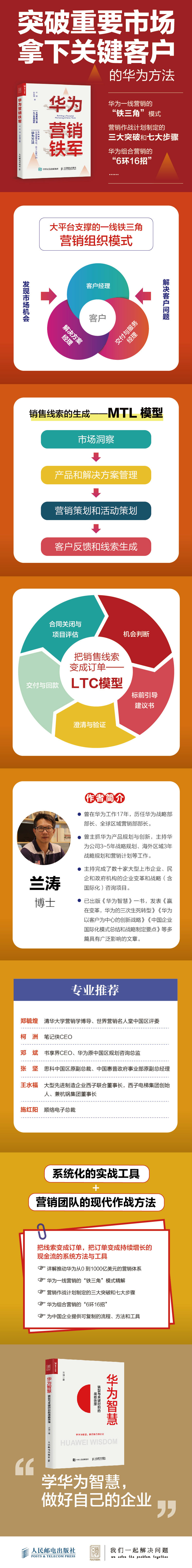 从to B业务到to C和to b(中小企业)业务的转型,从国内业务到海外业务的拓展,华为的营销团队发挥了重要作用,一路支持着华为从2万元起家,发展到年营收千亿美元。华为在实战中总结和验证的营销策略与队伍建设方法,值得其他企业学习和借鉴。