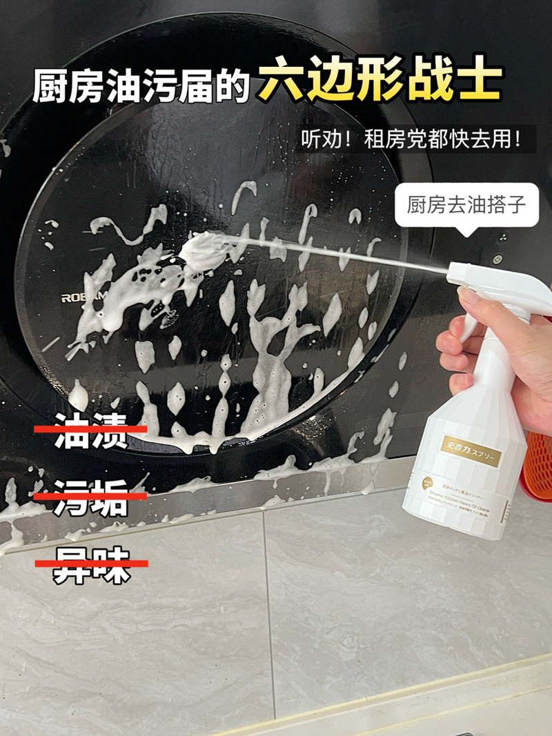 在日本非常受推崇!果真日本主妇打扫有窍门!花最少的力气,做最彻底的清洁!喷出来就是泡泡,附着力强,指哪打哪!超方便,都不用二次清洗,一喷一擦,免过水!厨房轻松焕然一新!
