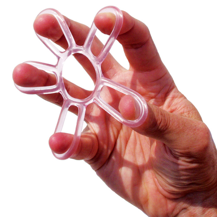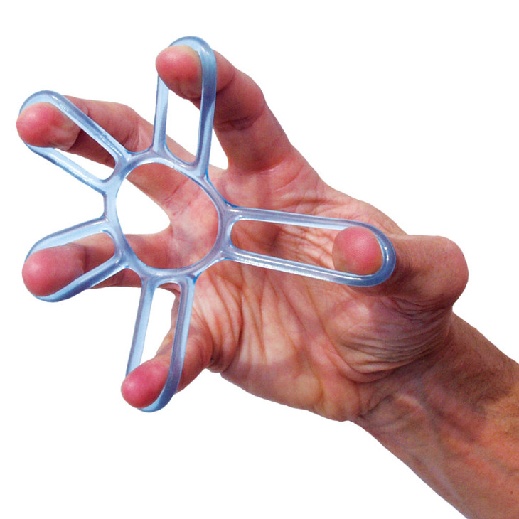 将练习器套在5指上,慢慢的、尽可能的向外伸展打开5指,然后再放松复原、重复练习。