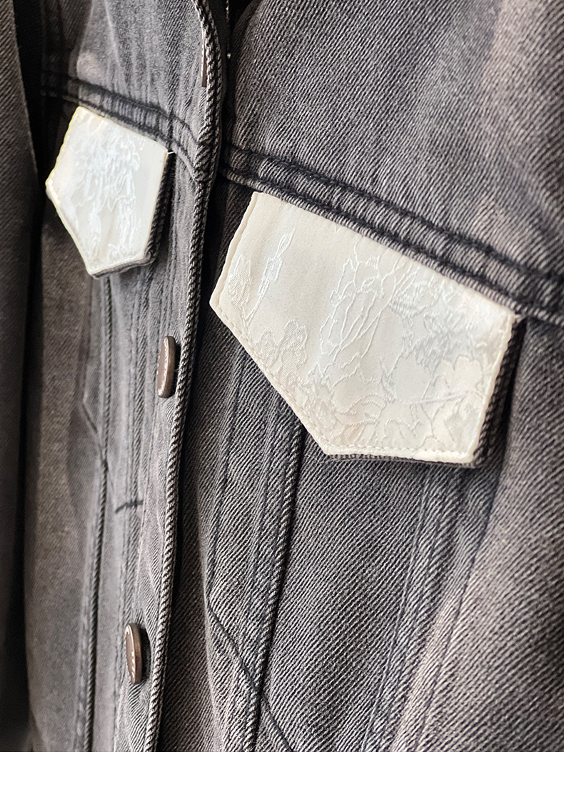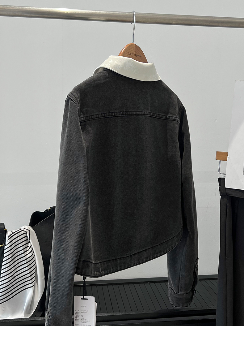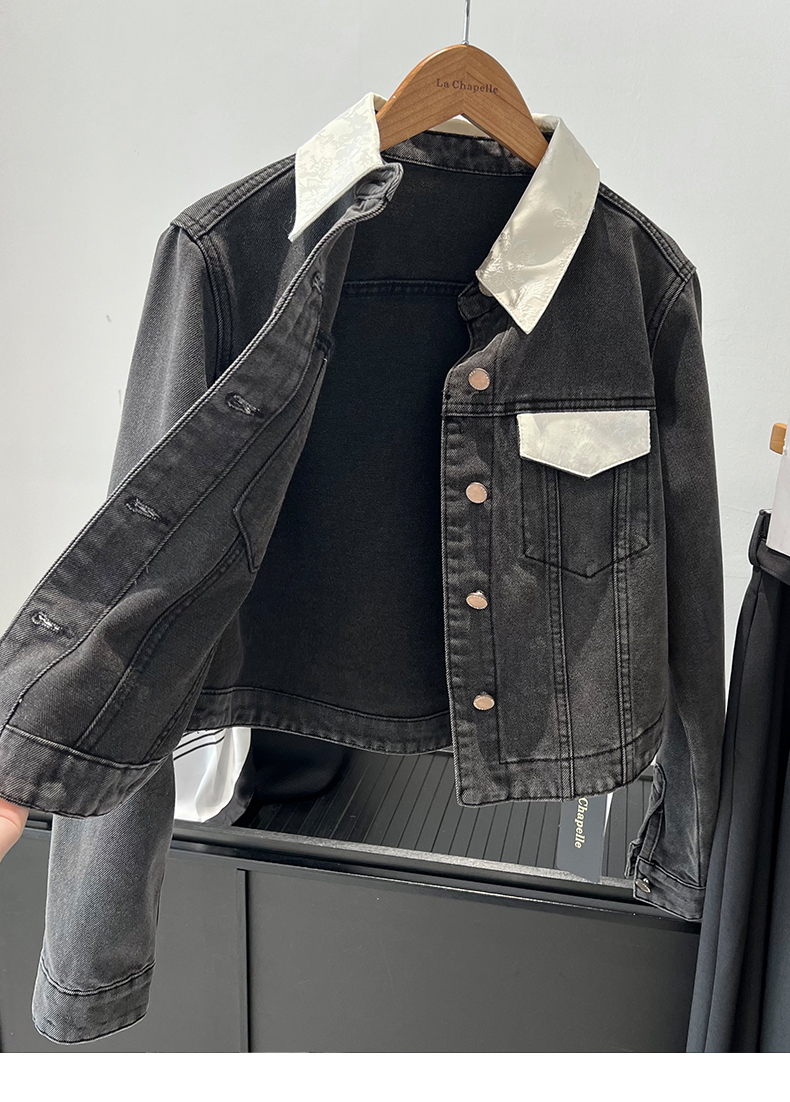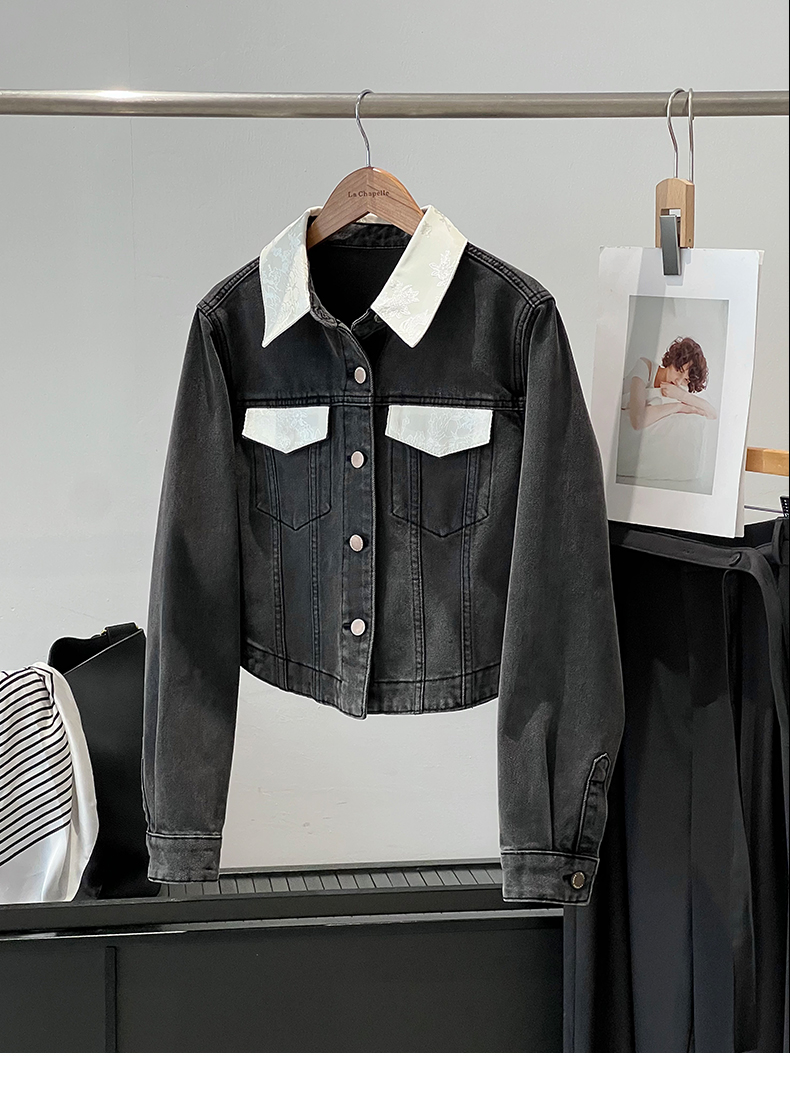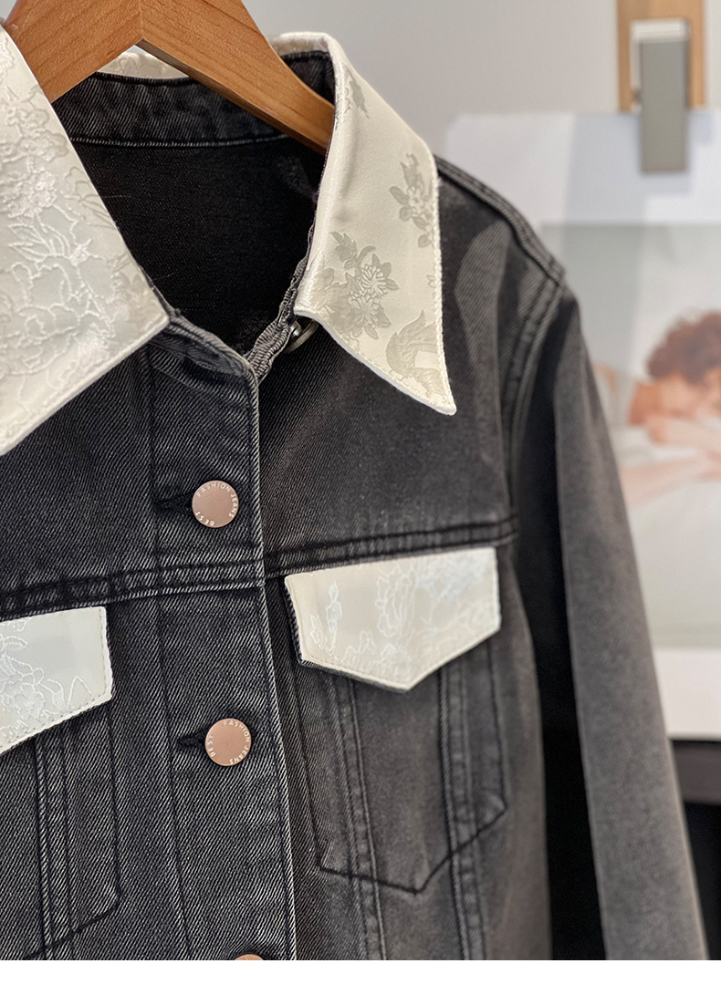 会员福利【精美刺绣牛仔】拉夏贝尔/La Chapelle高级感国风提花刺绣设计感牛仔外套撞色翻领夹克短外套
