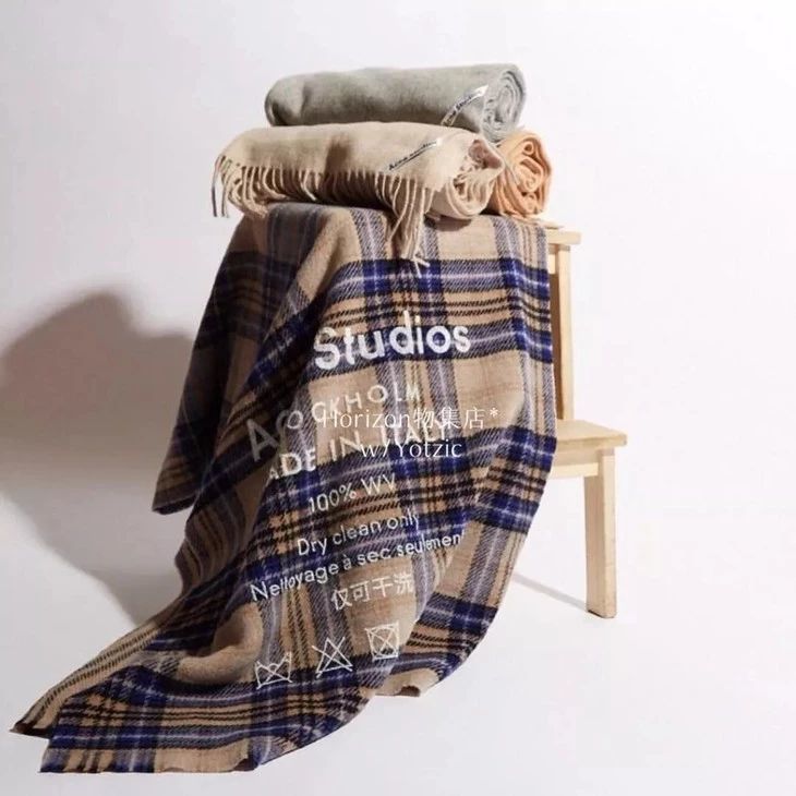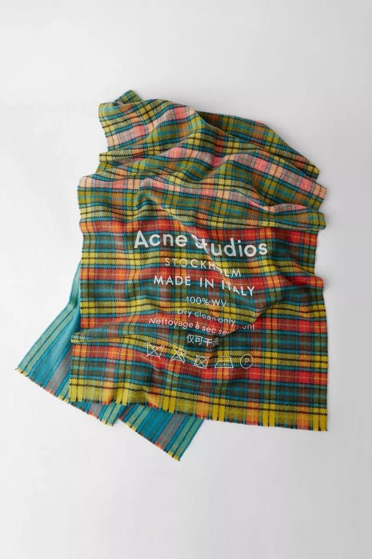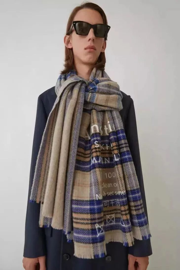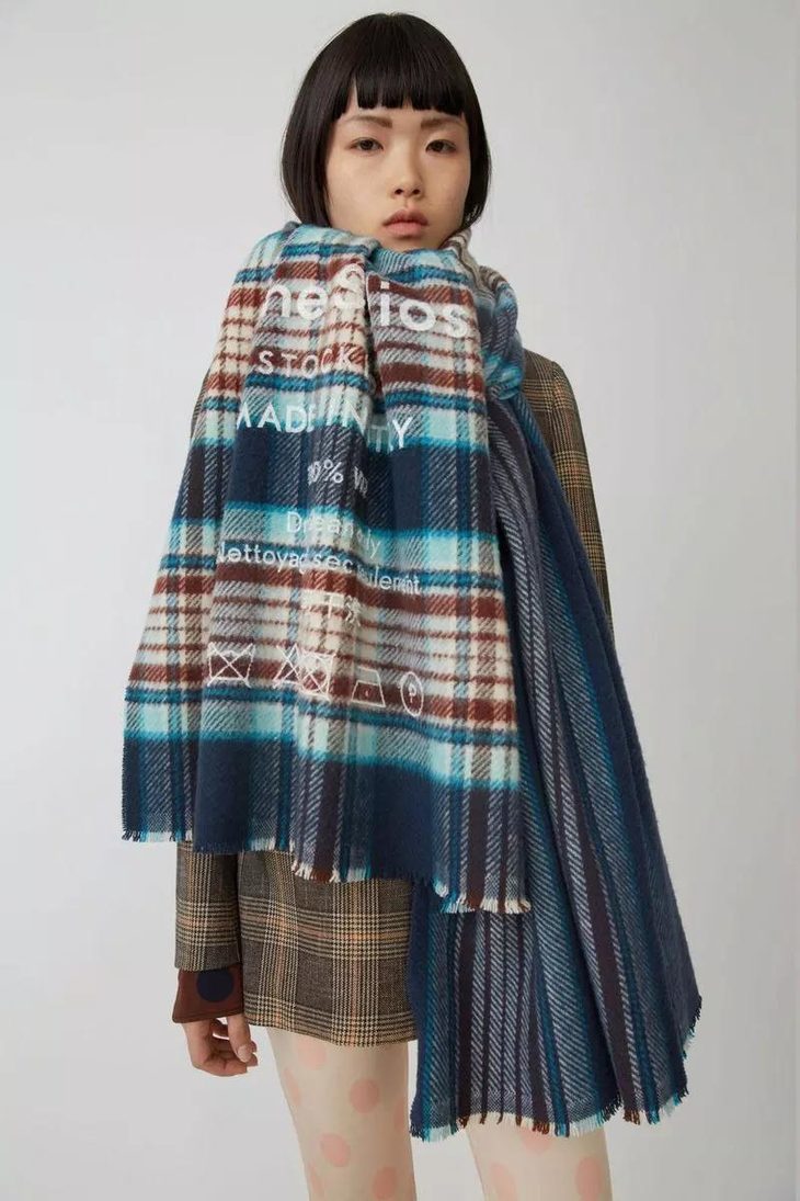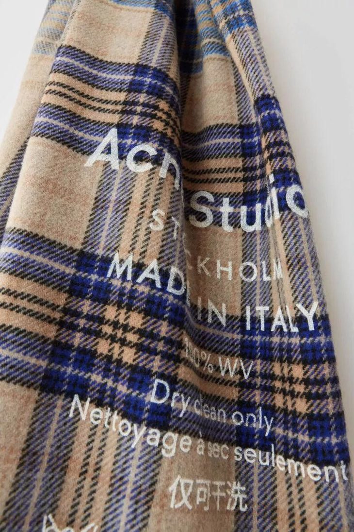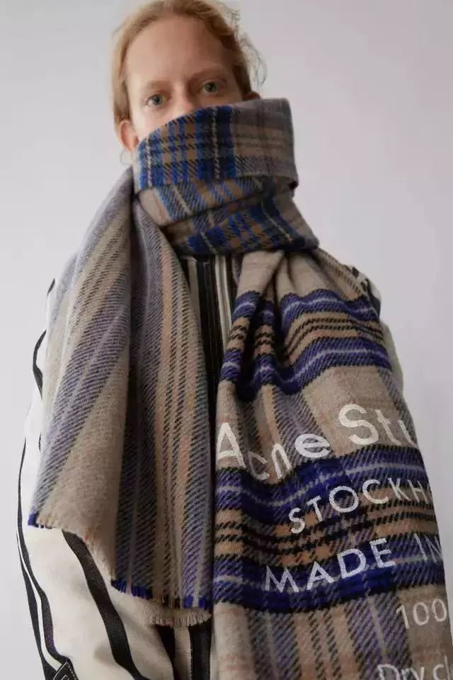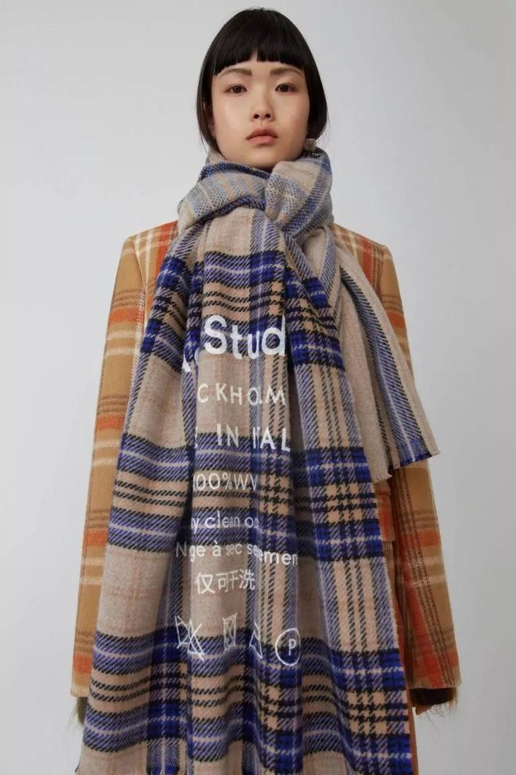 Acne Studios 18FW,今年的配色历年最好看,无法割舍,必爆单品,Cassiar Check 格纹超大围巾印有品牌标识,特别将成分标VAER LABEL 放大成为设计的一部分~