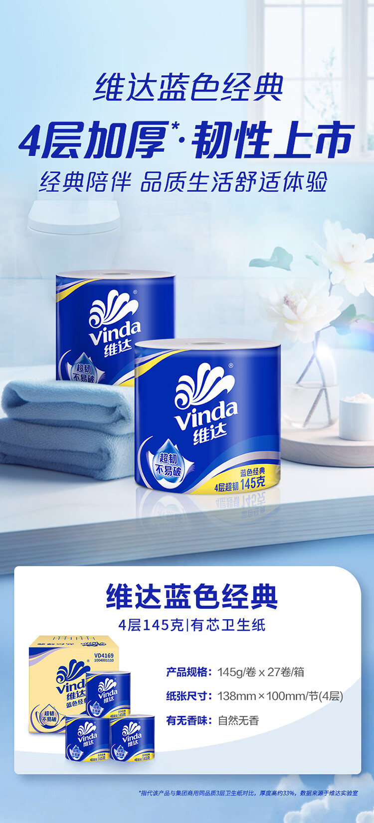 维达145g 4层蓝色经典有芯卷筒纸 27卷/箱VD4169