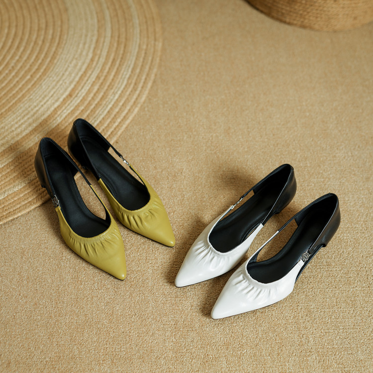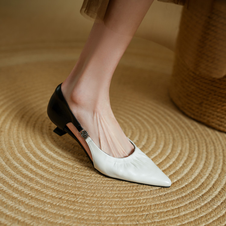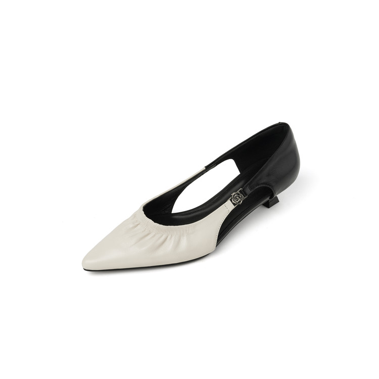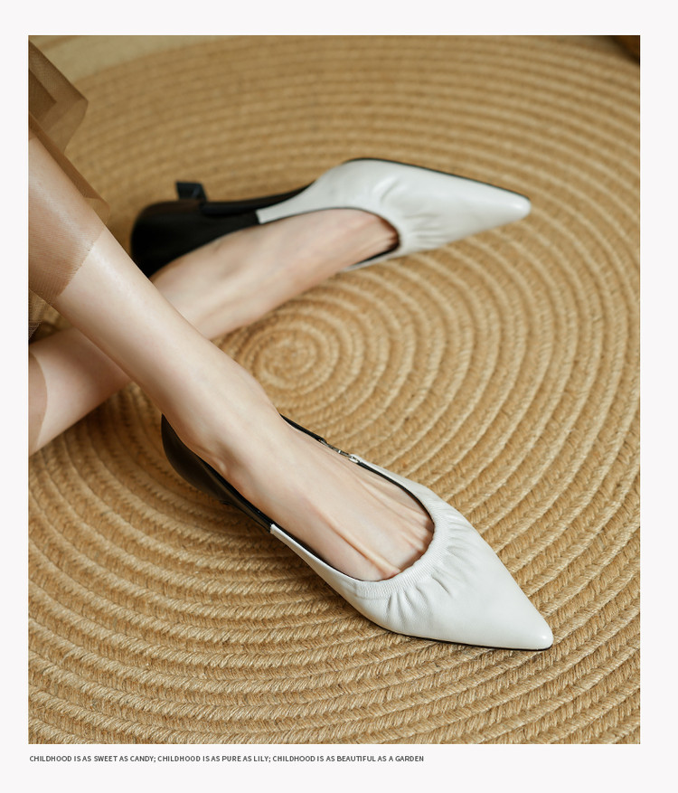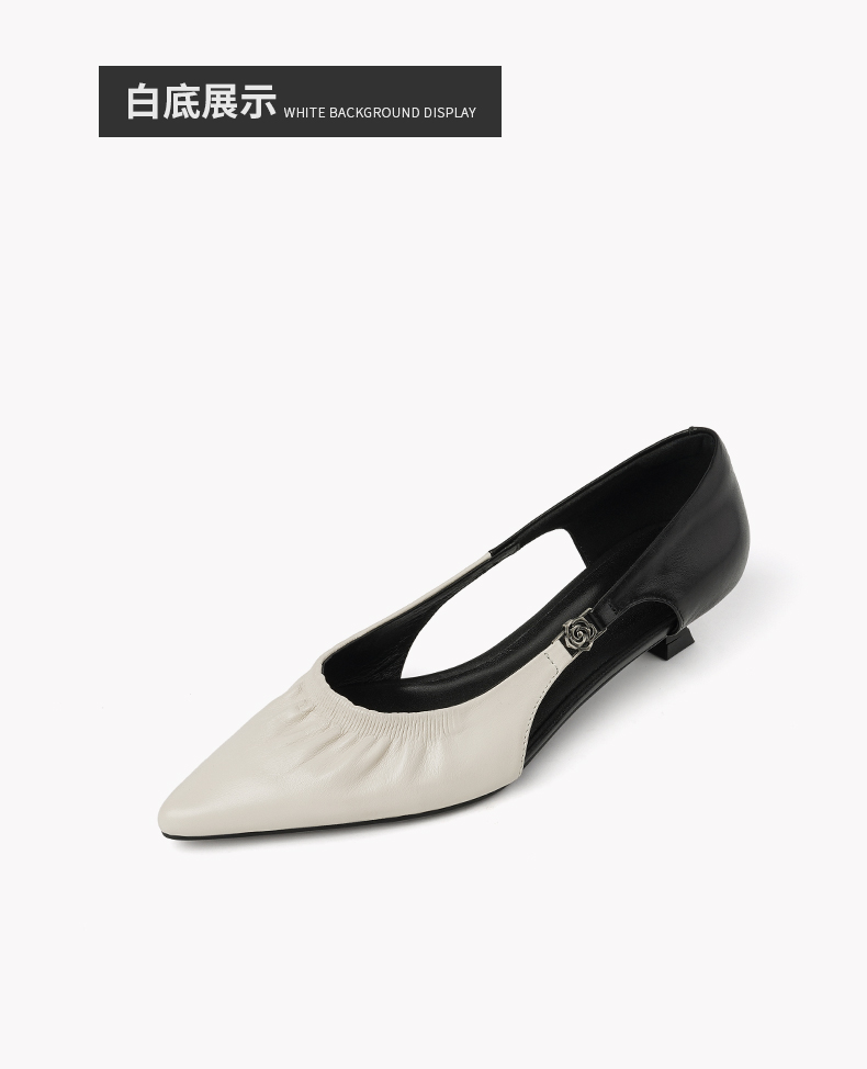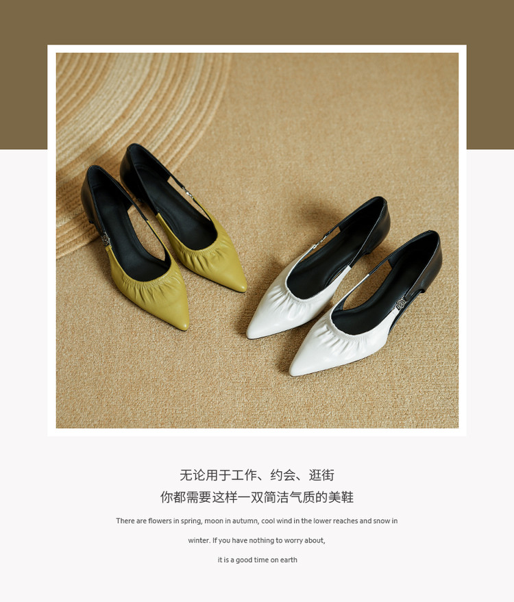 【预售5天】头层牛皮猫跟尖头镂空褶皱口单鞋韩版气质低跟鞋女PS&PS3120
