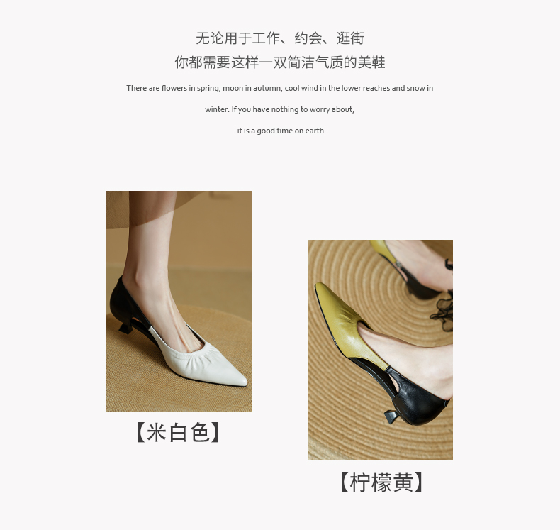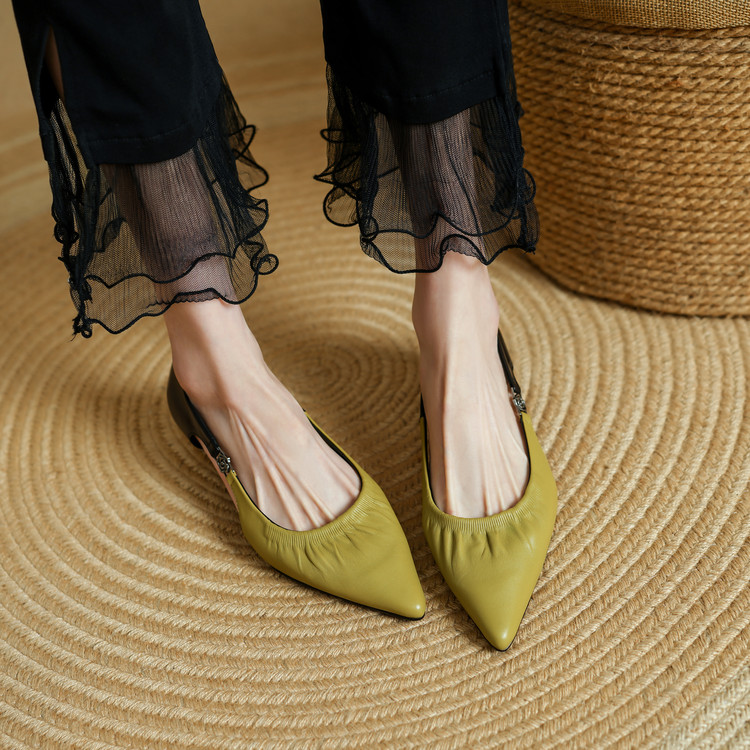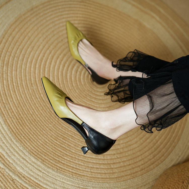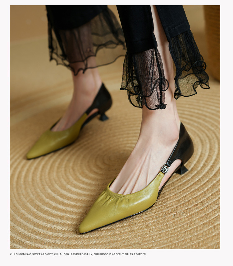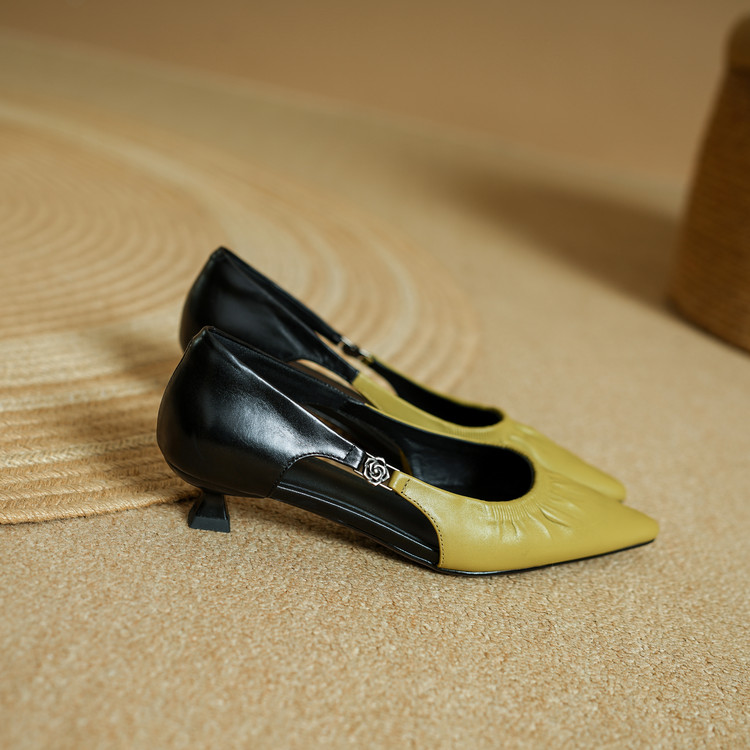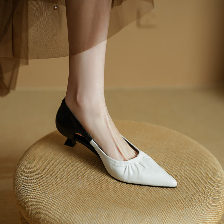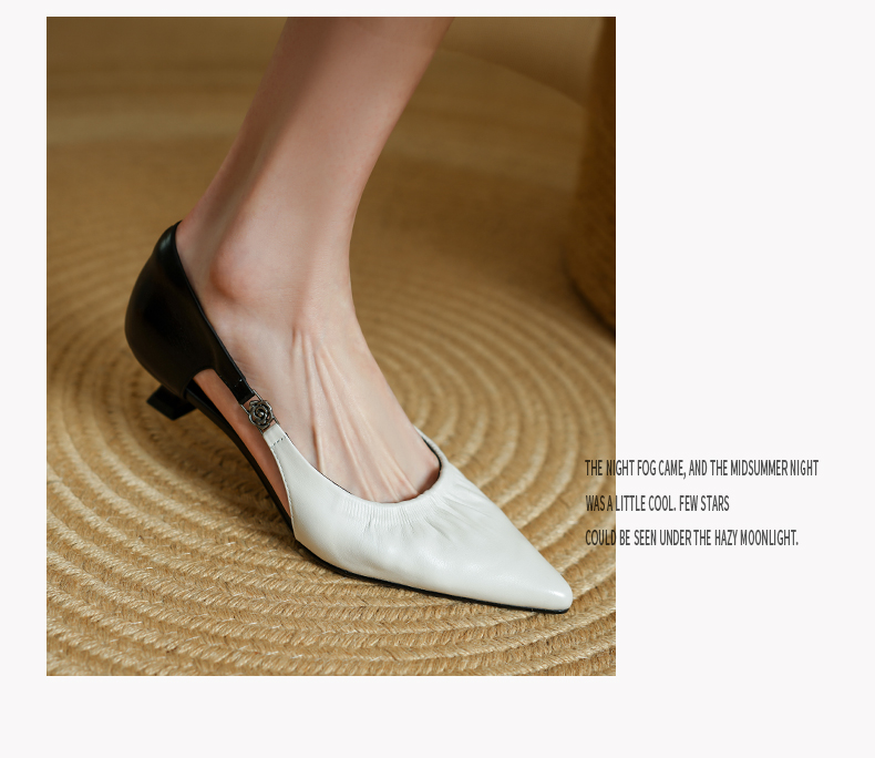 【预售5天】头层牛皮猫跟尖头镂空褶皱口单鞋韩版气质低跟鞋女PS&PS3120