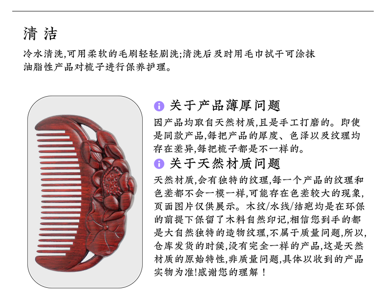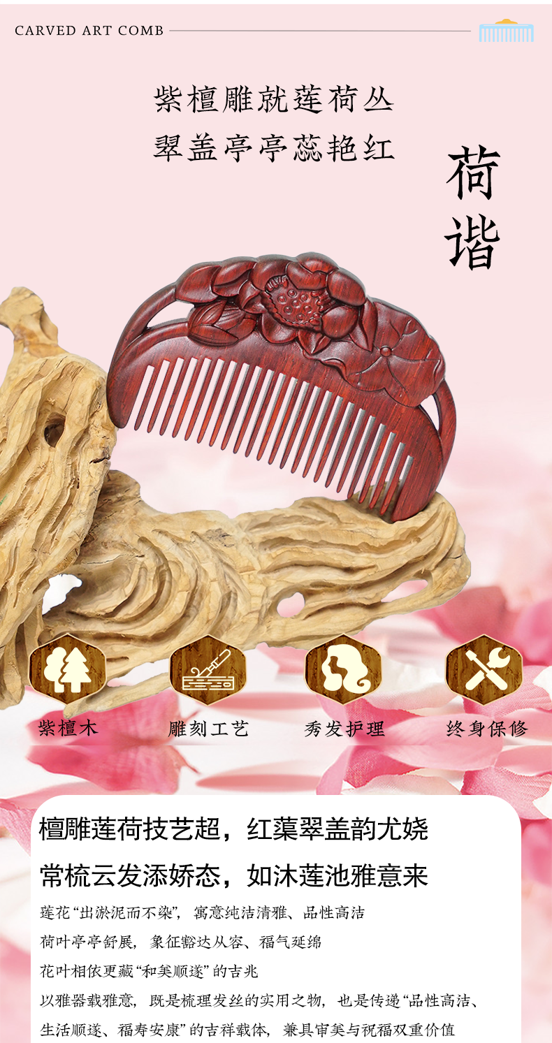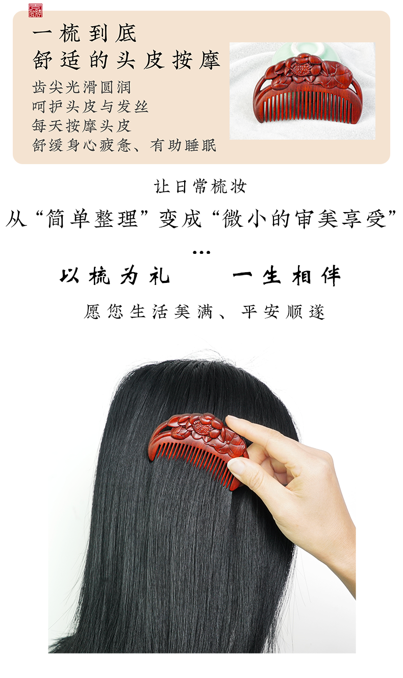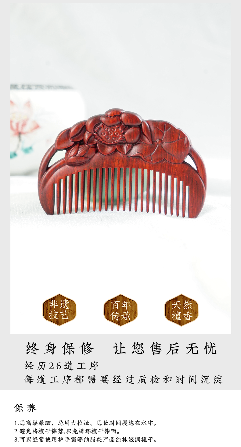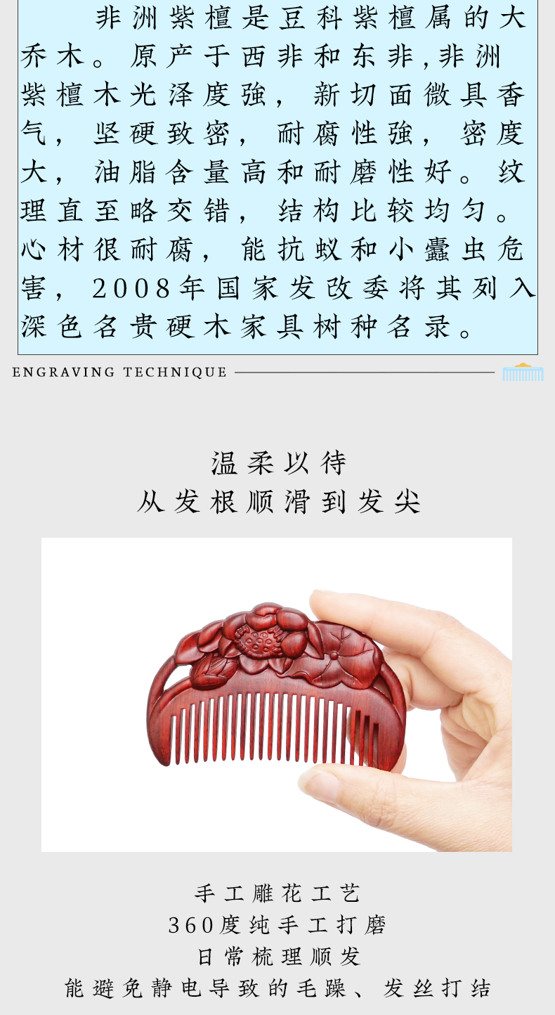 周广胜天然紫檀木雕花梳子古风盘发梳礼盒装小巧便携顺发护发蓬发