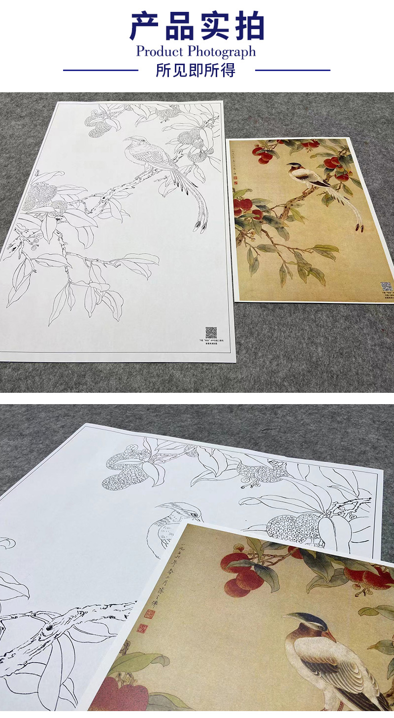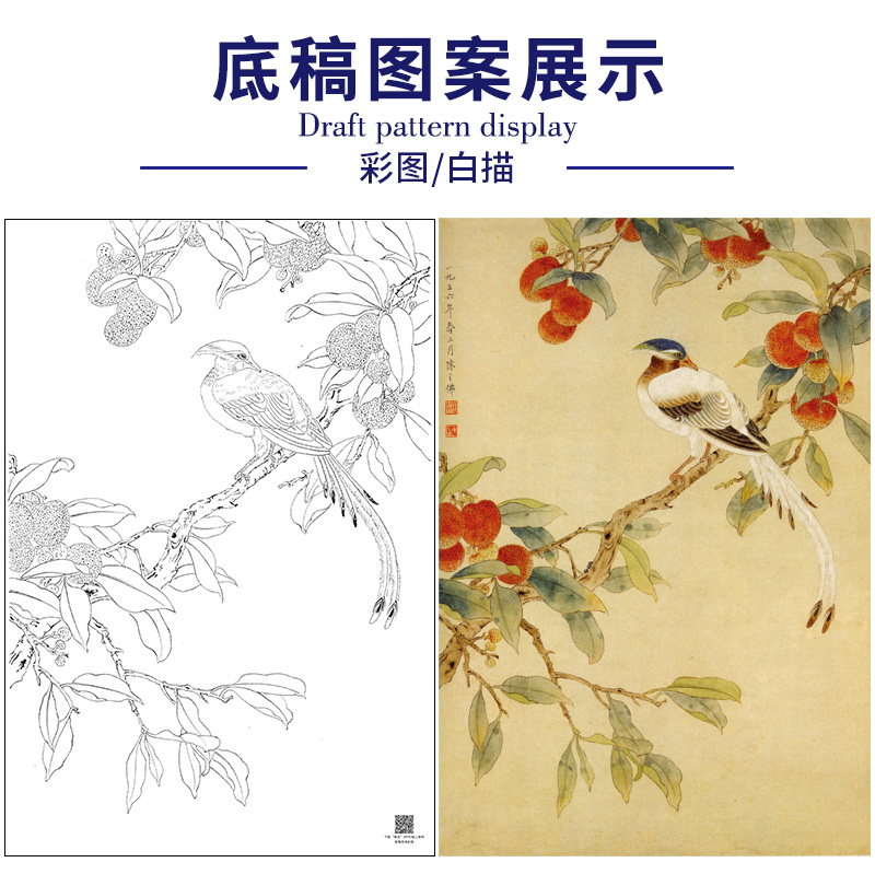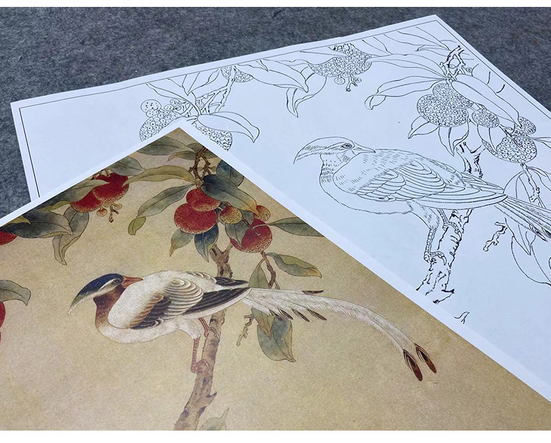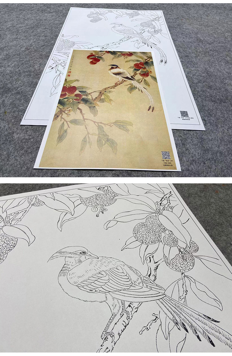 陈之佛工笔花鸟白描底稿《荔枝绶带》-斗方小品册页-多种白描尺寸可选-QA53