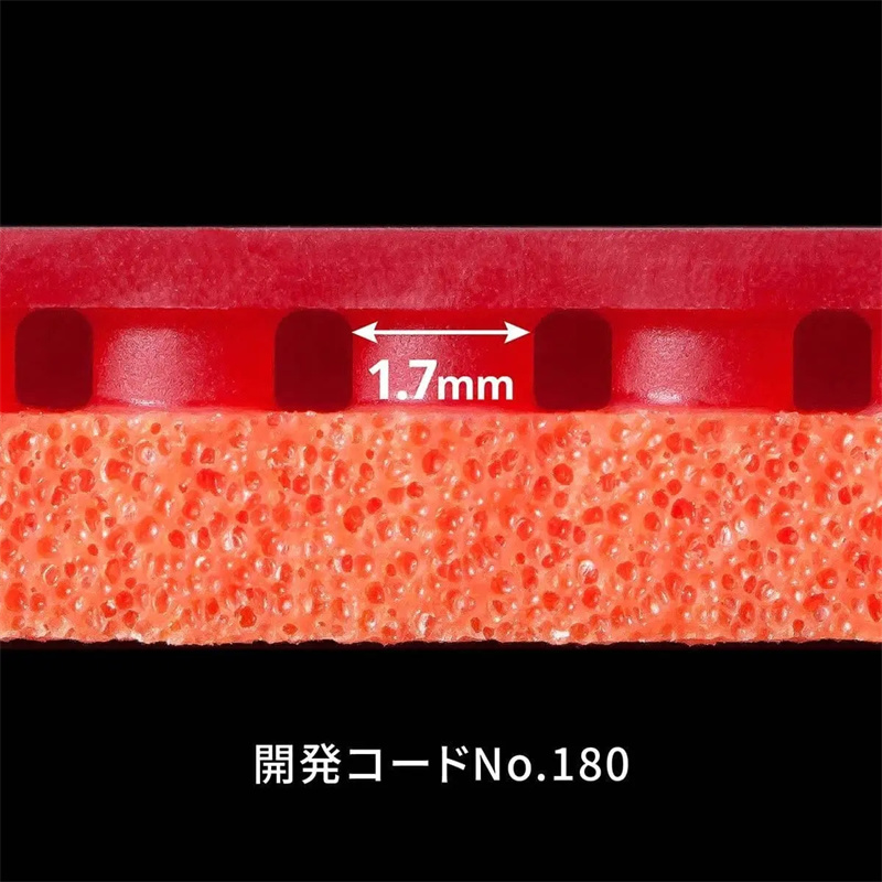 TENERGY-64,具有很好的速度性。胶粒直径1.7MM,胶粒高度高,胶粒间隔大。(速度13.5,旋转10.5,硬度36)