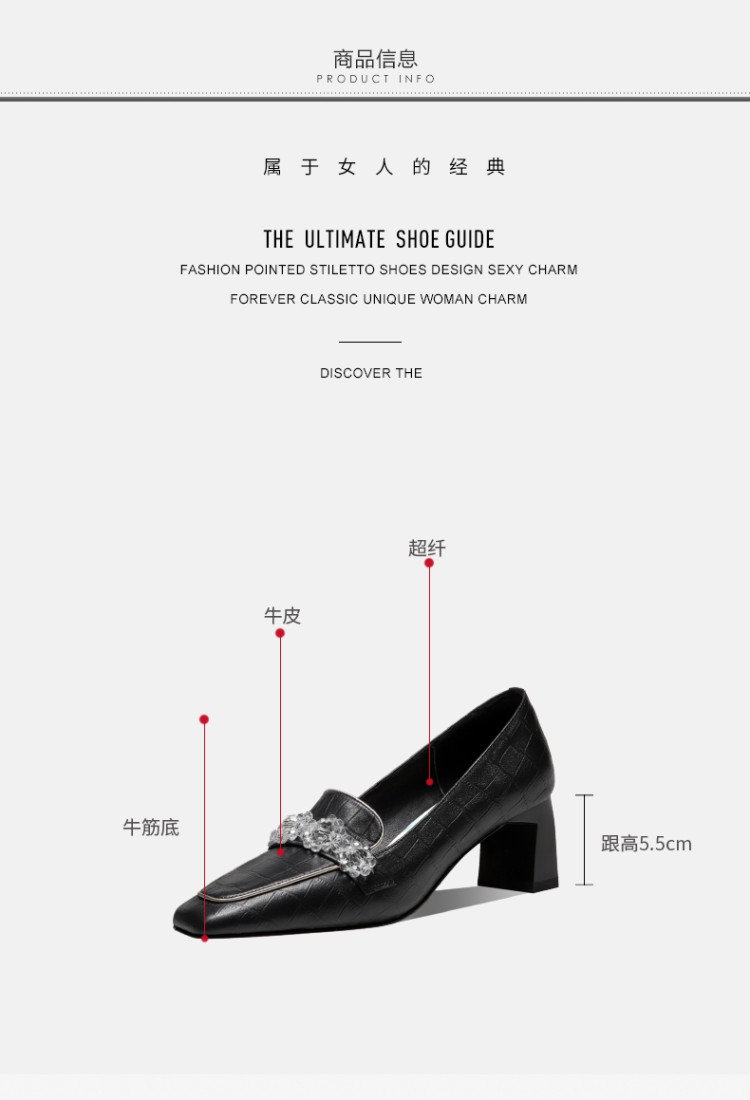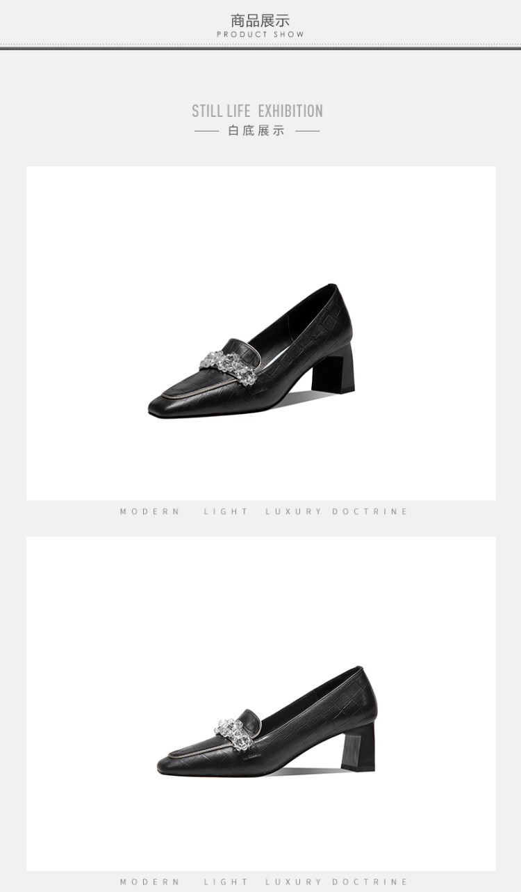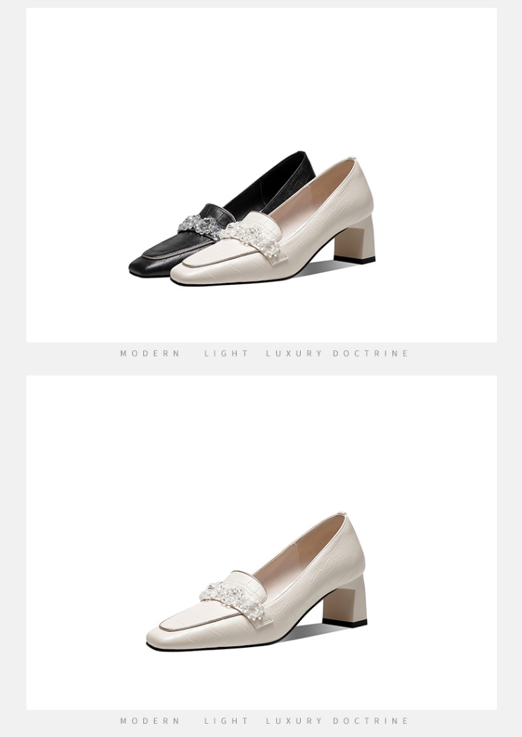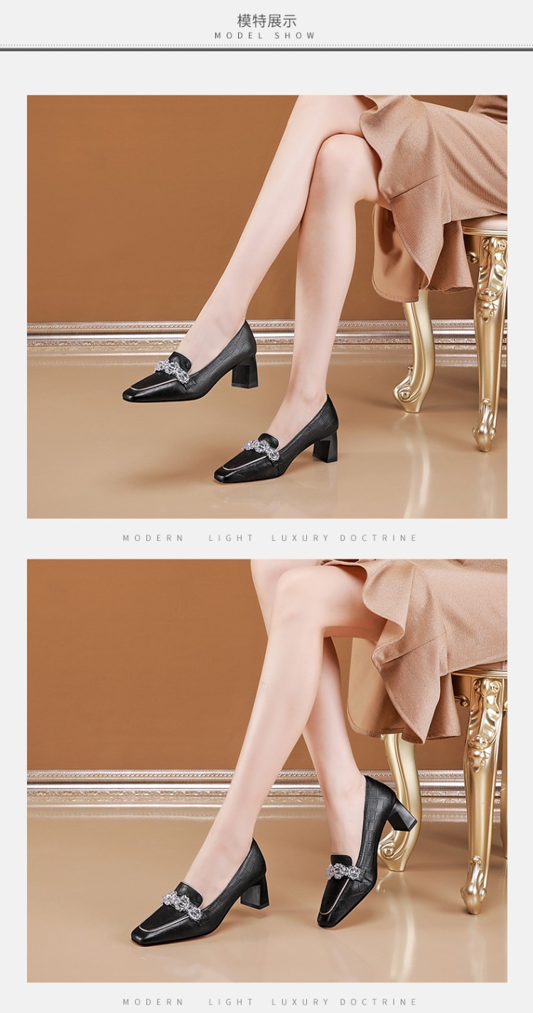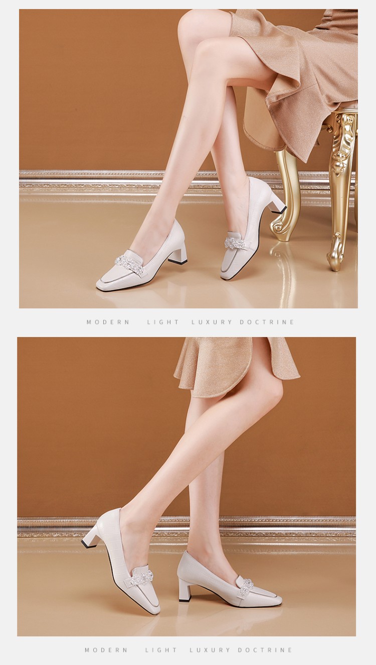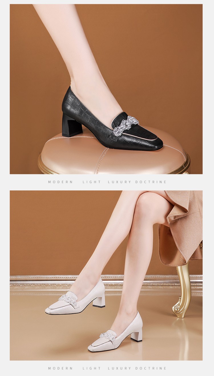 秋季粗跟方头深口单鞋女大码黑色米白色中跟女鞋 GLS146