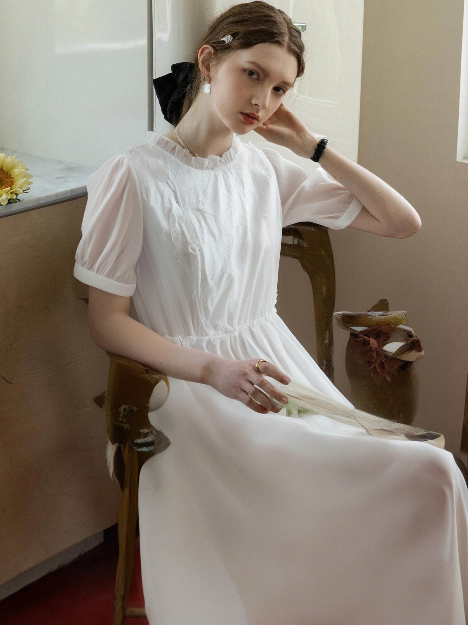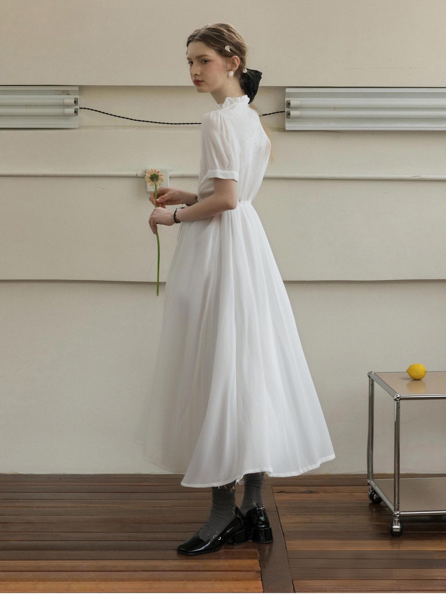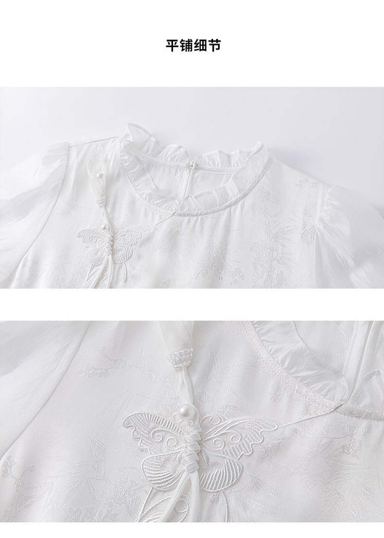 会员福利【莱赛尔+刺绣提花】拉夏贝尔/La Chapelle原299+花边立领提花新中式短袖中长款连衣裙夏季