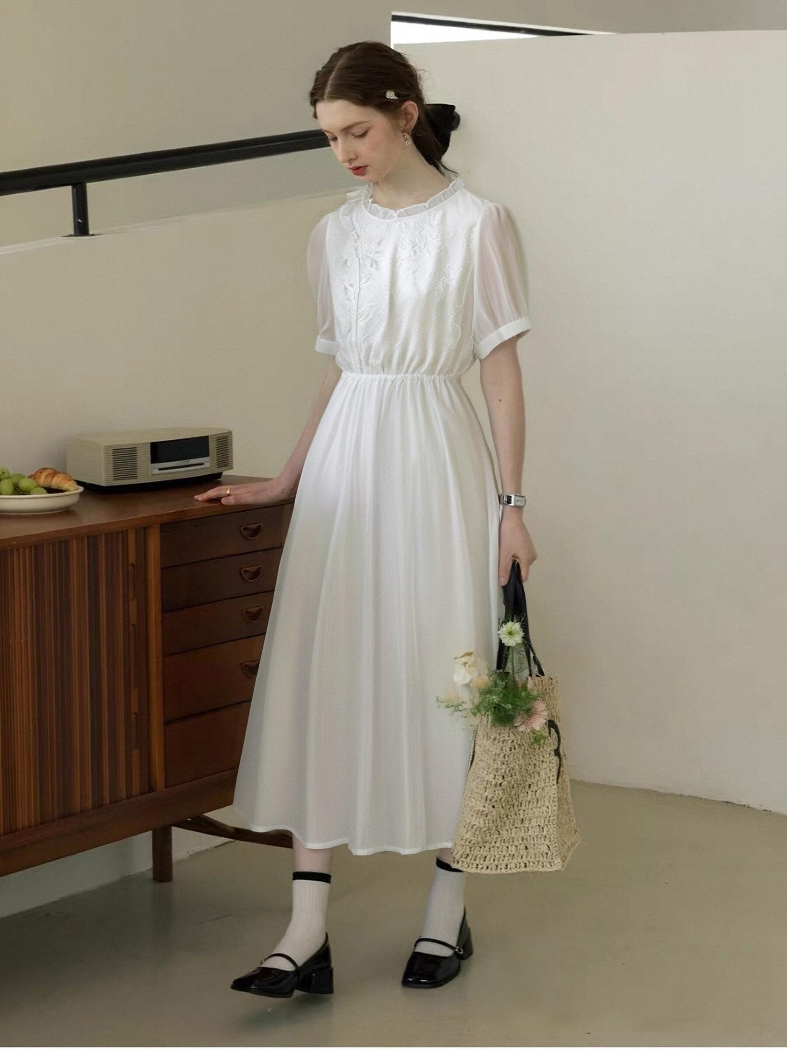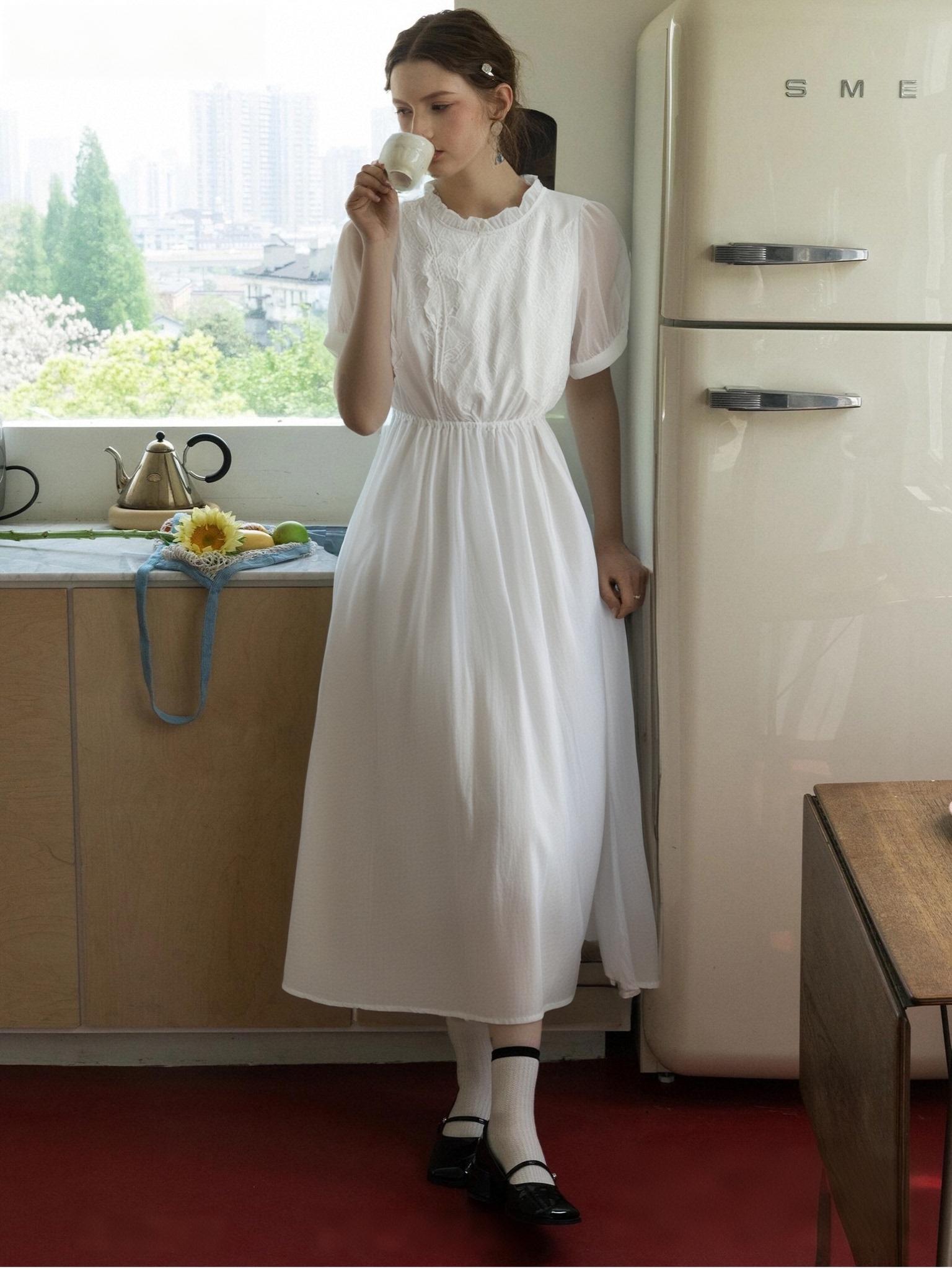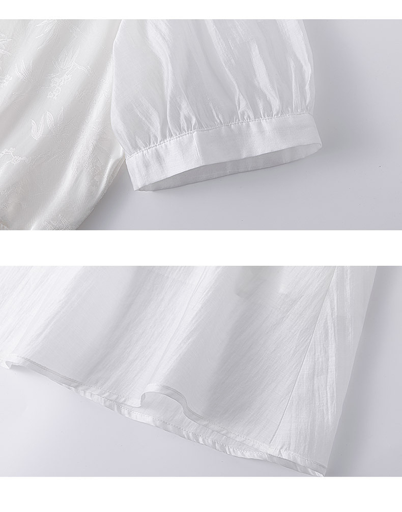 会员福利【莱赛尔+刺绣提花】拉夏贝尔/La Chapelle原299+花边立领提花新中式短袖中长款连衣裙夏季