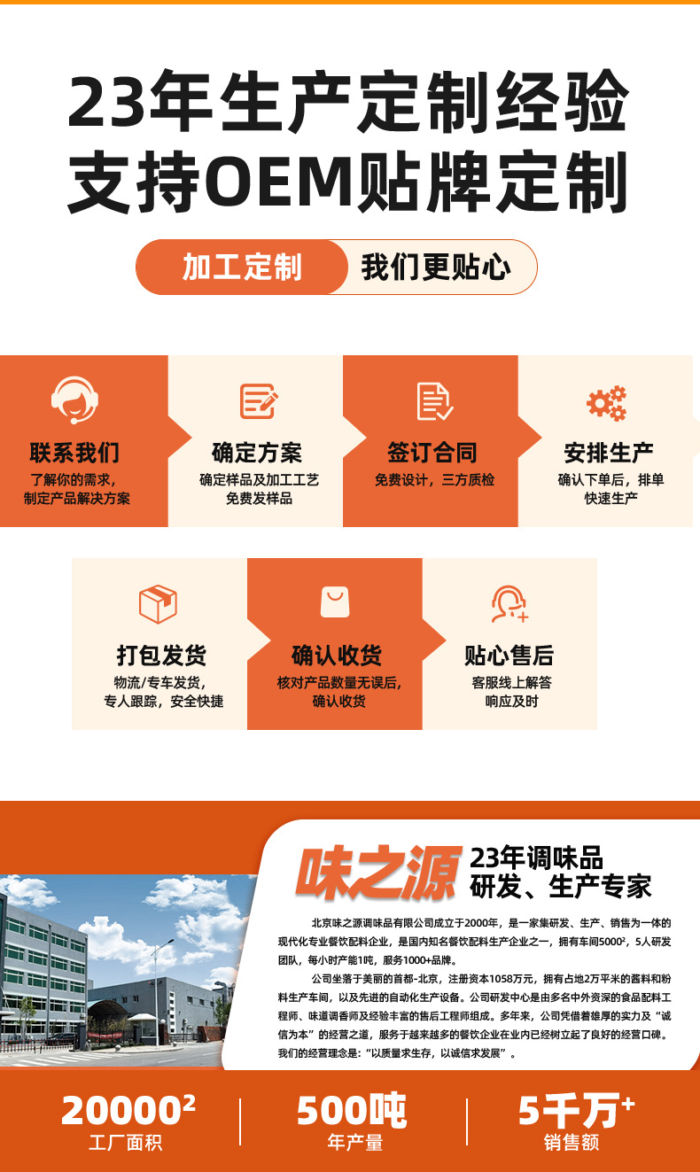 北京味之源调味品有限公司成立于2000年,是一家集研发、生产、销售为一体的现代化专业食品配料企业,是国内知名食品配料行业生产企业之一。公司坐落于美丽的首都-北京,注册资本1058万元,拥有占地2万平米
