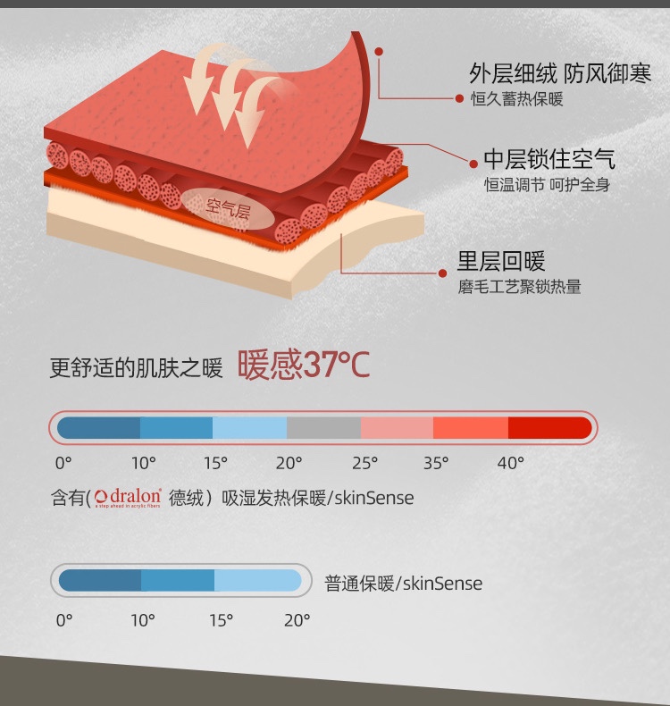 必须说下面料,这一款采用德绒纤维, 是真真正正从德国拜耳出品的德绒!带有合格证书和德绒专用吊卡(可以去国家监督管理局官网查询)!不是挂羊头卖狗肉的化纤混纺货!!只要是穿过一次德绒材质的保暖衣,其他的秋衣秋裤直接压箱底不解释~