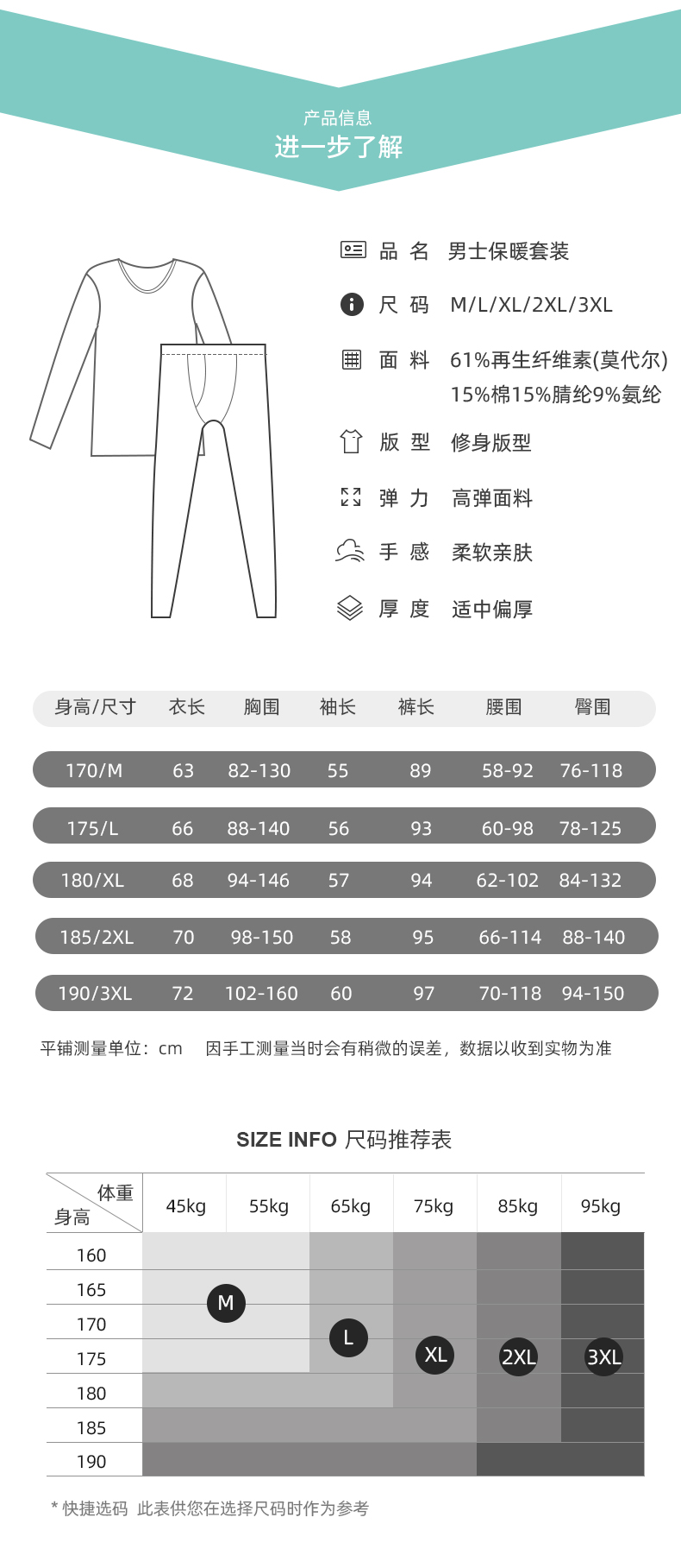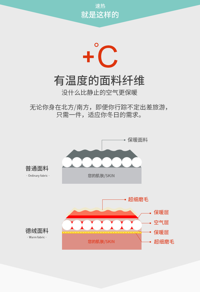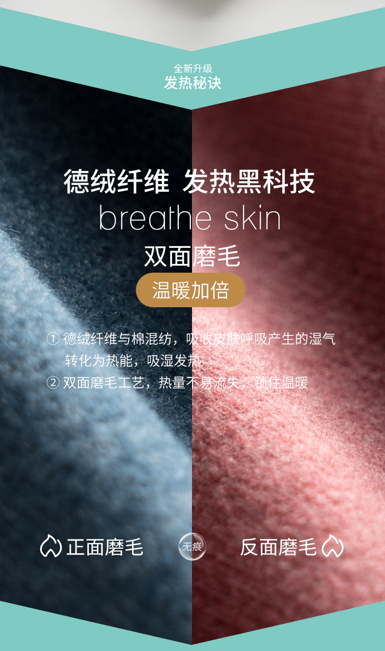 采用双面磨毛,自发热黑科技真的太舒服了!我按人头安利!他比普通的棉更柔软蓬松,吸湿性好,不褪色不起球,不起静电!贴身暖肤还不紧绷,让你穿的薄而有型却能暖到心田!