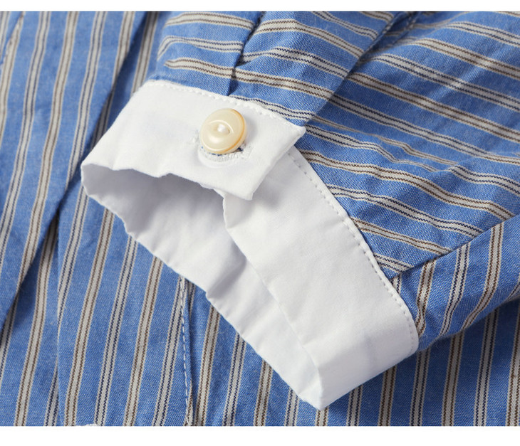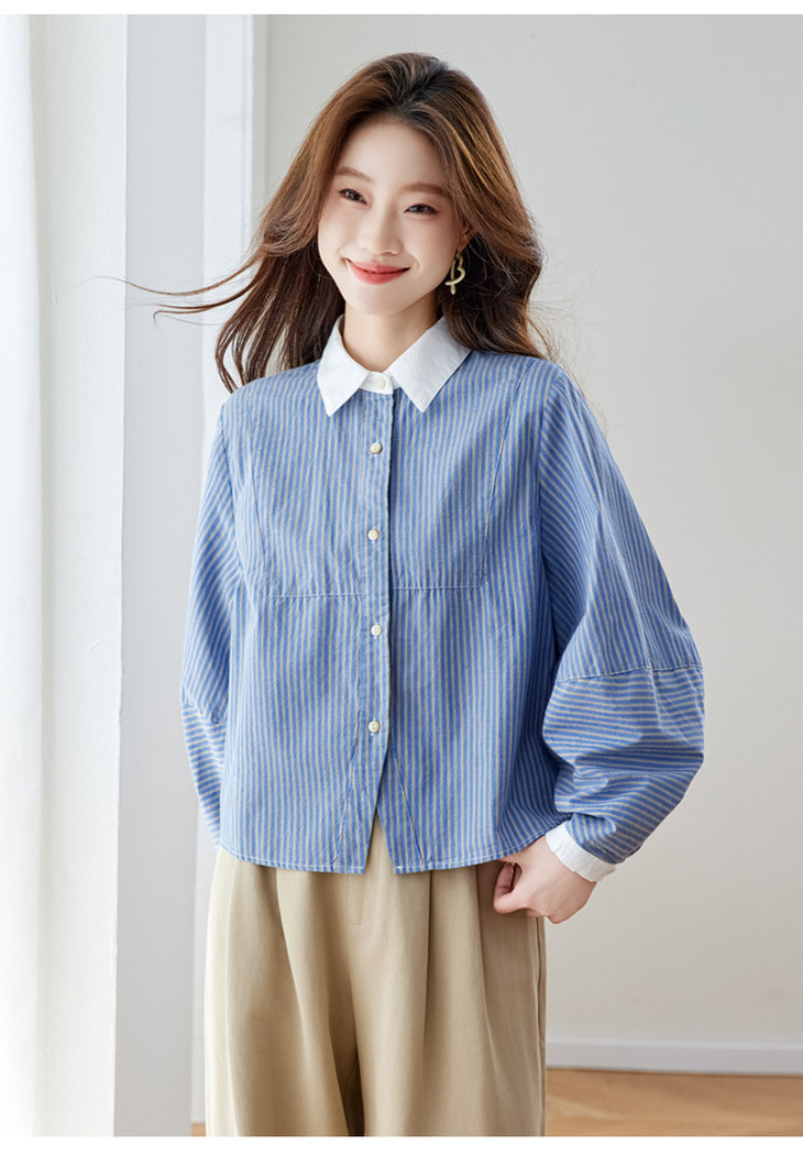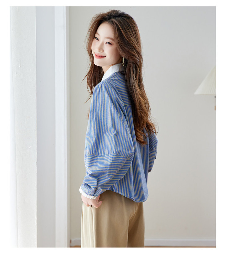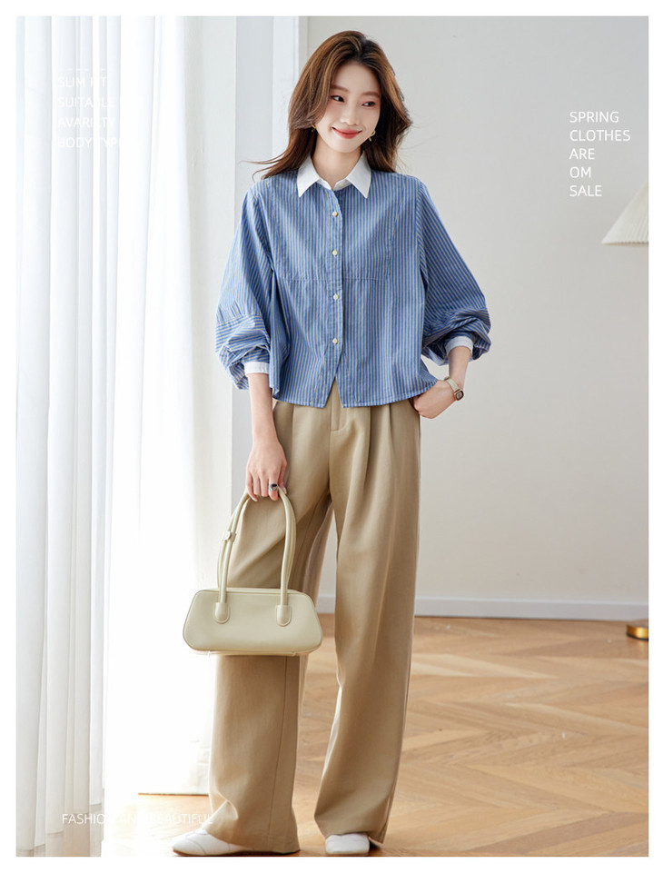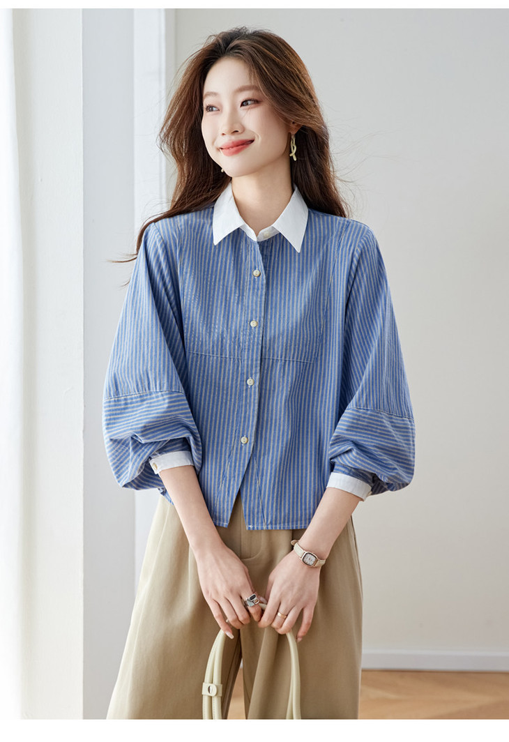高级感撞色翻领蓝白条纹衬衫,宽松气质叠穿通勤穿搭上衣CC-QL-6228