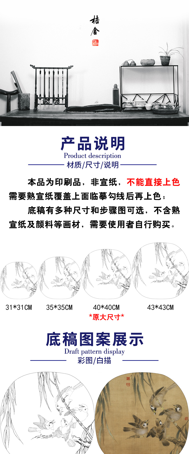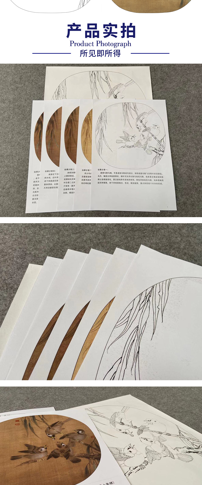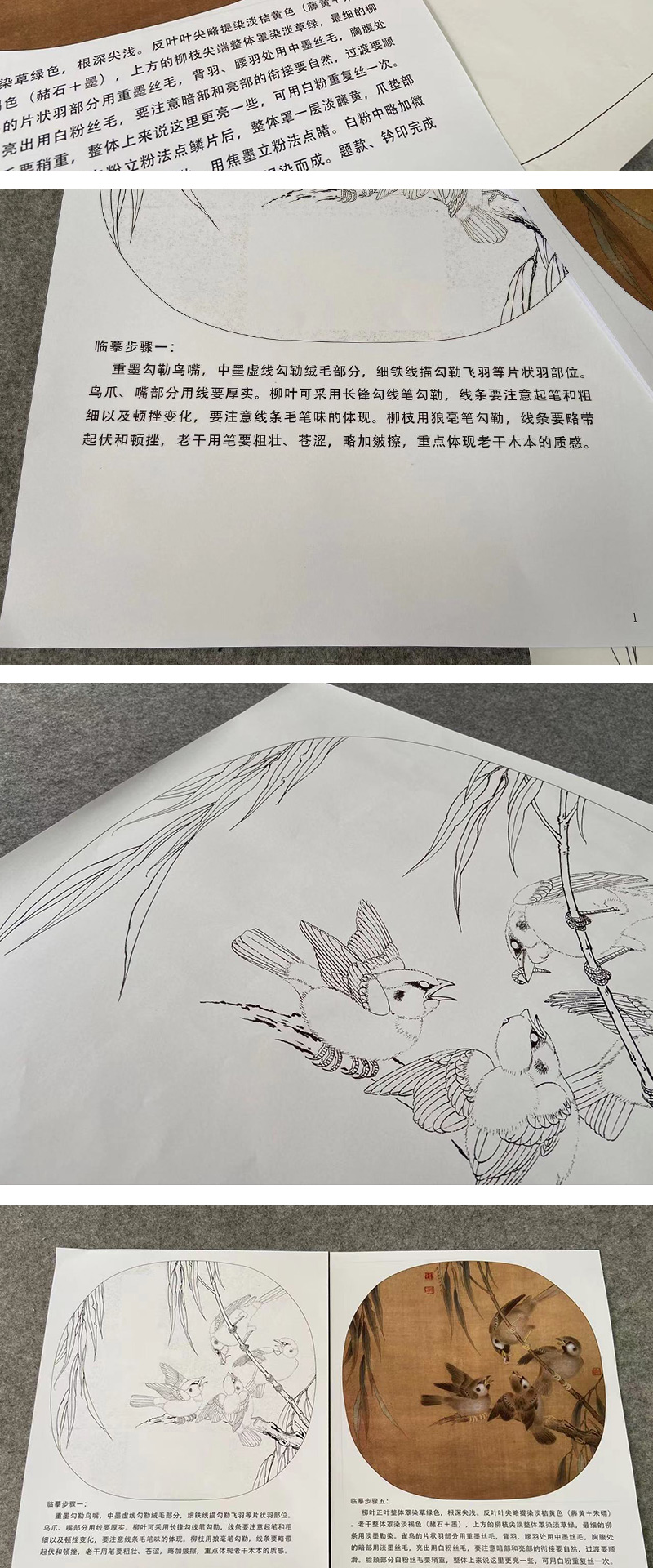 【有步骤、大彩图】李晓明工笔画白描底稿圆形小品《临宋杨柳乳雀图》柳叶雀鸟初学者临摹花鸟线稿KC12