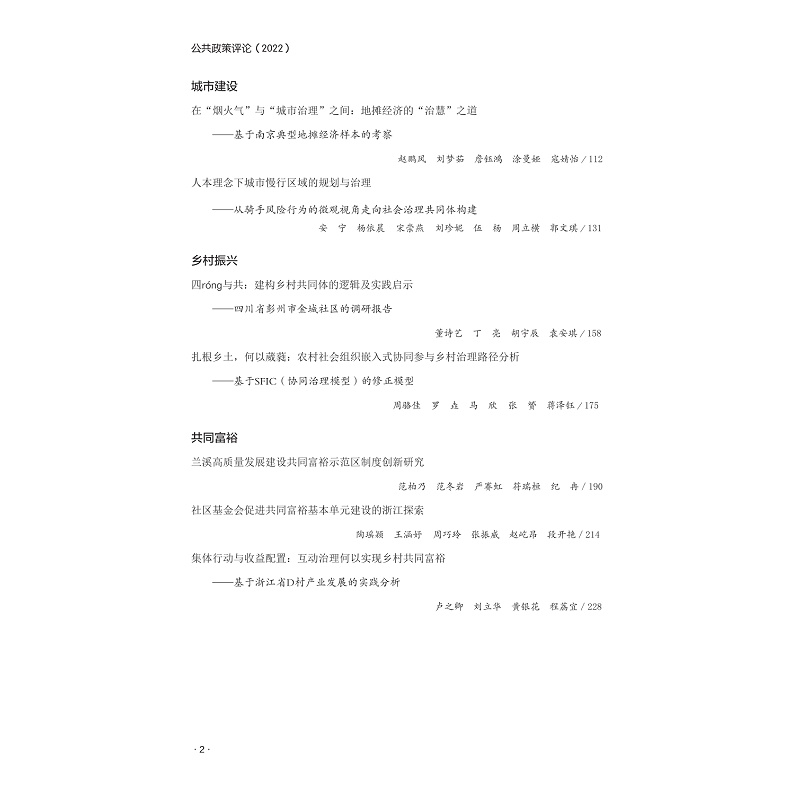 《公共政策评论》是浙江省公共政策研究院、浙江大学公共政策研究院不定期汇编出版的一种探讨公共政策理论与实践的学术文集,致力于为所有有志于国内外公共政策研究的人士构建平等的高层次学术交流平台。本文集以当今国内外公共政策重大理论与实践问题为研究和讨论核心,追求科学性和学术性,研讨理论,注重实践。以“经世致用,天下为公”为宗旨,聚焦国内外经济、社会等公共政策领域的前沿问题研究。《公共政策评论(2022)》对2022年国内外公共政策、政府治理、社会治理、经济发展,以及国际关系等问题进行了研究。